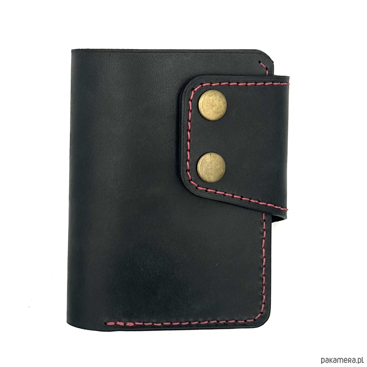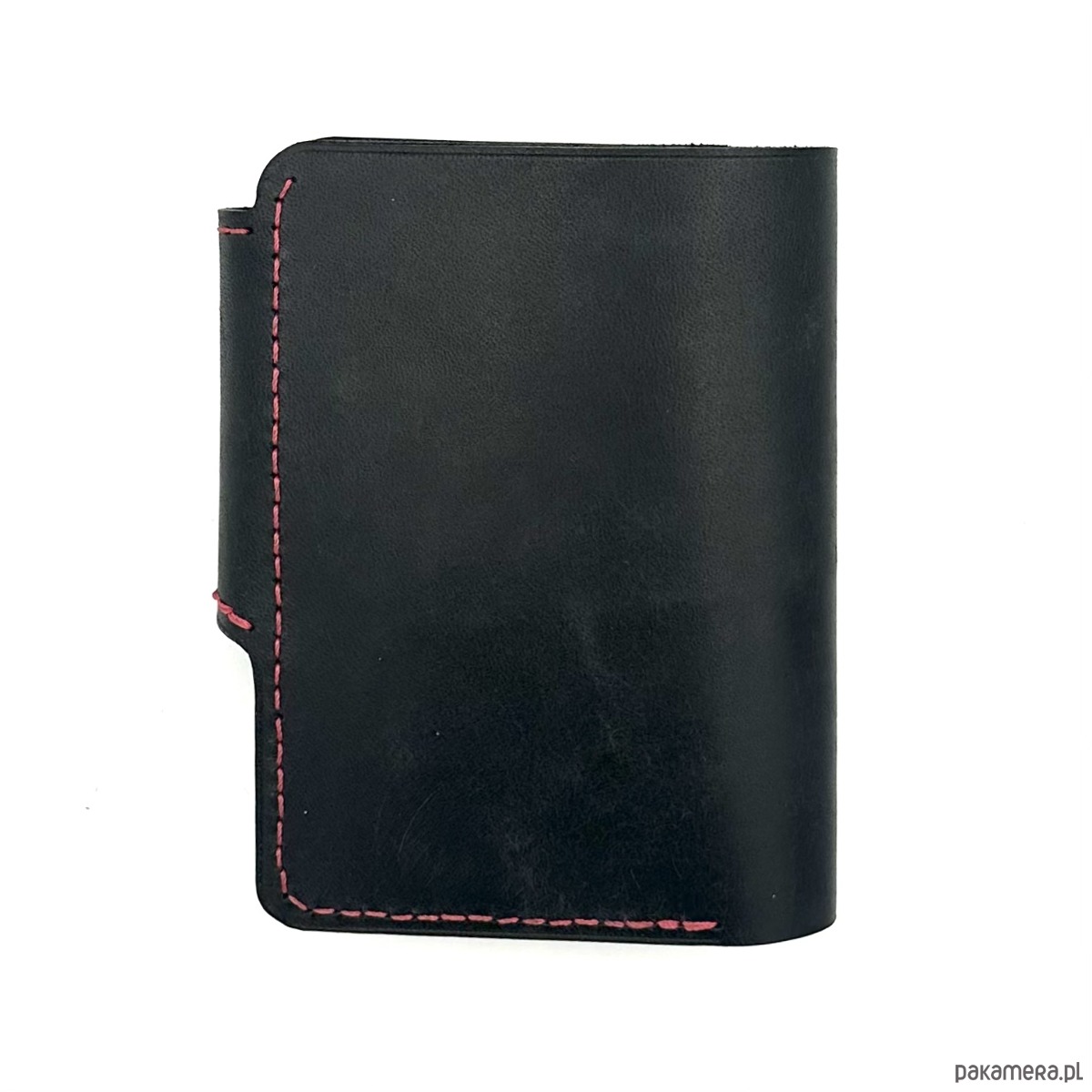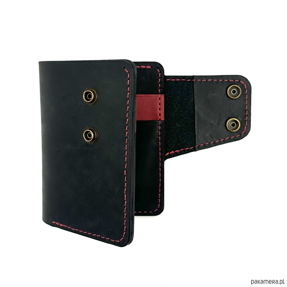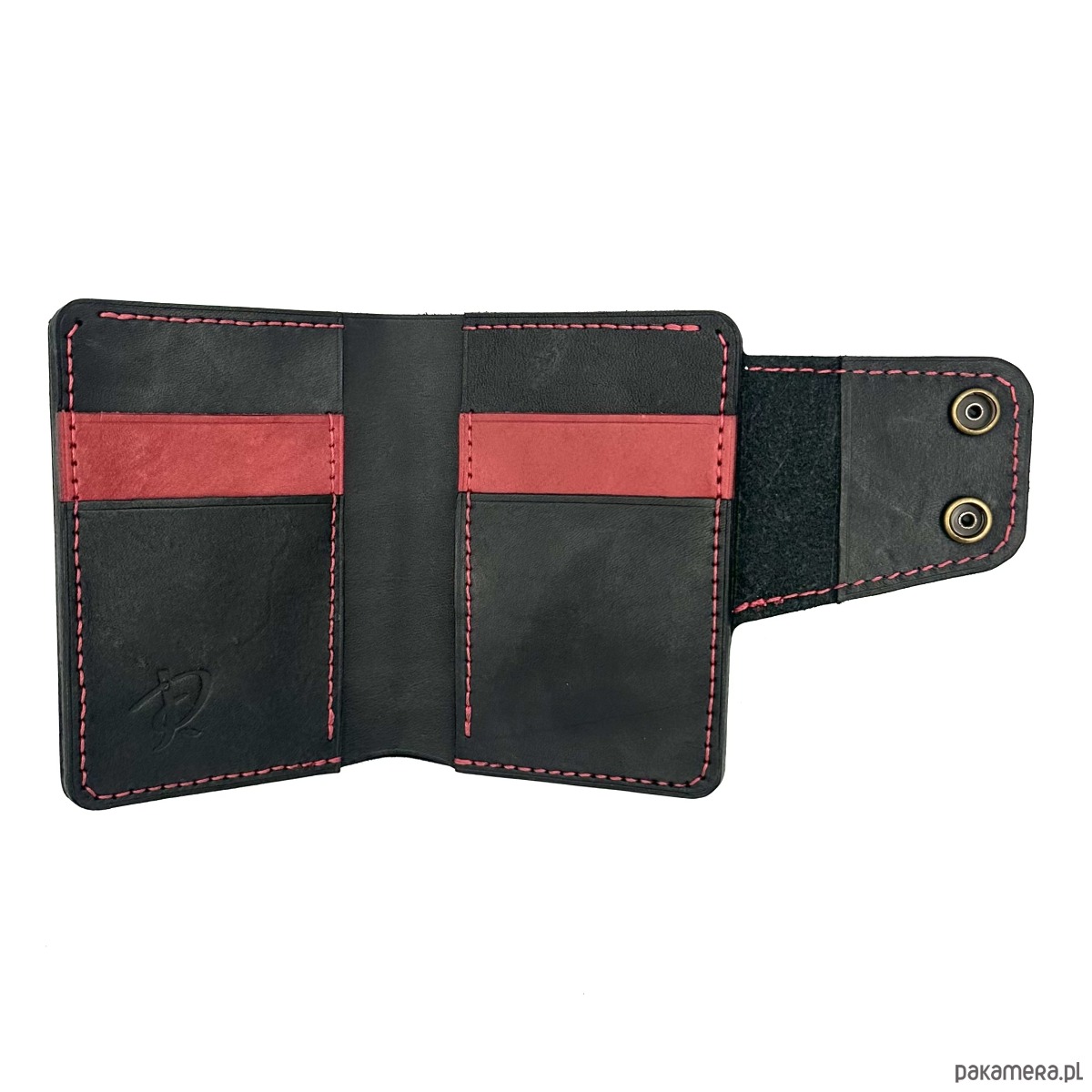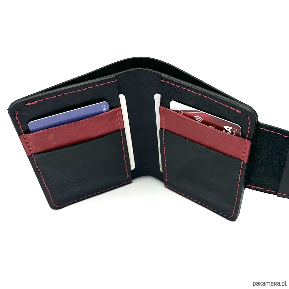 Duży czarny portfel z dodatkiem czerwieni ręcznie uszyty ze skóry.