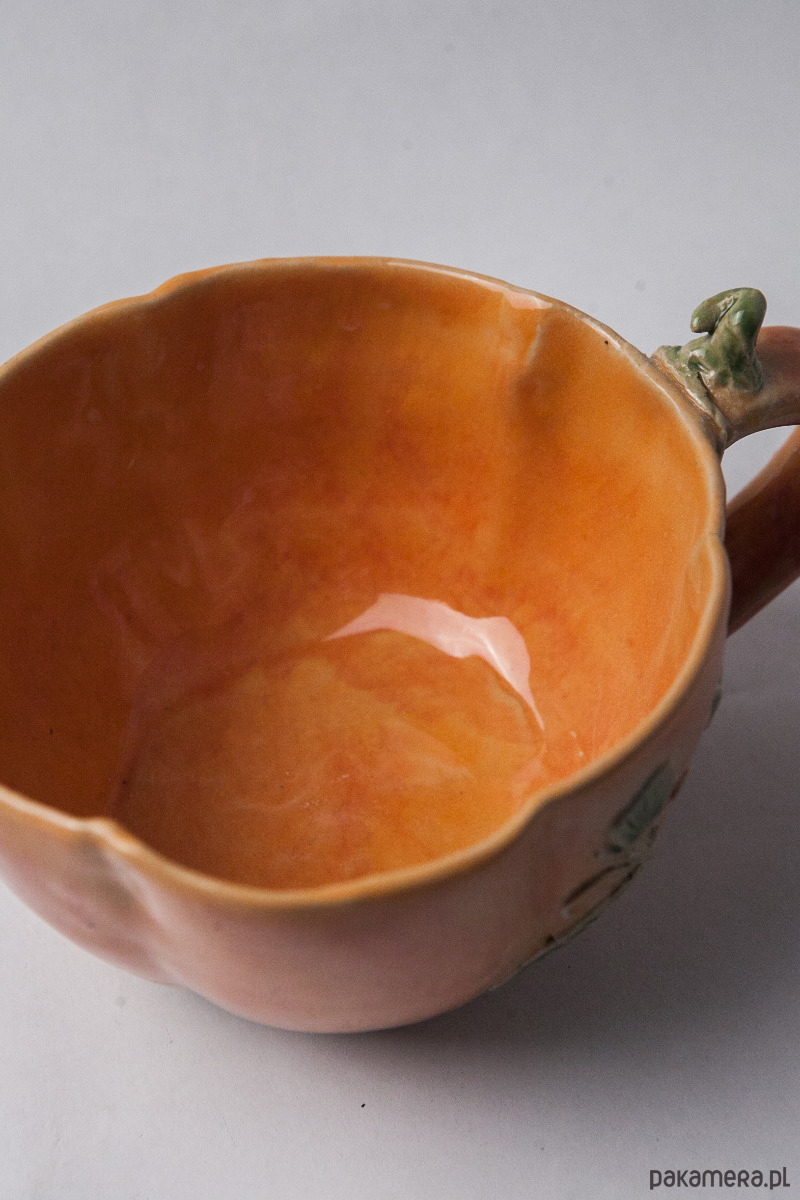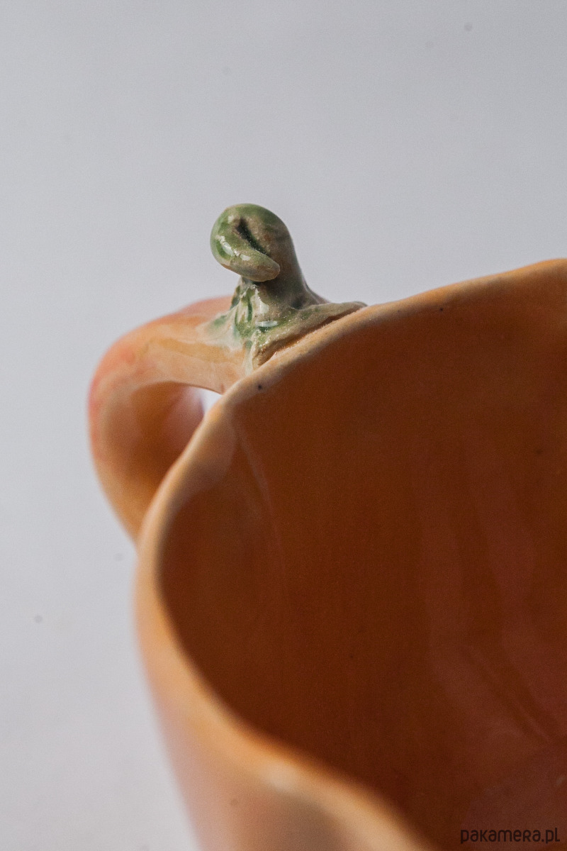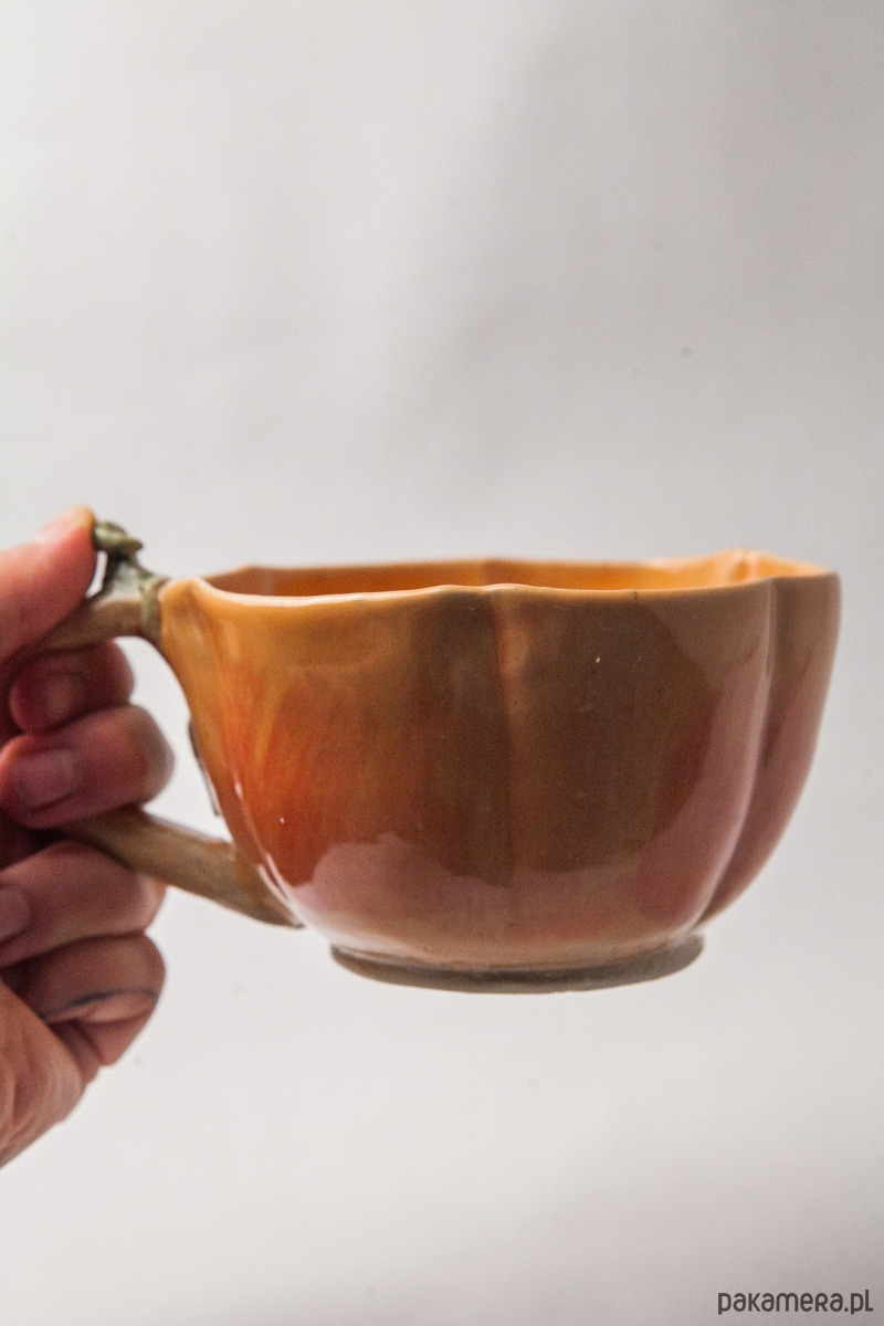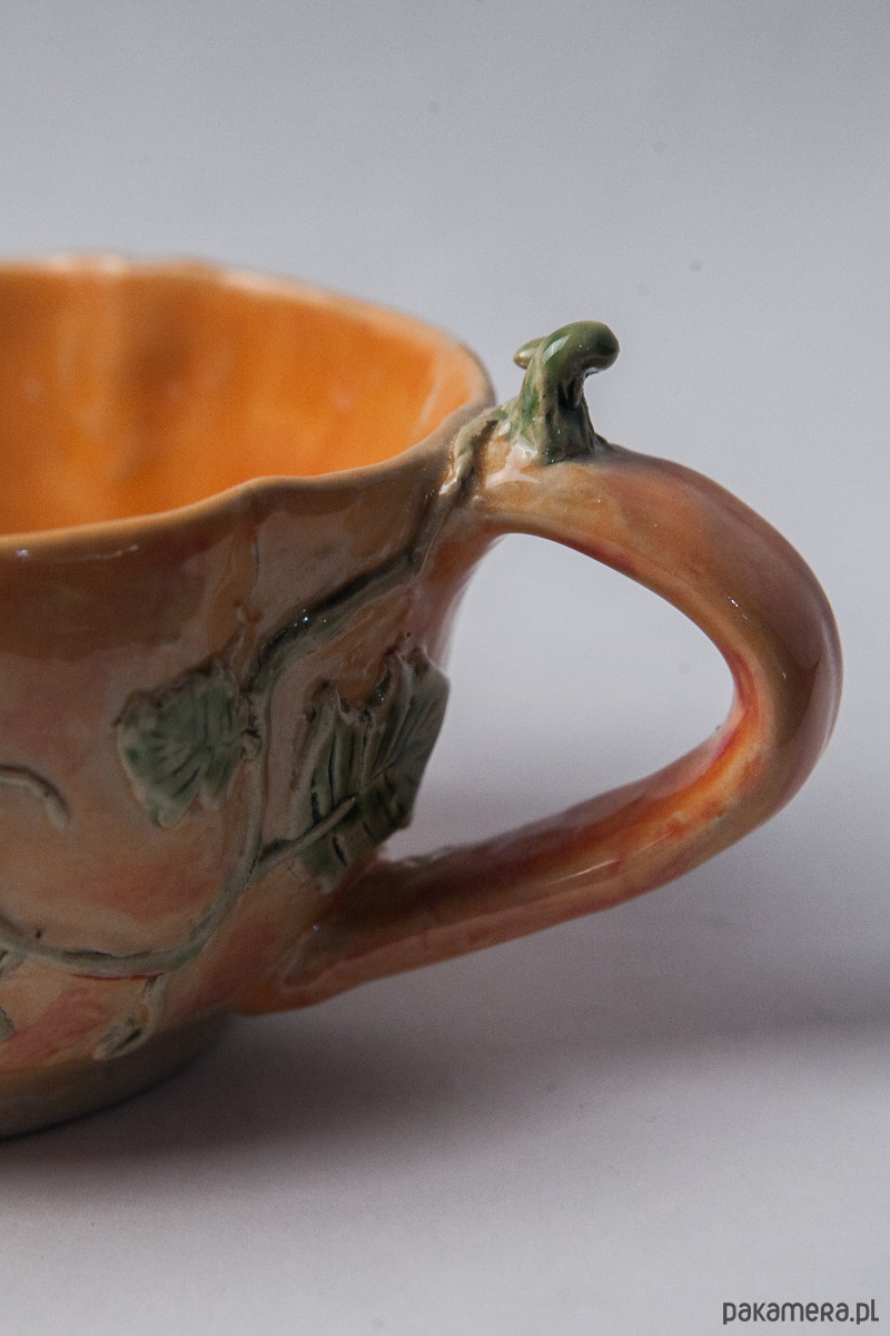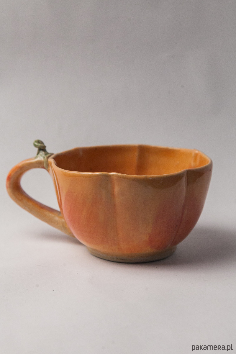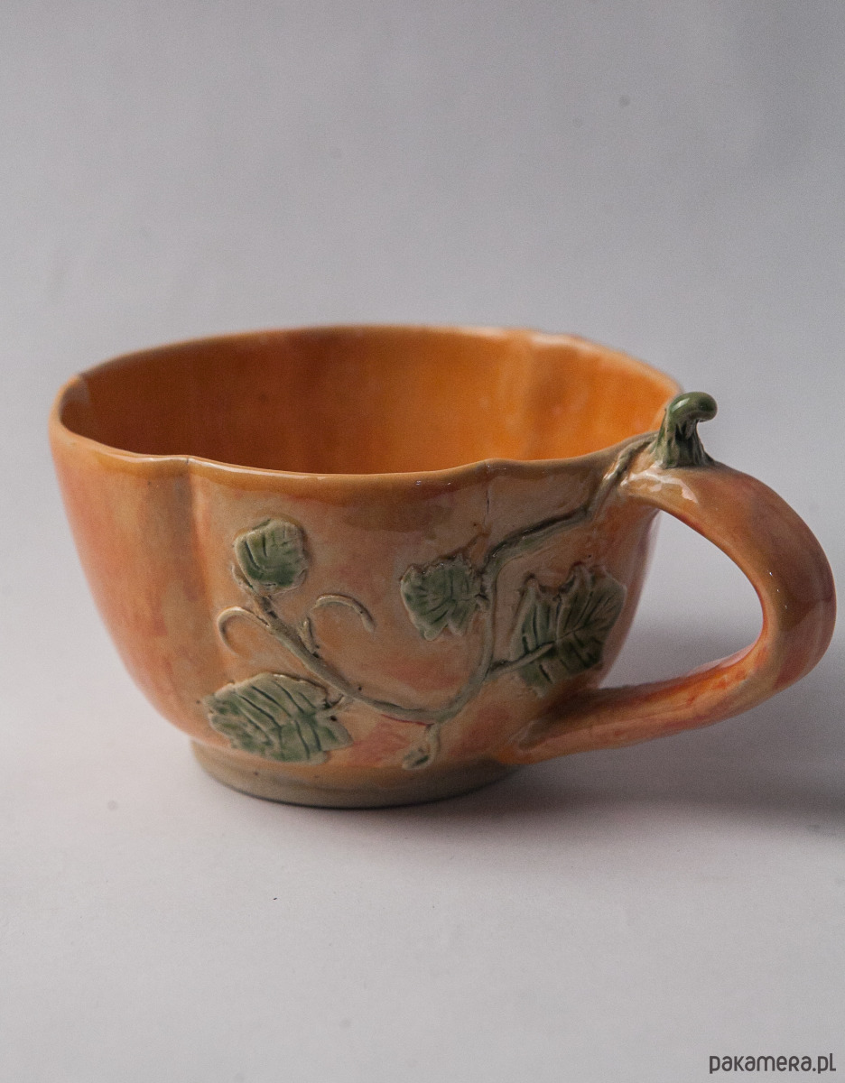 Kubek wytoczony na kole, wykonany z jasnej gliny, udekorowany na kształt dyni. Na jednym z boków delikatny wzór liści dyni. Na uszku kubka dyniowy zawijasek, który służy nie tylko jako ozdoba, ale i ułatwia trzymanie kubka.