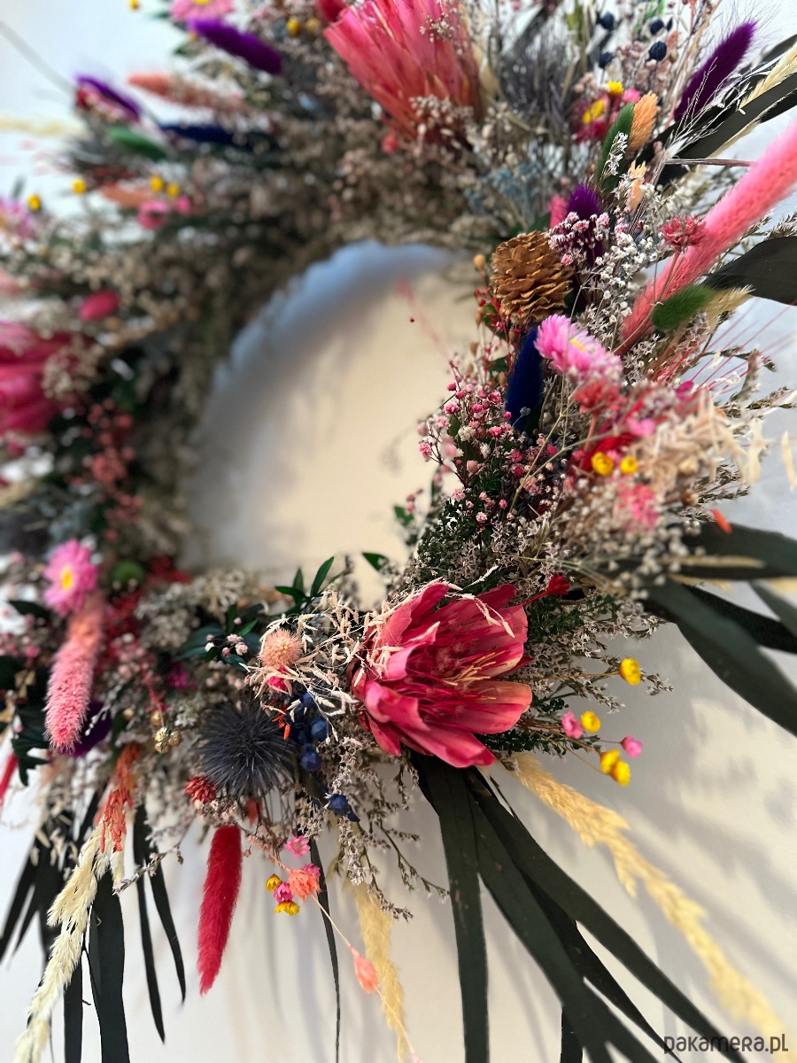 Duży jesienny wianek eukaliptus i protea