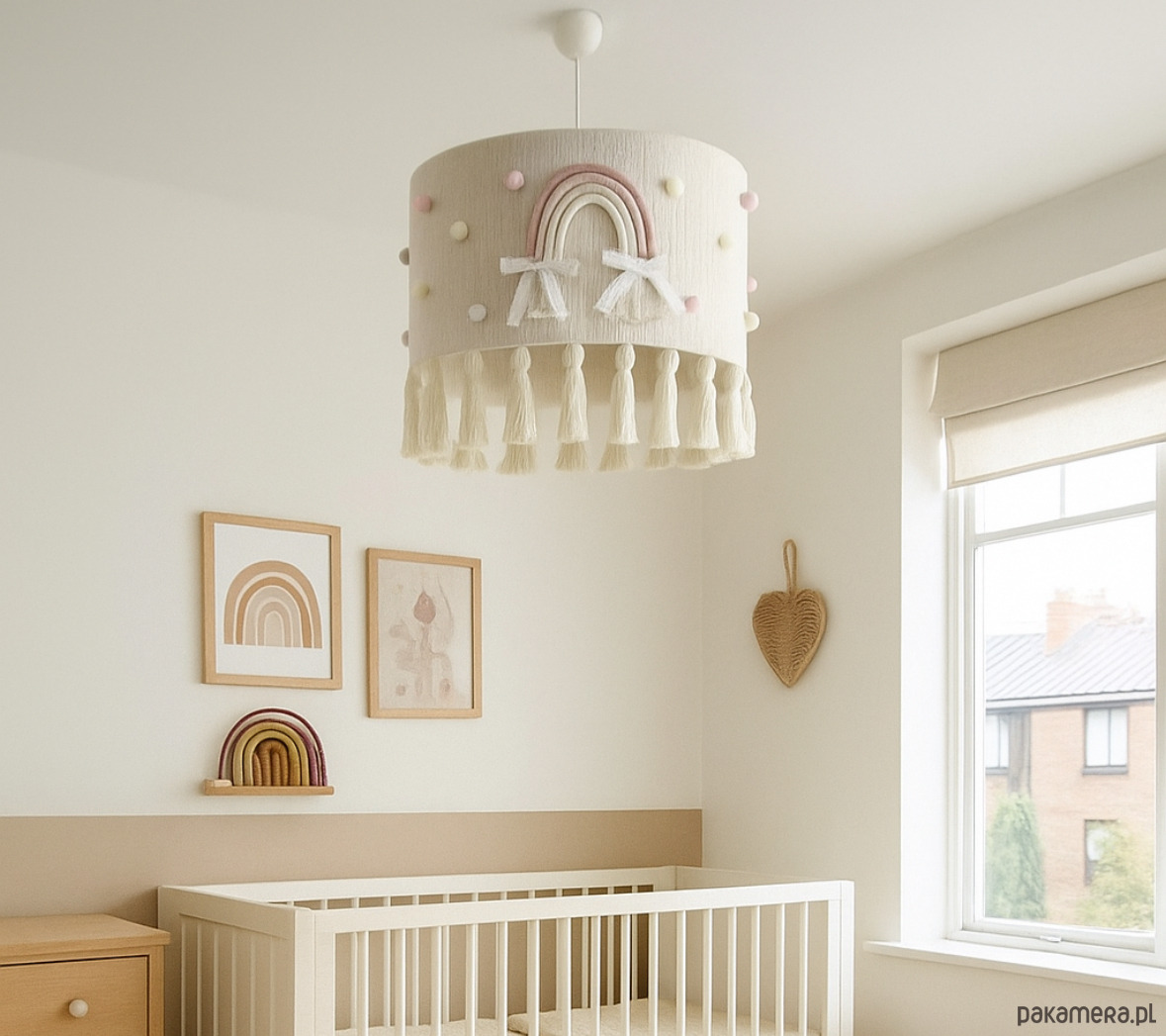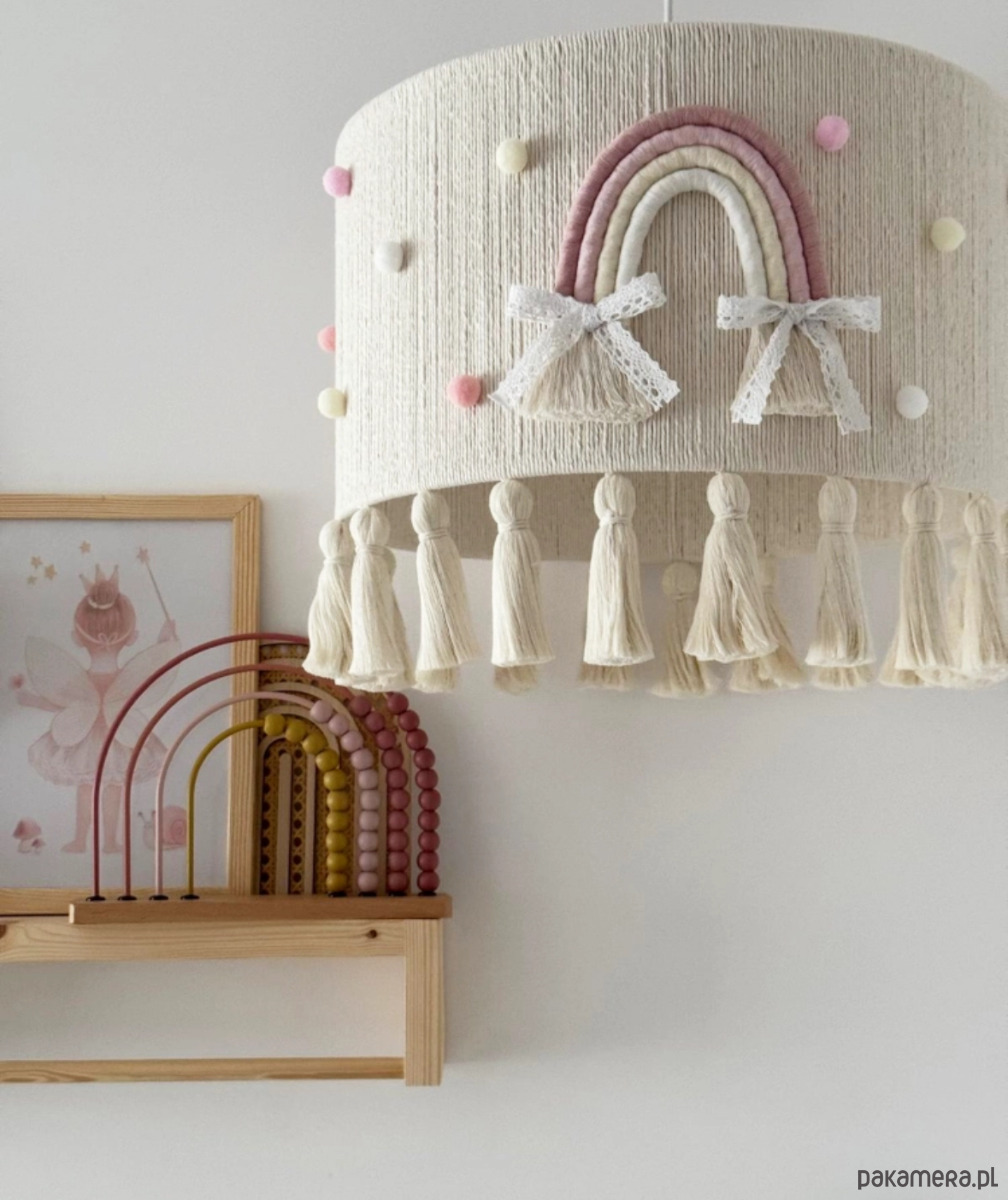 Sprzedam ręcznie pleciona lampę do pokoju dziecięcego, lampa zawiera dwie tęczę i mini pomponiki w kolorze pastelowym z chwostami