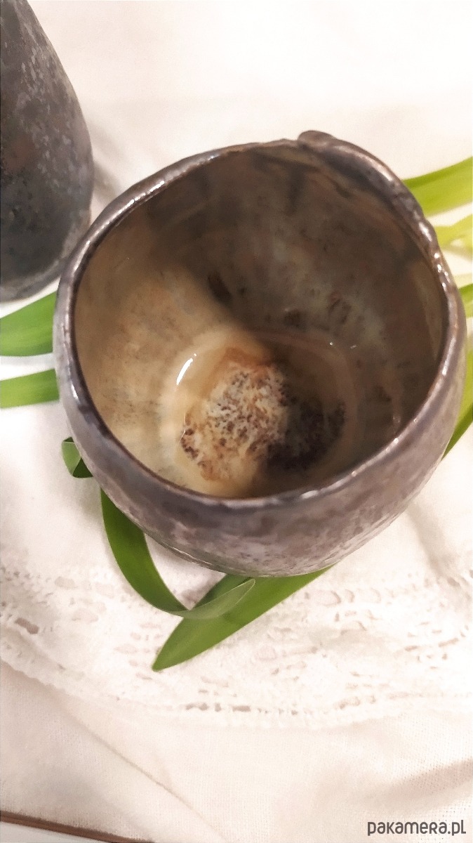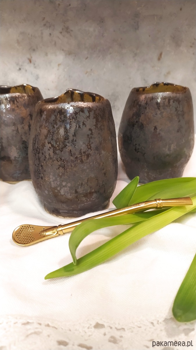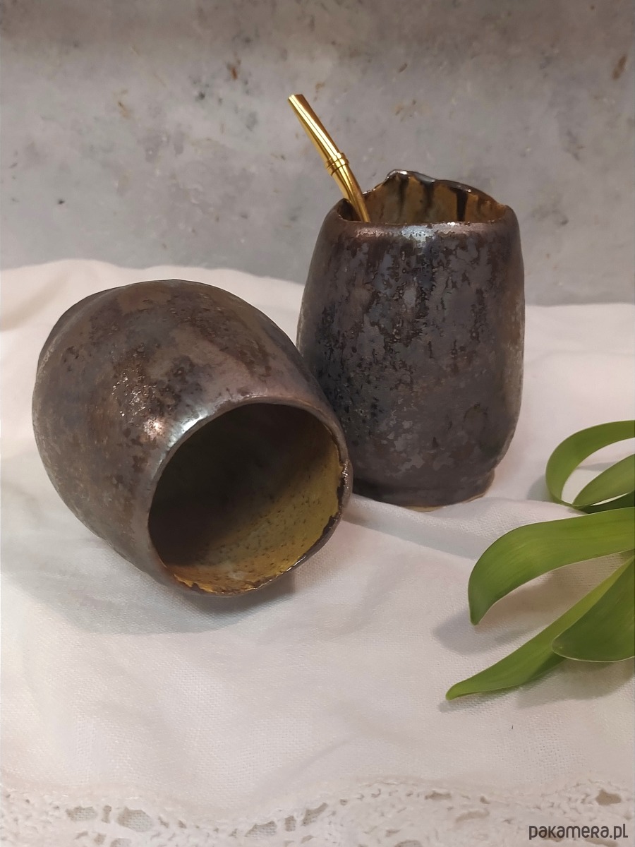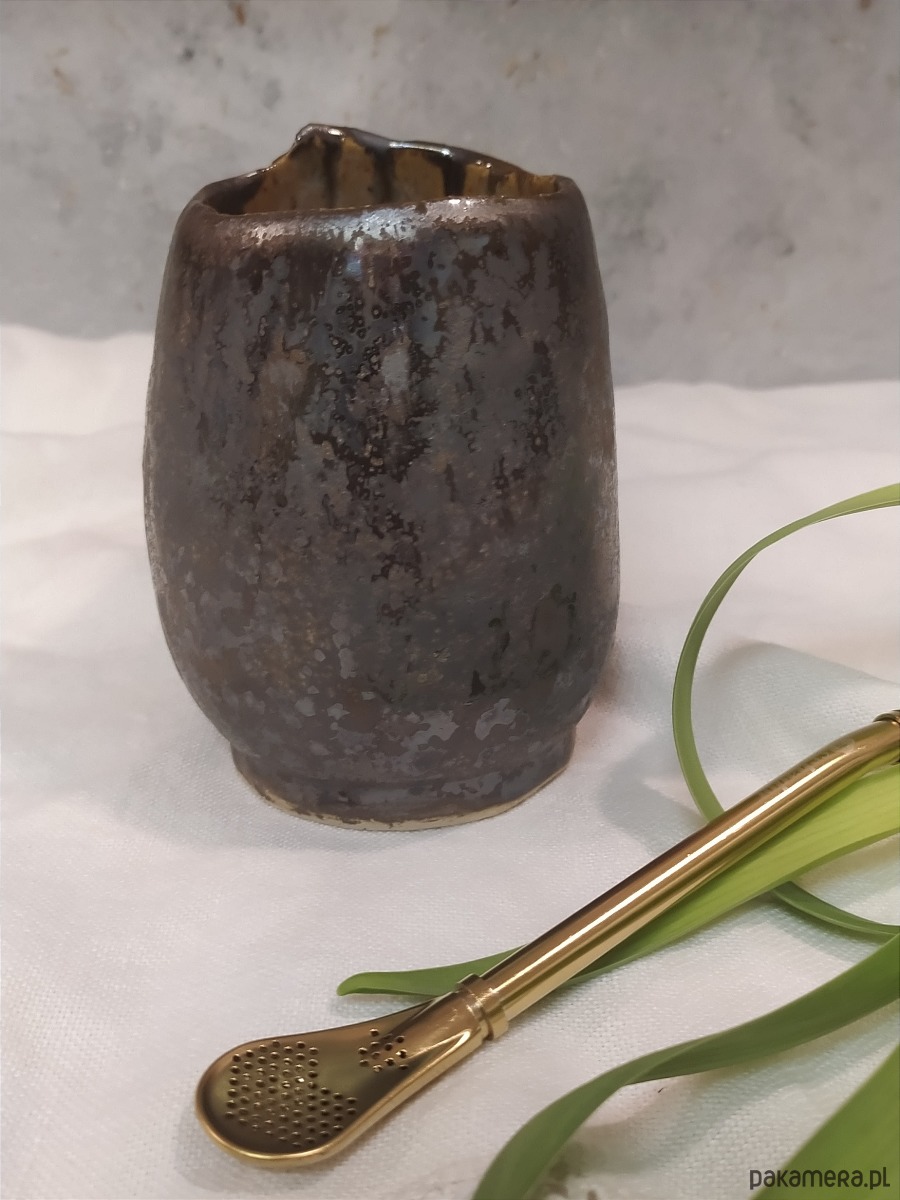 Kubek o pięknej kolorystyce starego złota i brązu, matowy , przypomnia kute żelazo.