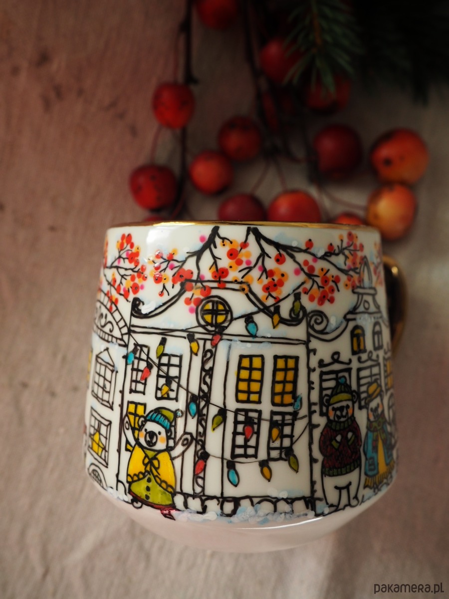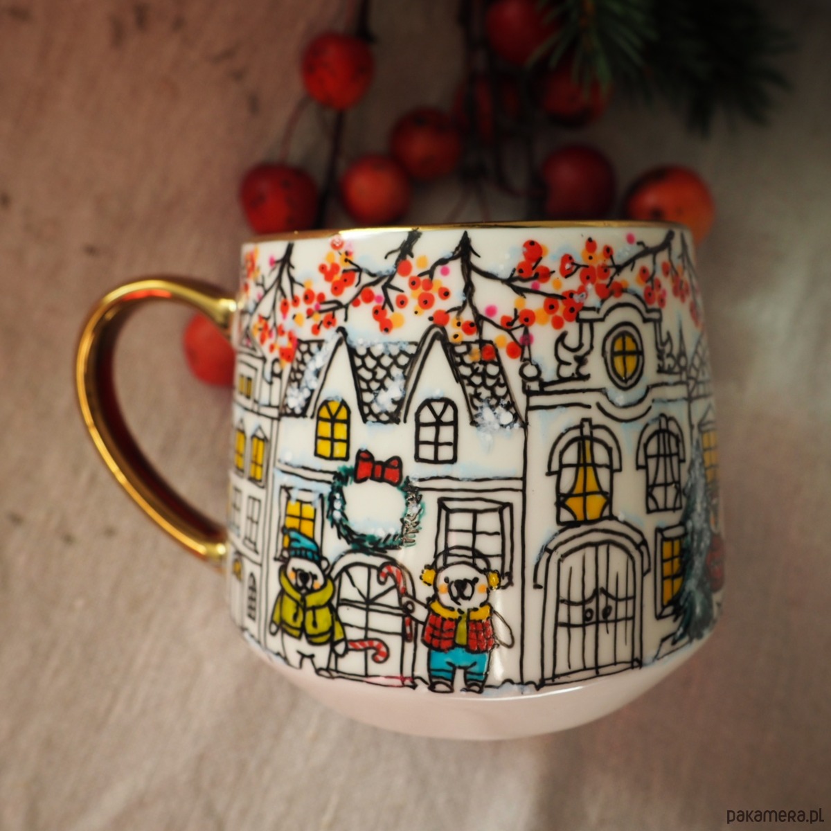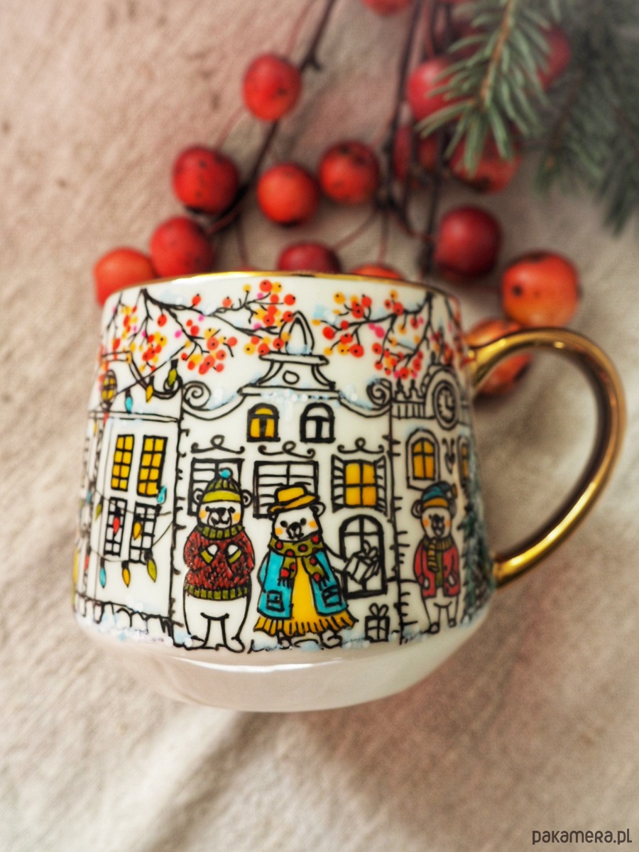 Ręcznie malowany kubek w żywych kolorach będzie doskonałym podarunkiem dla osoby kochającej zimowy nastrój i święta.