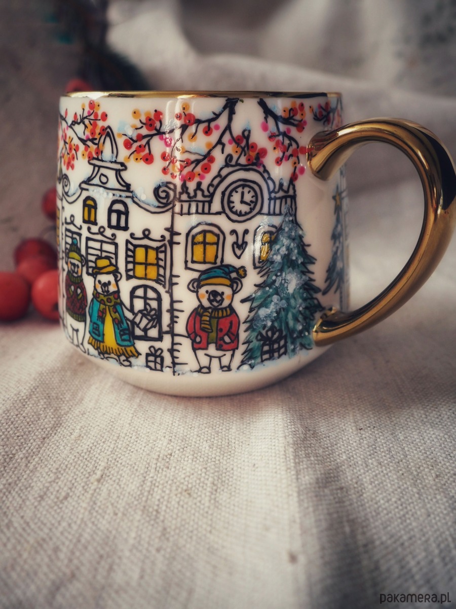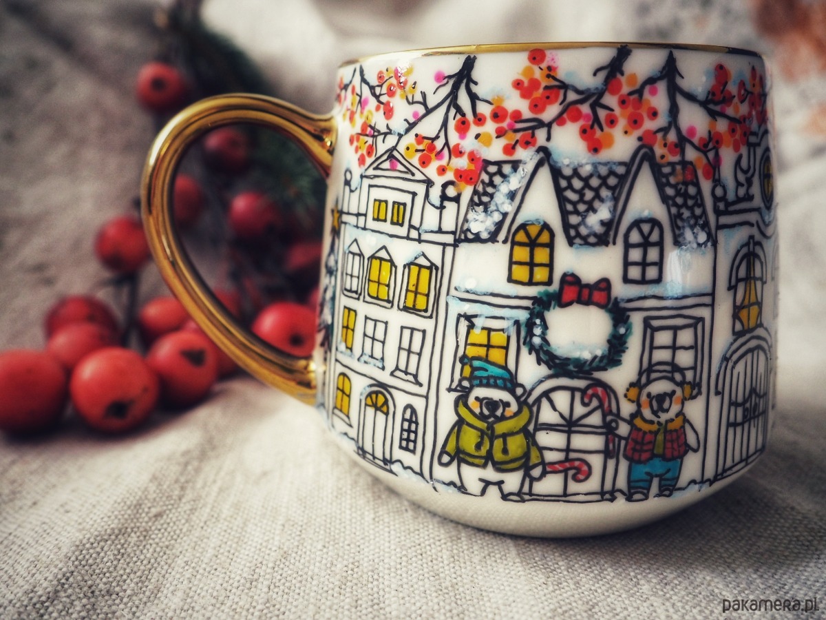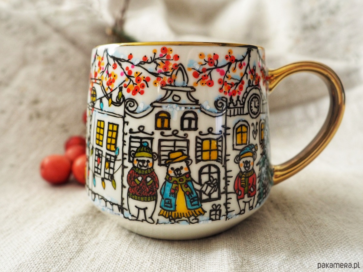 Wzór misiów na tle zimowych kamieniczek wykonany został przy użyciu nietoksycznych farb do porcelany, jest wodoodporny - naczynie może być myte ręcznie, bez użycia ostrych narzędzi.