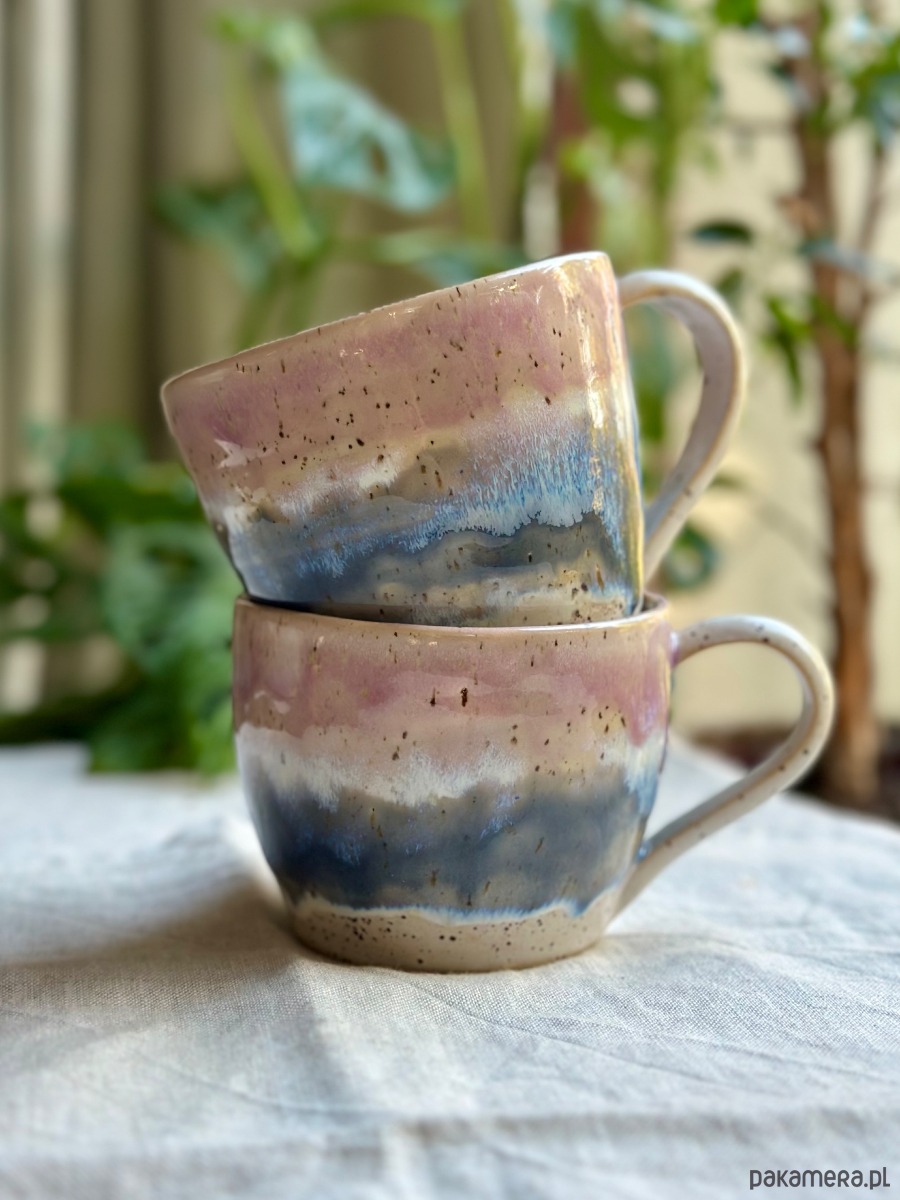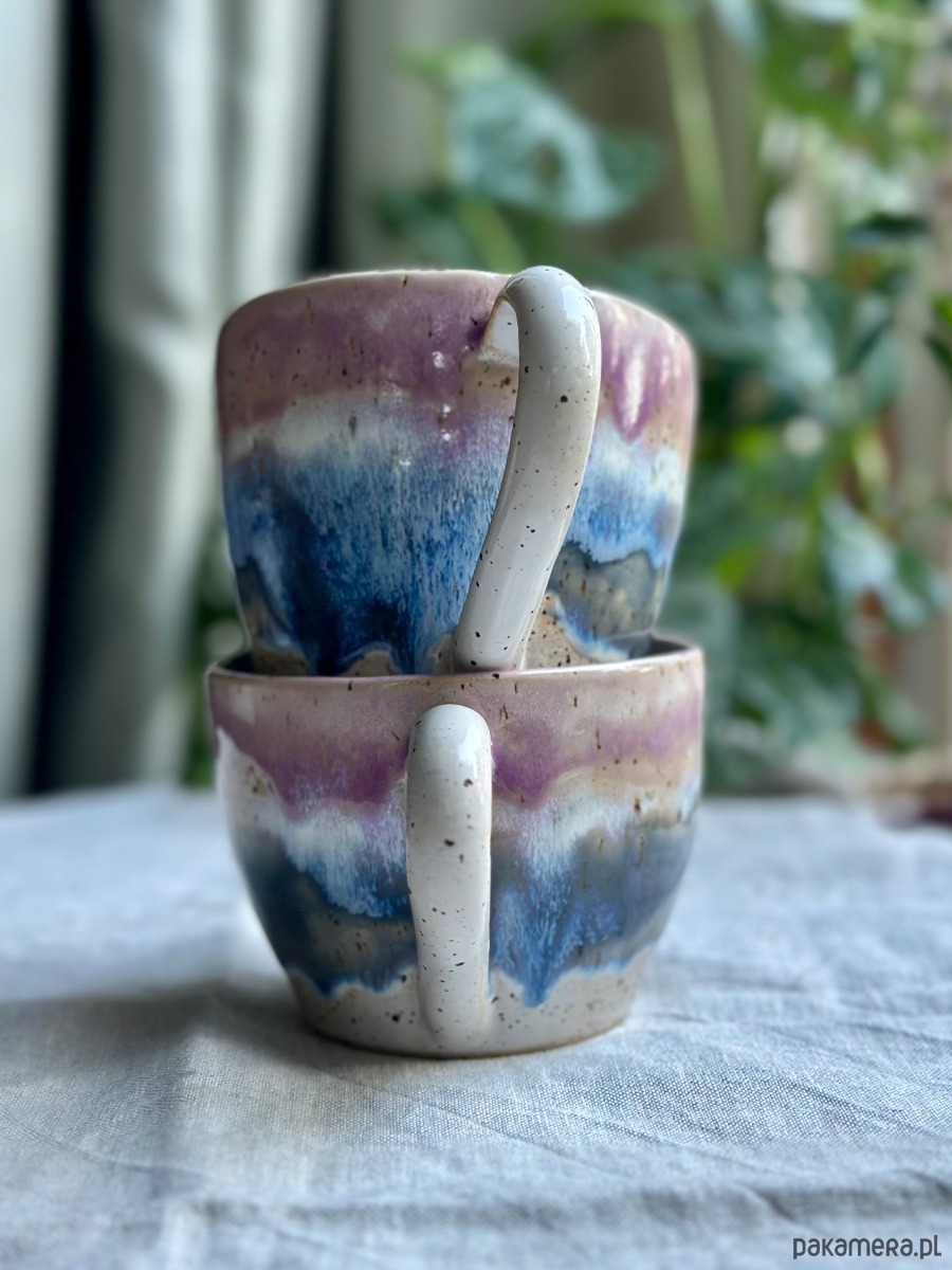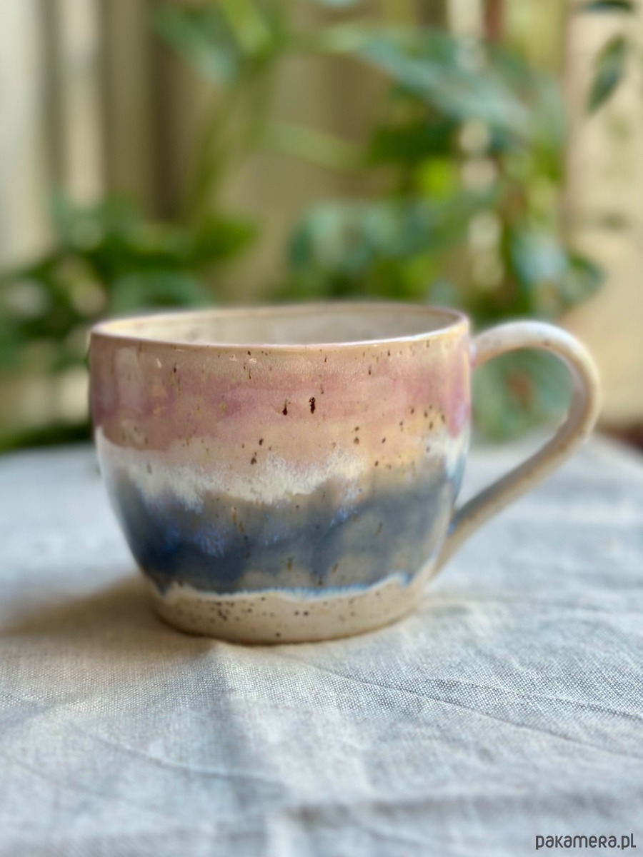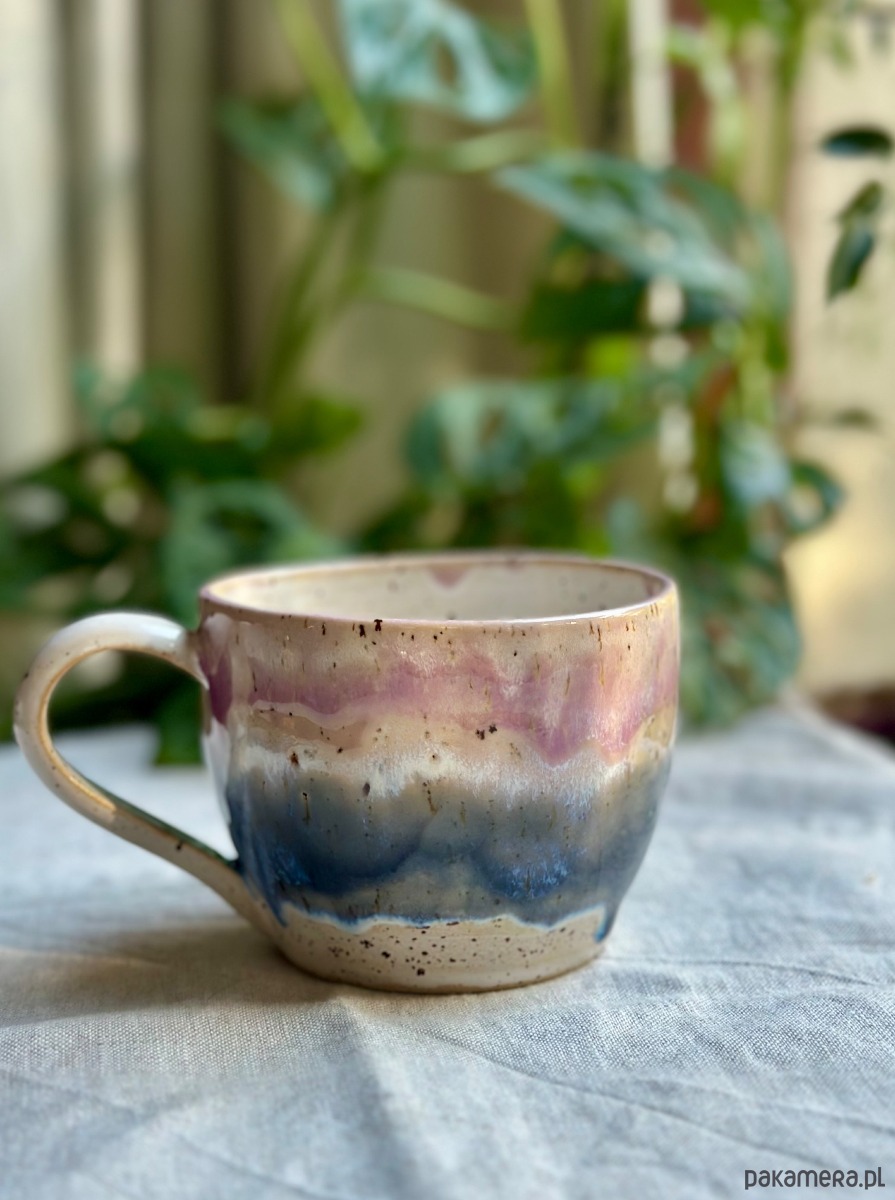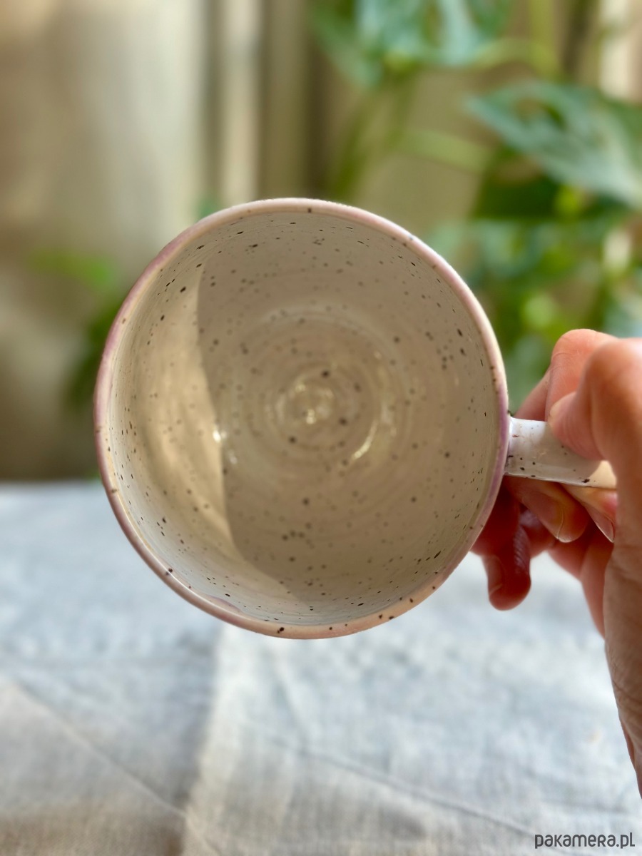 Ten konkretny egzemplarz ma trochę wypaczony, eliptyczny owal patrząc od góry. Nie wpływa to na jakość użytkowania kubka, a jest częstą cechą ręcznie robionych produktów ceramicznych.