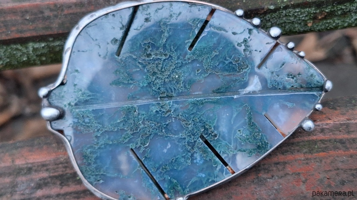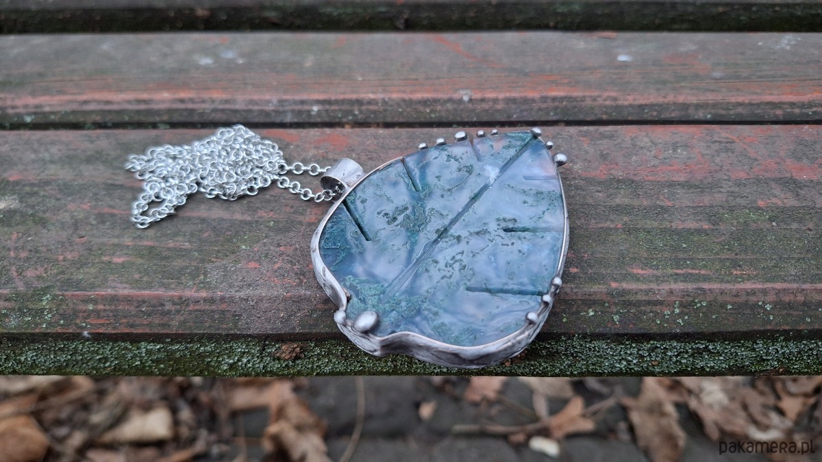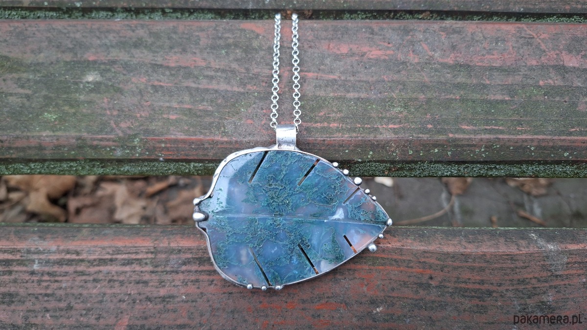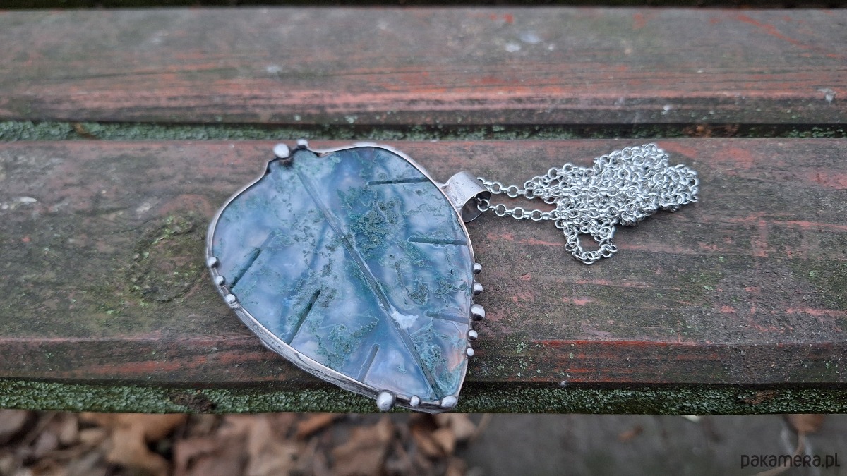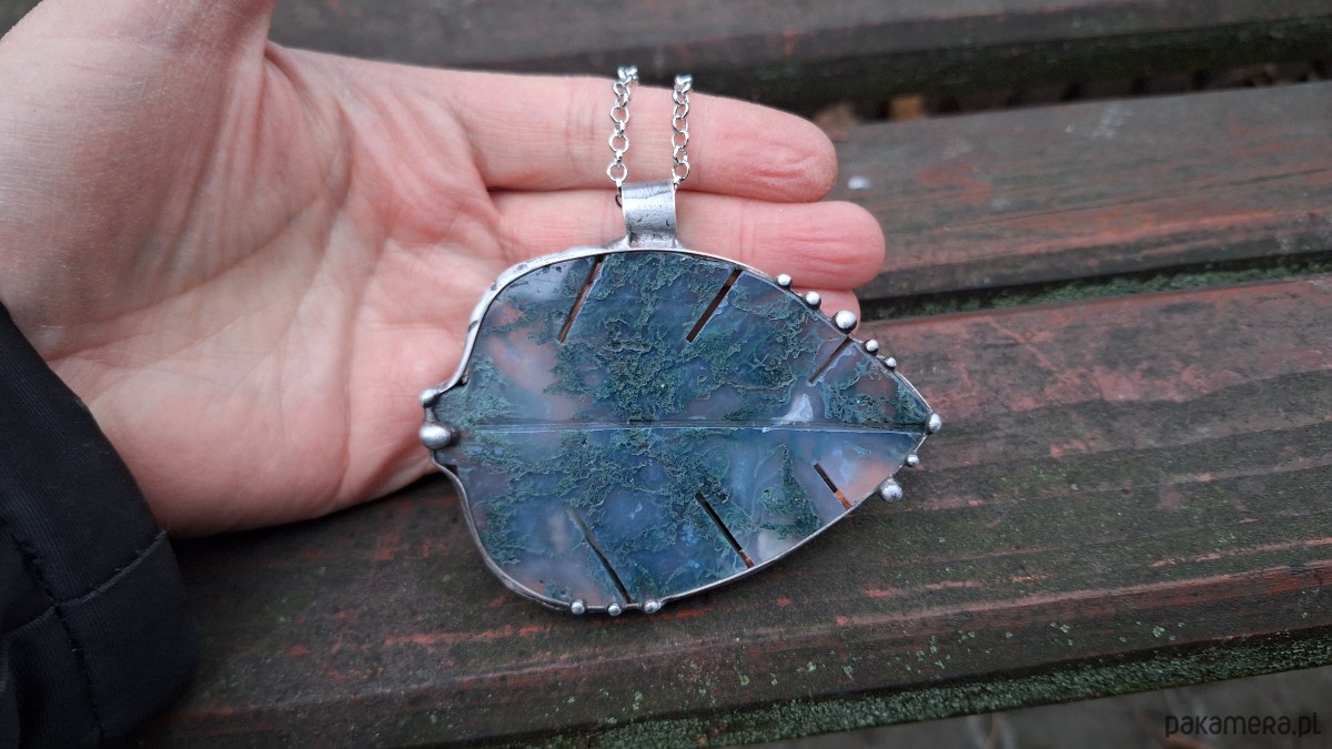 Duży wisior, wykonany z miedzi, cyny i agatu mszystego. Wymiary ok. 6 na 8 cm. Zawieszony na łańcuszku o długości ok. 80 cm. Jest dość ciężki.