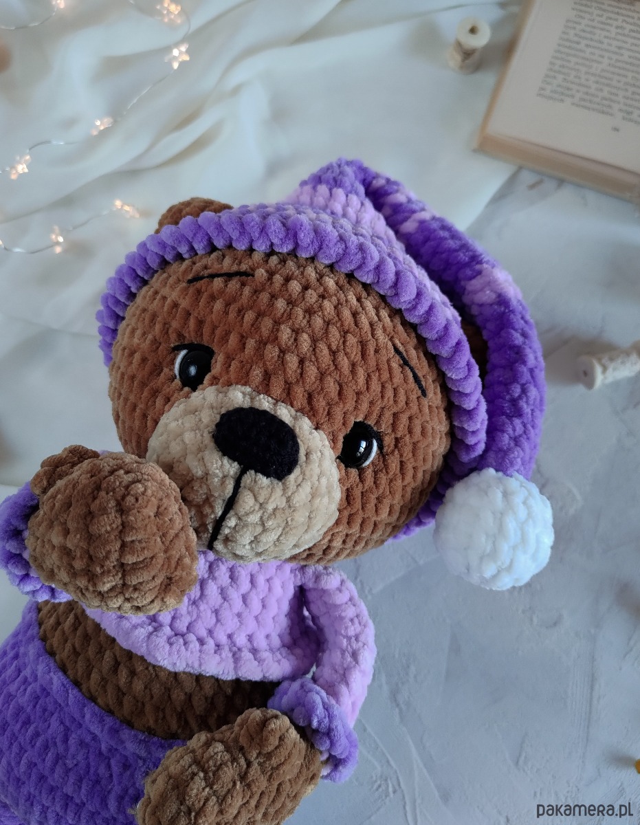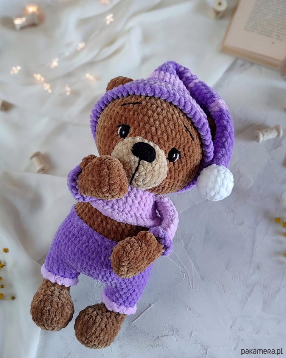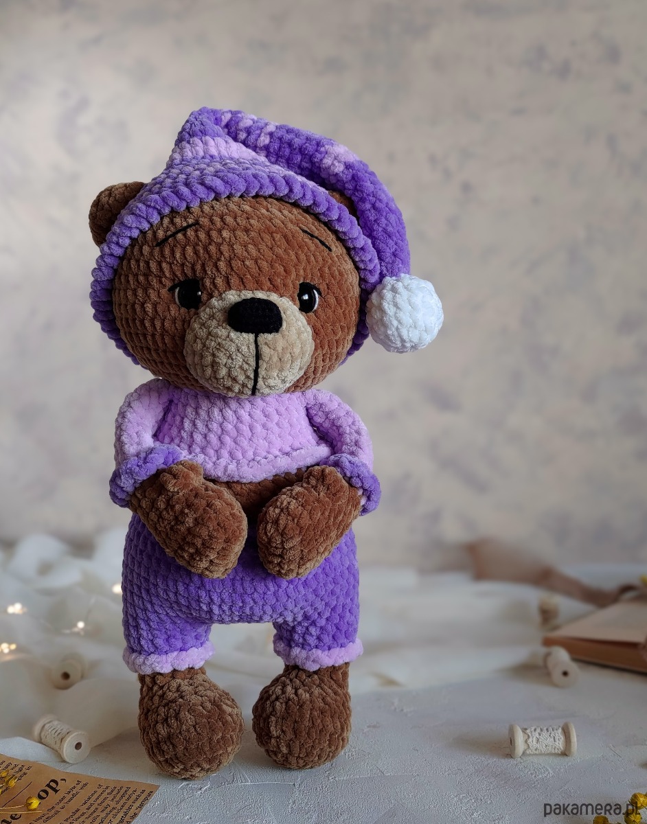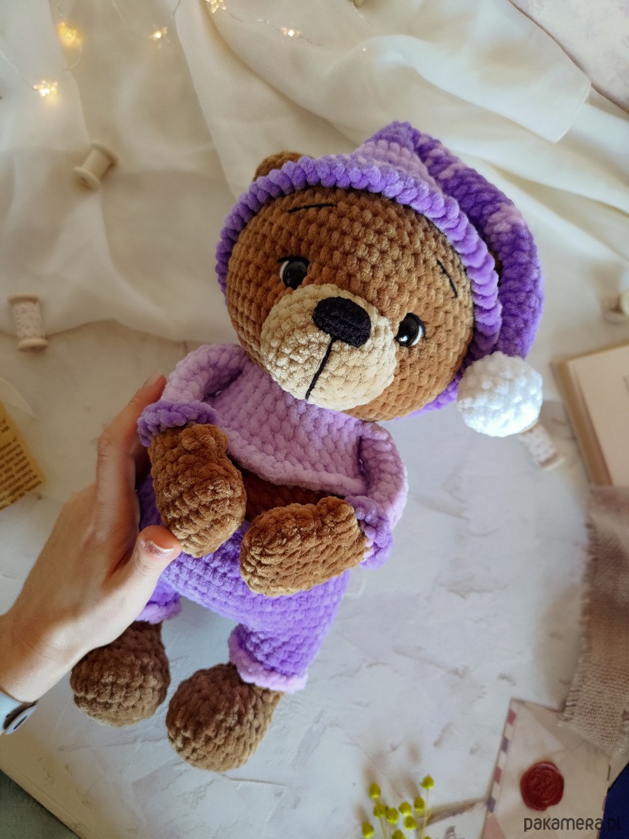 • Kolorystyka - jasno-brązowy miś, lilowa i jasno-fioletowa piżama i pasiasta czapeczka z białym pomponem. Czapeczka jest zdejmowana.