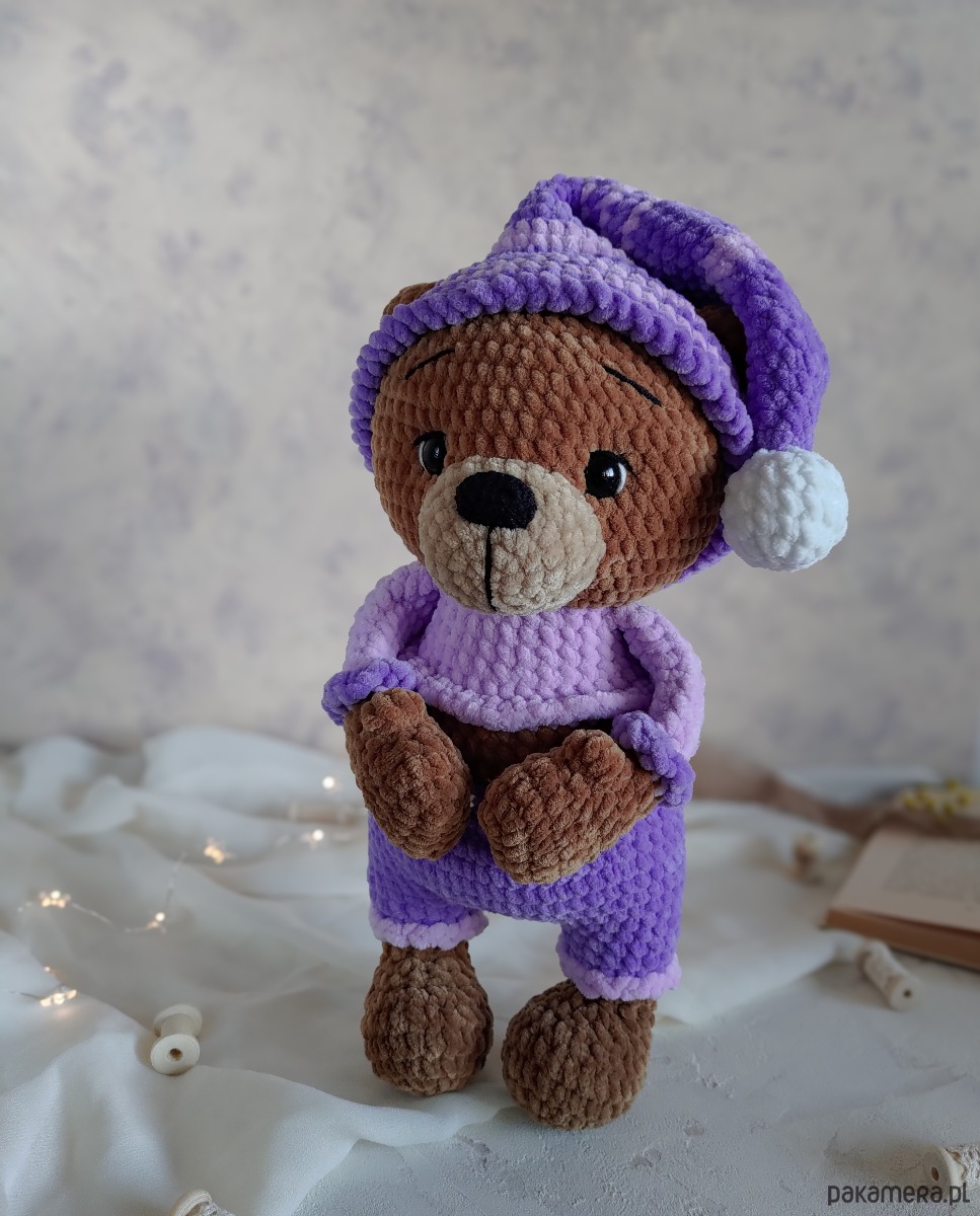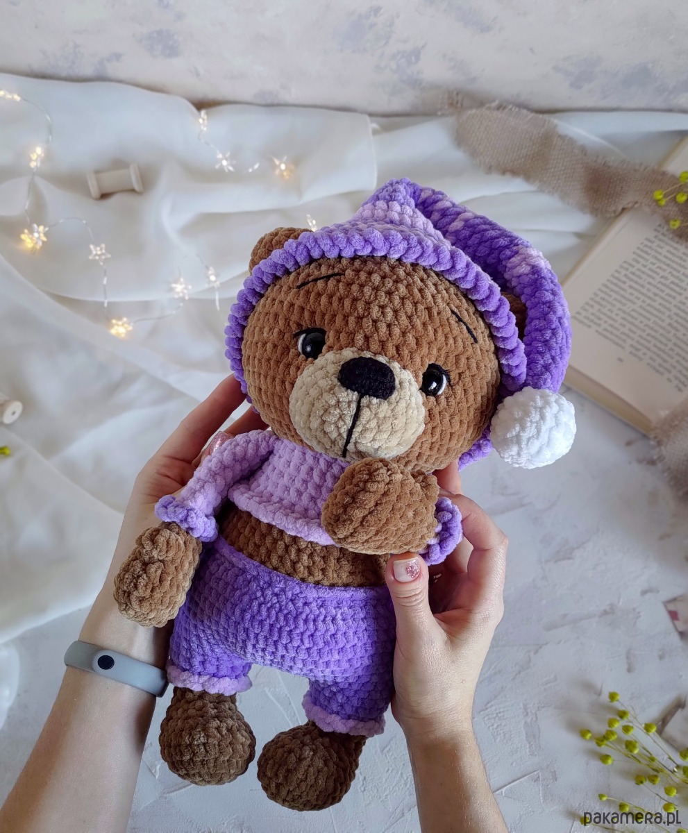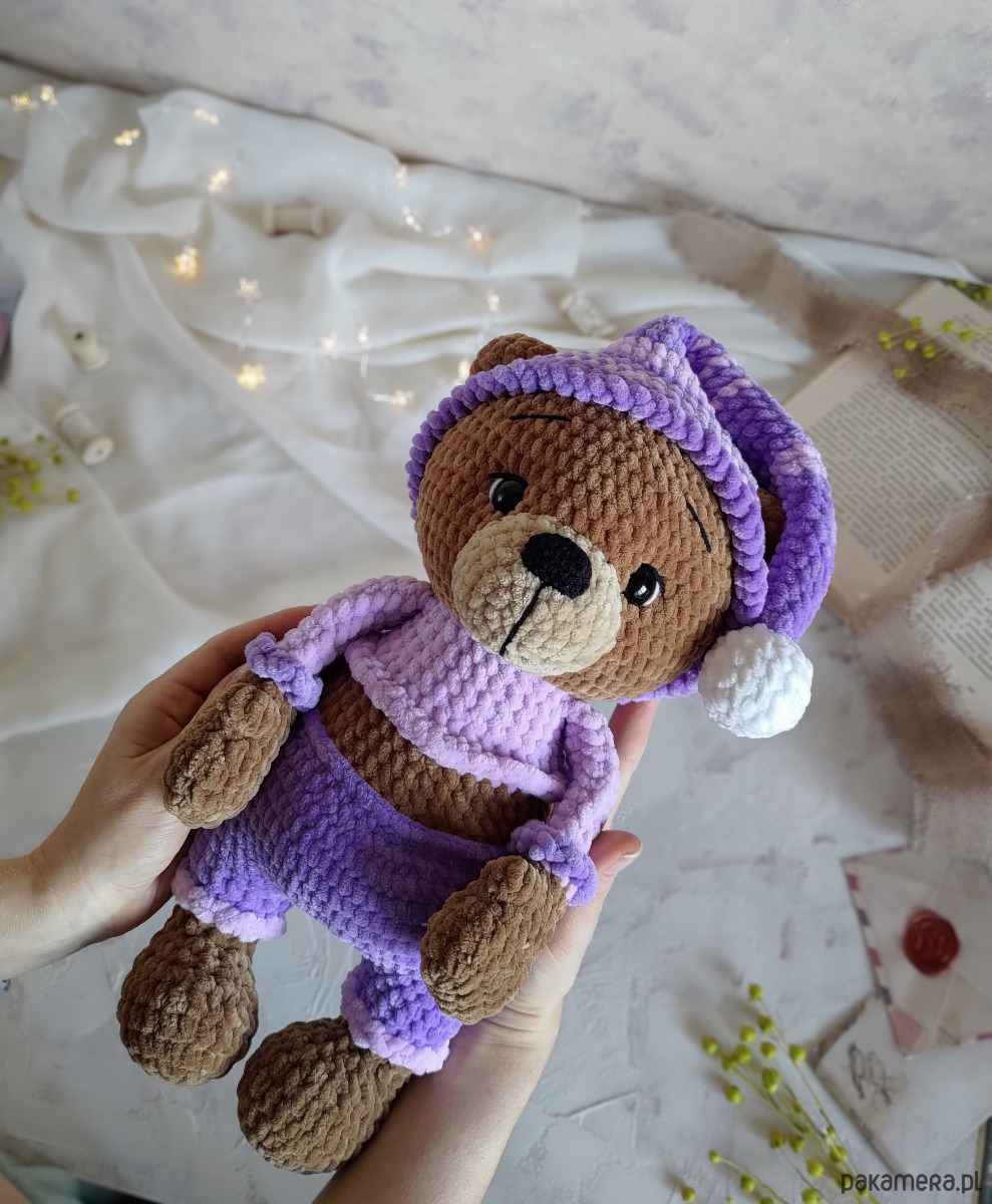 • Kolorystyka - jasno-brązowy miś, lilowa i jasno-fioletowa piżama i pasiasta czapeczka z białym pomponem. Czapeczka jest zdejmowana.
