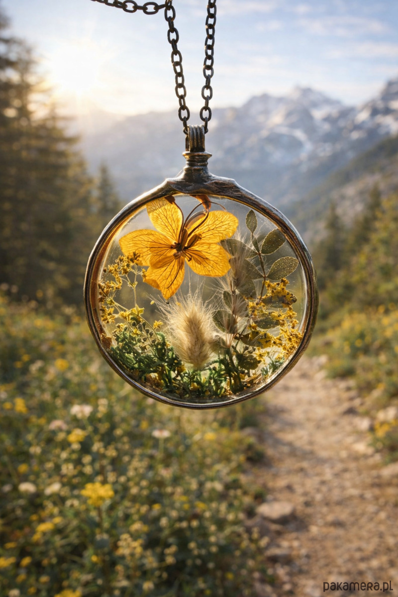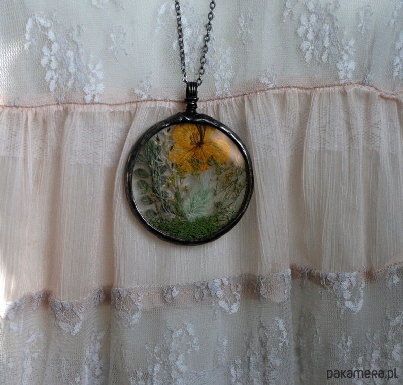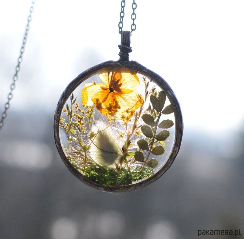Ręcznie wykonany naszyjnik terrarium z prawdziwymi suszonymi roślinami zamkniętymi w szkle.