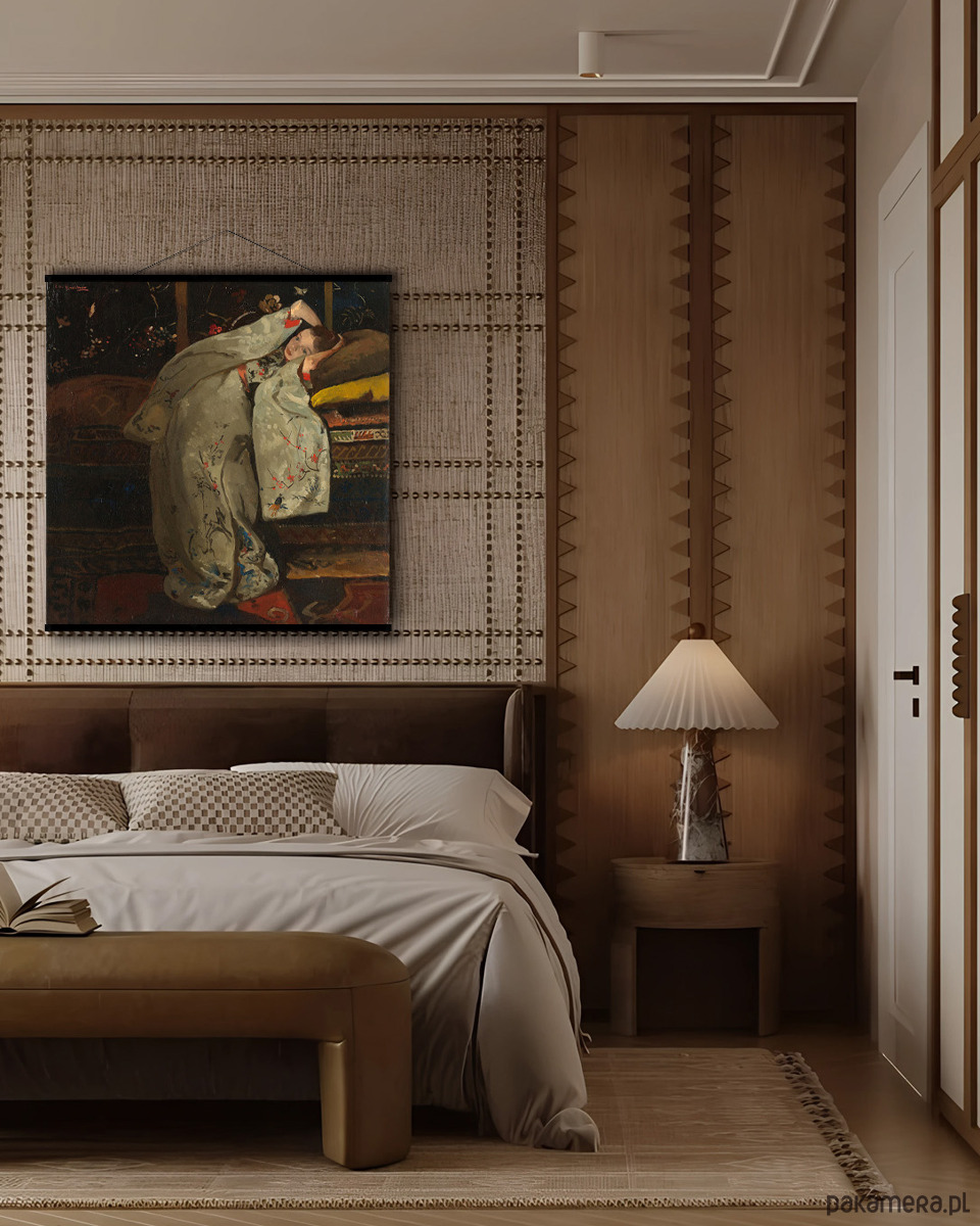 Grafika wydrukowana na płótnie, zamontowana u góry i dołu na drewnianych listwach w kolorze czarnym i zawieszona na naturalnym sznurku.