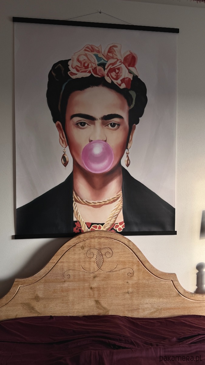 Grafika wydrukowana na płótnie, zamontowana u góry i dołu na drewnianych listwach w kolorze czarnym i zawieszona na naturalnym sznurku.