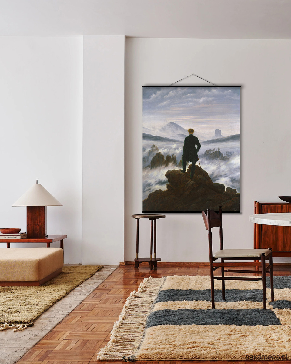 Grafika wydrukowana na płótnie, zamontowana u góry i dołu na drewnianych listwach w kolorze czarnym i zawieszona na naturalnym sznurku.