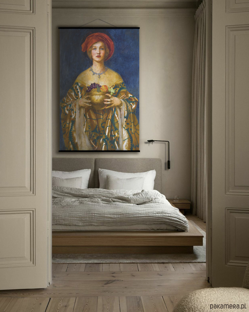 Grafika wydrukowana na płótnie, zamontowana u góry i dołu na drewnianych listwach w kolorze czarnym i zawieszona na naturalnym sznurku.