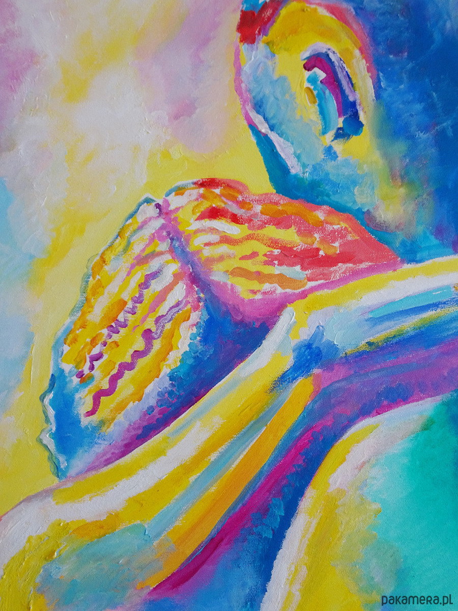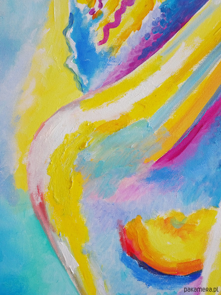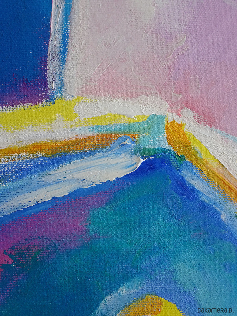 Obraz namalowany techniką olejną na blejtramie o wymiarach: 100/70 cm, boki obrazu zamalowane, sygnowany z przodu. Jest to moja autorska kompozycja. Świetnie może być eksponowany w nowoczesnych wnętrzach o stonowanej kolorystyce. Swoimi barwami może rozjaśnić takie wnętrza, w oświetleniu dziennym, jak i sztucznym.
