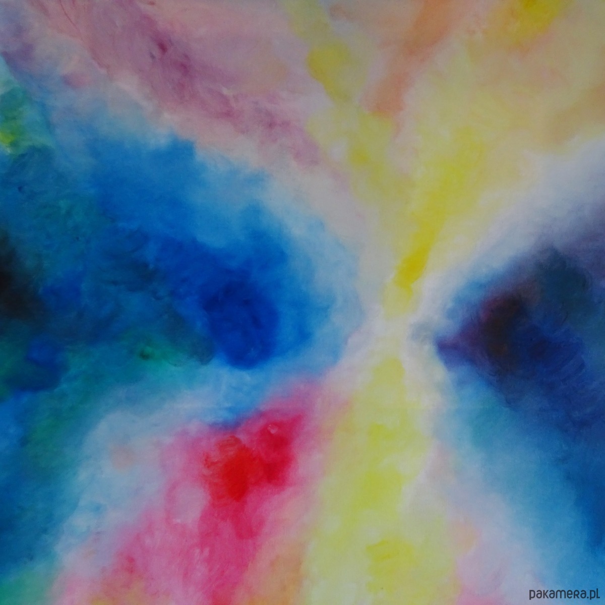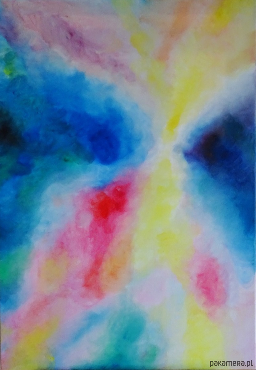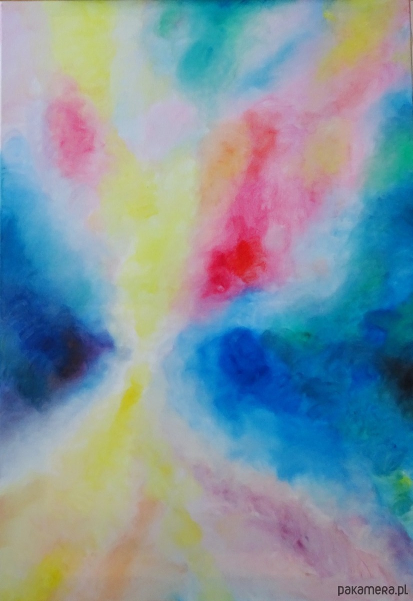 Ten obraz pulsuje jak oddech światła, jakby cała kompozycja była jednym wielkim rozbłyskiem energii rozlewającej się w różnych kierunkach. Miękkie, rozmyte przejścia barw sprawiają wrażenie, że obserwujemy narodziny czegoś ulotnego i niematerialnego — może emocji, może wspomnienia, może kosmicznego zjawiska, które dopiero nabiera kształtu.