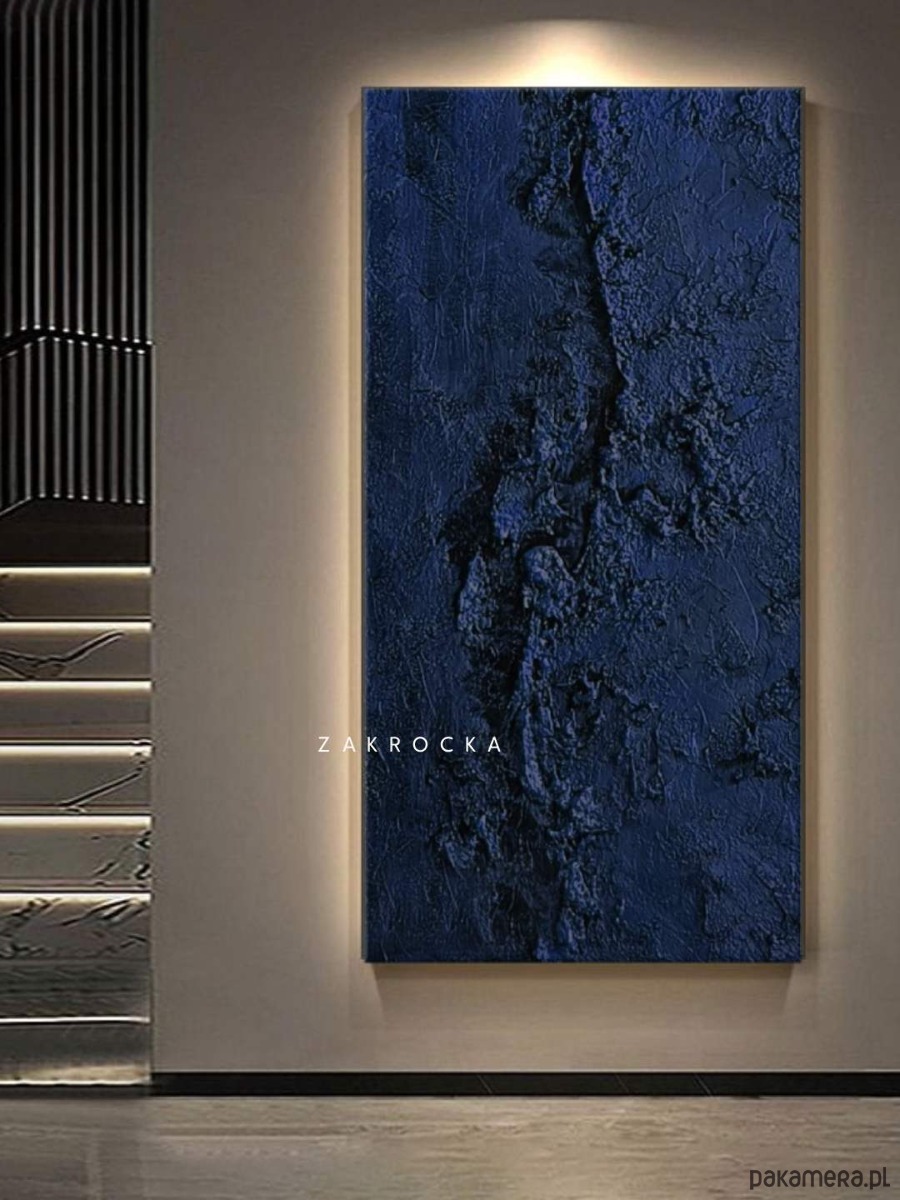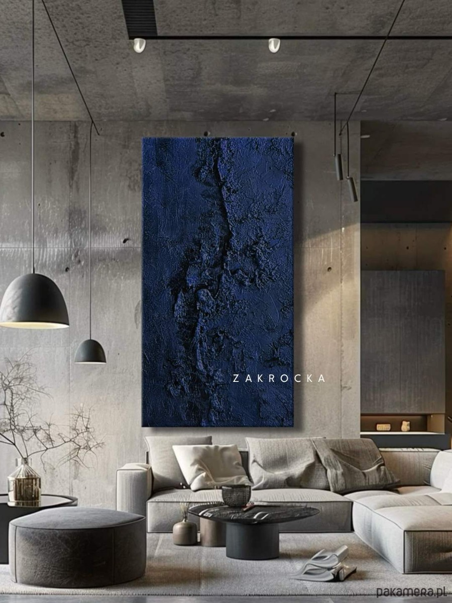 Monumentalny obraz strukturalny w głębokim odcieniu granatu przyciąga wzrok intensywną fakturą i wyrazistym pionowym podziałem kompozycji. Powierzchnia przypomina naturalne spękania skały lub erozję, tworząc dynamiczną grę światła i cienia. Subtelne wypukłości nadają mu trójwymiarowości, a matowo-błyszczące wykończenie potęguje efekt głębi. To obraz na płótnie, który wnosi do wnętrza elegancję, spokój i wyrafinowaną siłę.