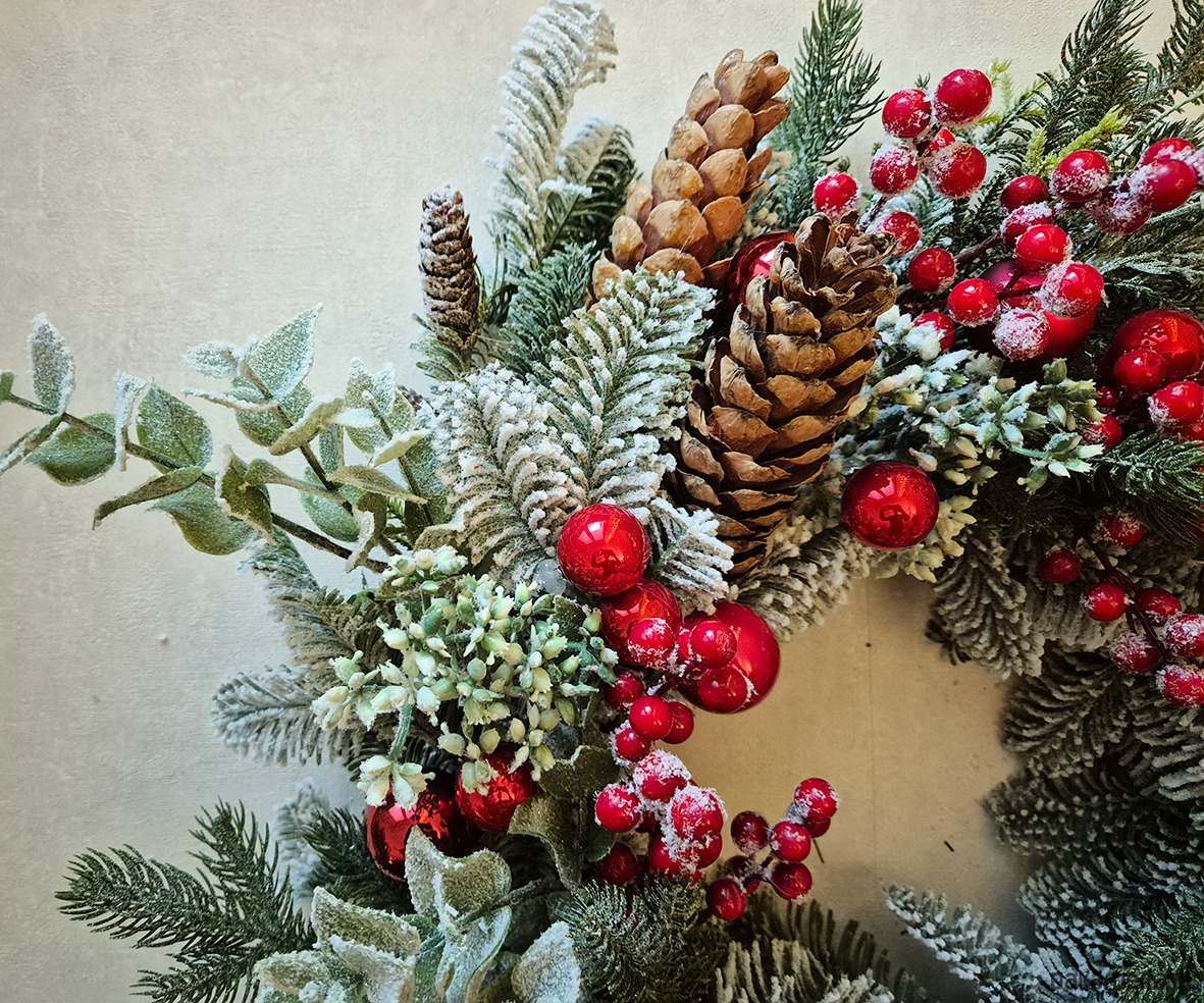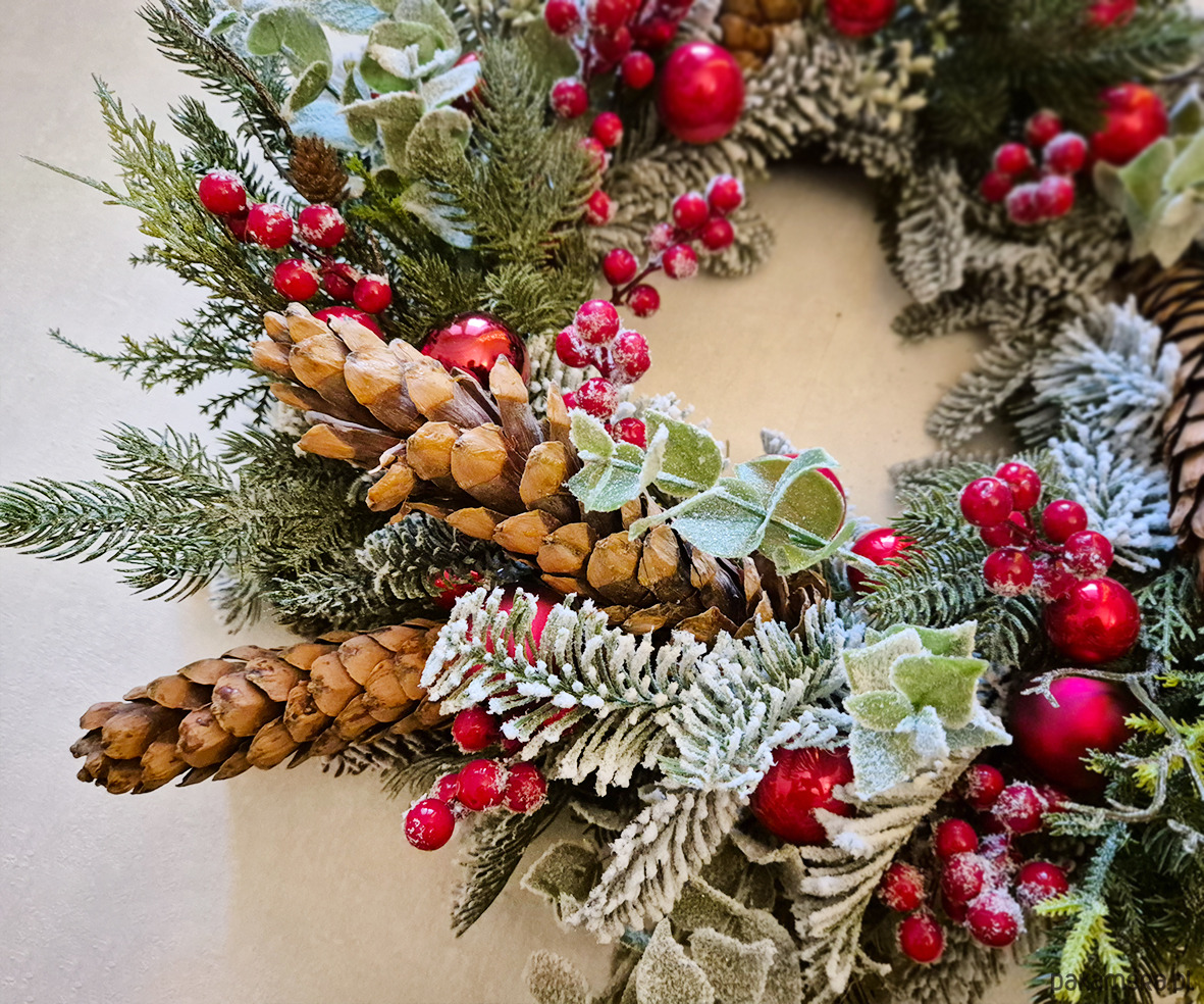 Okazały wianek w klasycznej kolorystyce. Wykonany z wysokiej jakości imitacji gałązek jodły, świerku i eukaliptusa pokrytych śniegiem i połyskujących szronem. Dekorują go naturalne szyszki, czerwone bombki i ośnieżone owoce. Średnica ok. 55cm