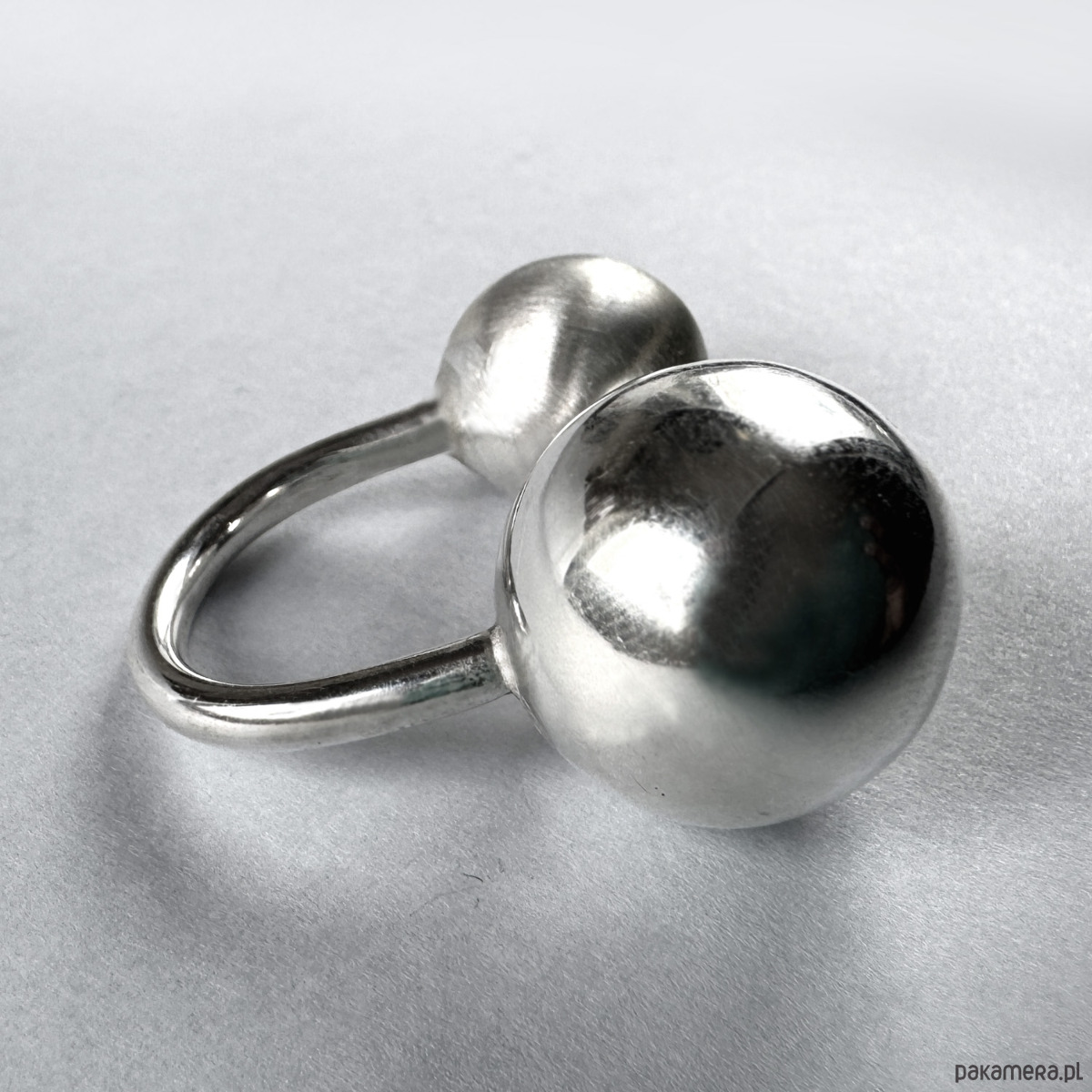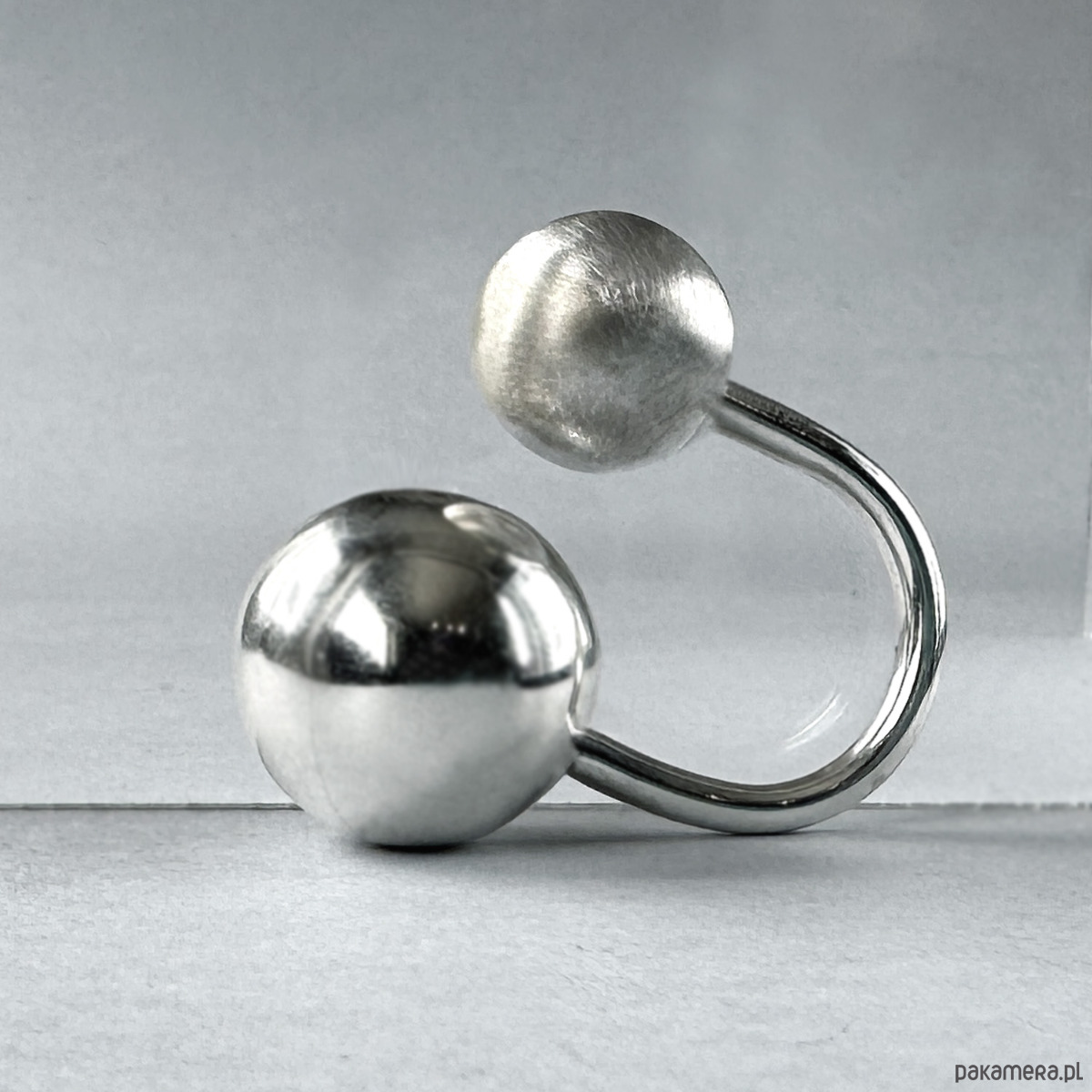 Kolekcja powstała z myślą o kobietach, ceniących sobie prostą, geometryczną biżuterię. Uniwersalny i minimalistyczny pierścionek z opcją regulacji, wykonany został ze srebra próby 925. Większa, polerowana kula, stanowi ciekawy kontrast dla mniejszej, matowej formy. Całość kompozycji urzeka swoją prostotą. Pierścionek jest bardzo wygodny w noszeniu i pasuje do każdej stylizacji, a co najważniejsze - robi piorunujące wrażenie :)