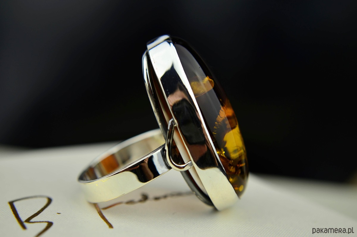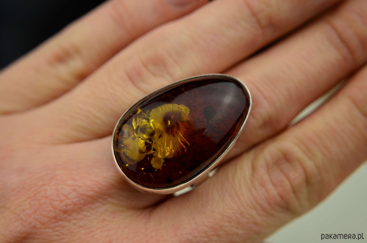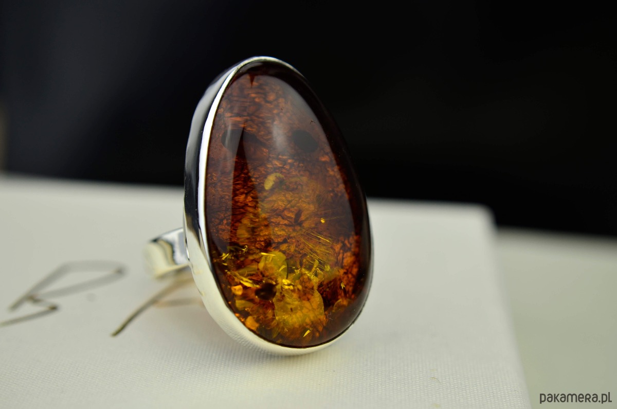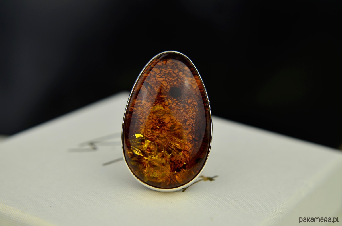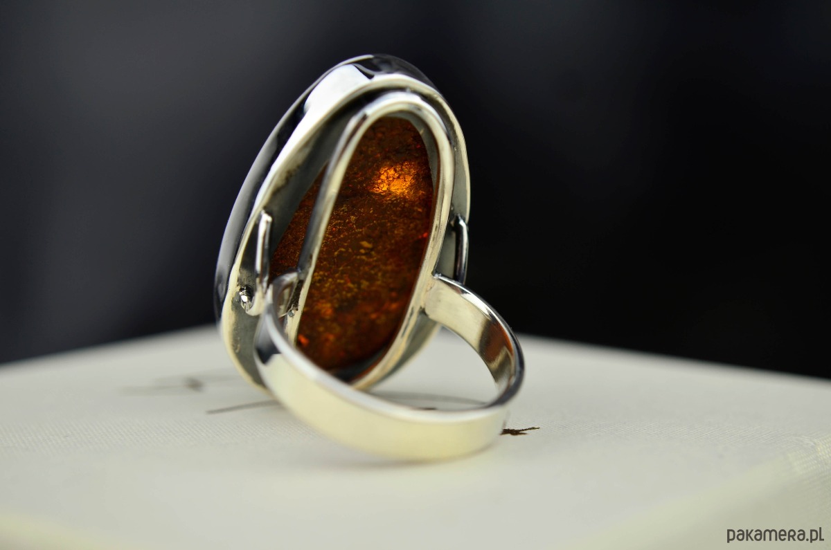 Duży pierścień ze srebra, który eksponuje piękno bursztynu. Duży koniakowy bursztyn ma w sobie duże złociste łuski, a od spodu świetnie zachowaną bursztynową korę, która nadaje mu wygląd plastra miodu. Prosta srebrna oprawa od spodu posiada ozdobne wsporniki, które nadają pierścionkowi elegancki charakter.