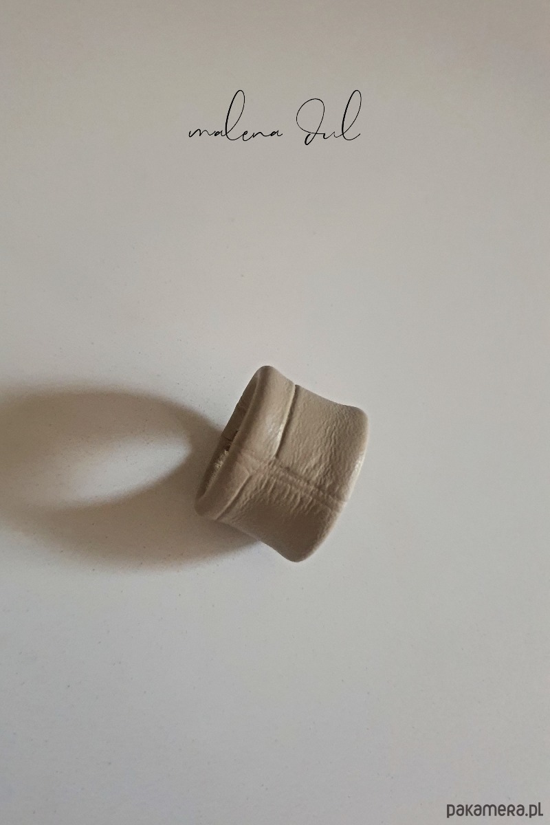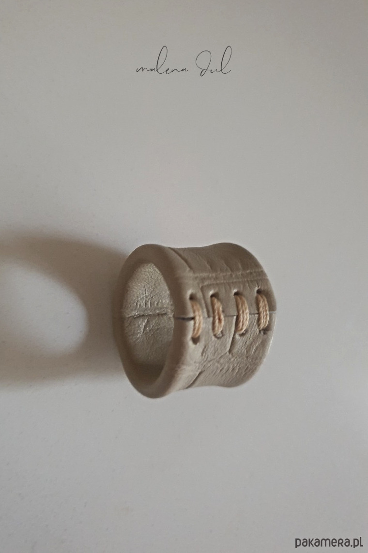 Wyjątkowy, awangardowy pierścionek z beżowej skóry naturalnej z motywem krokodyla, szyty nicia kaletnicza. Duży rozmiar i oryginalny design, niebanalny dodatek do codziennej czy wieczorowej stylizacji. Mozna go nosic na kazdym palcu, wyjatkowo prezentuje sie na kciuku wraz z bransoletka wykonana z tej samej skory. Pierścionek wykonuje zgodnie z zamówionym rozmiarem (obwód palca). Bransoletka ze zdjęcia, również jest są dostępna.