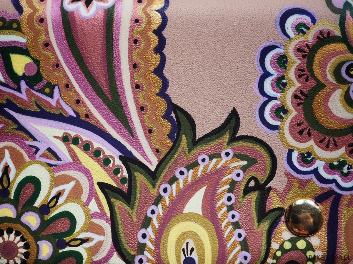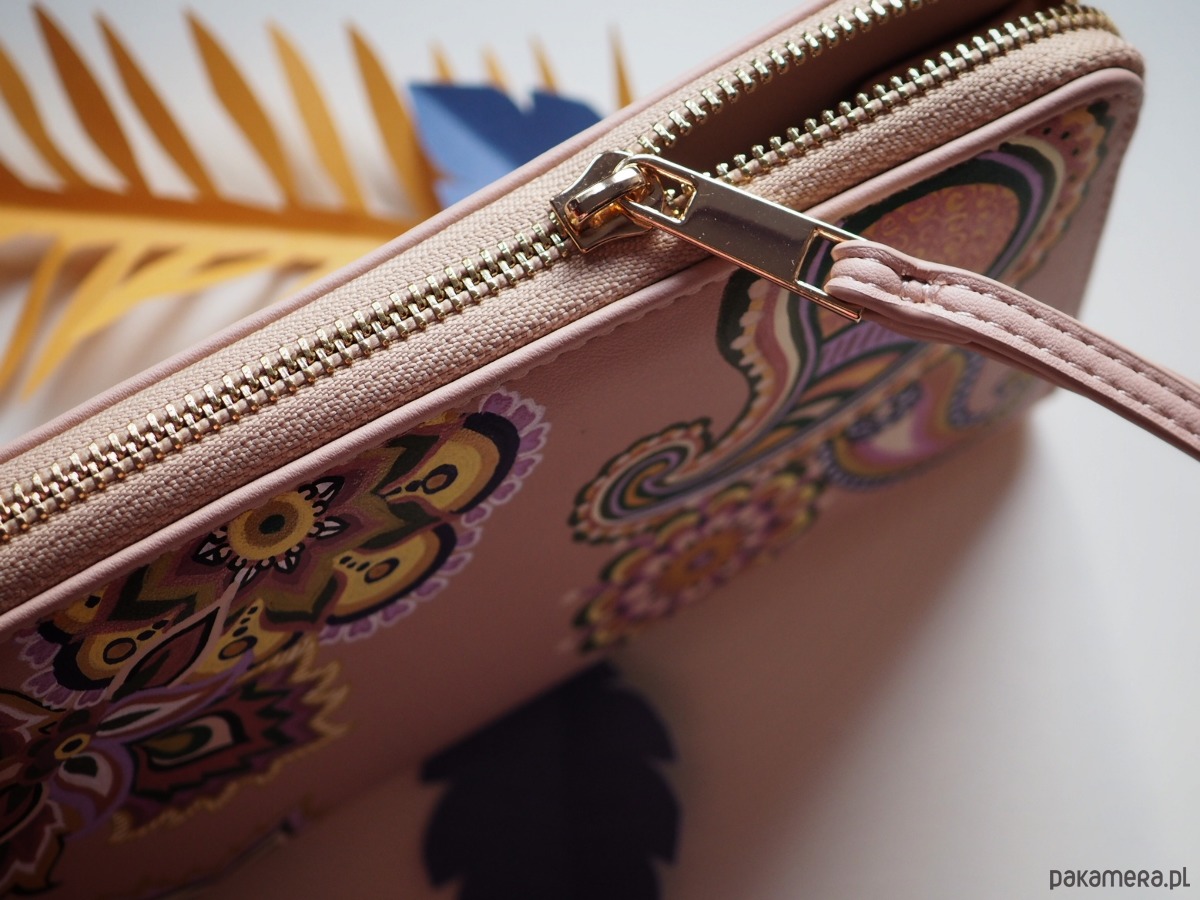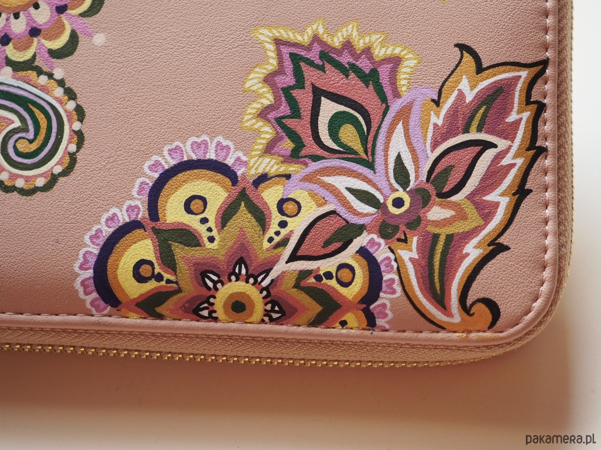 Beżowy portfel ze sztucznej skóry, zapinany na suwak, ozdobiony ręcznie malowanym wzorem paisley.
