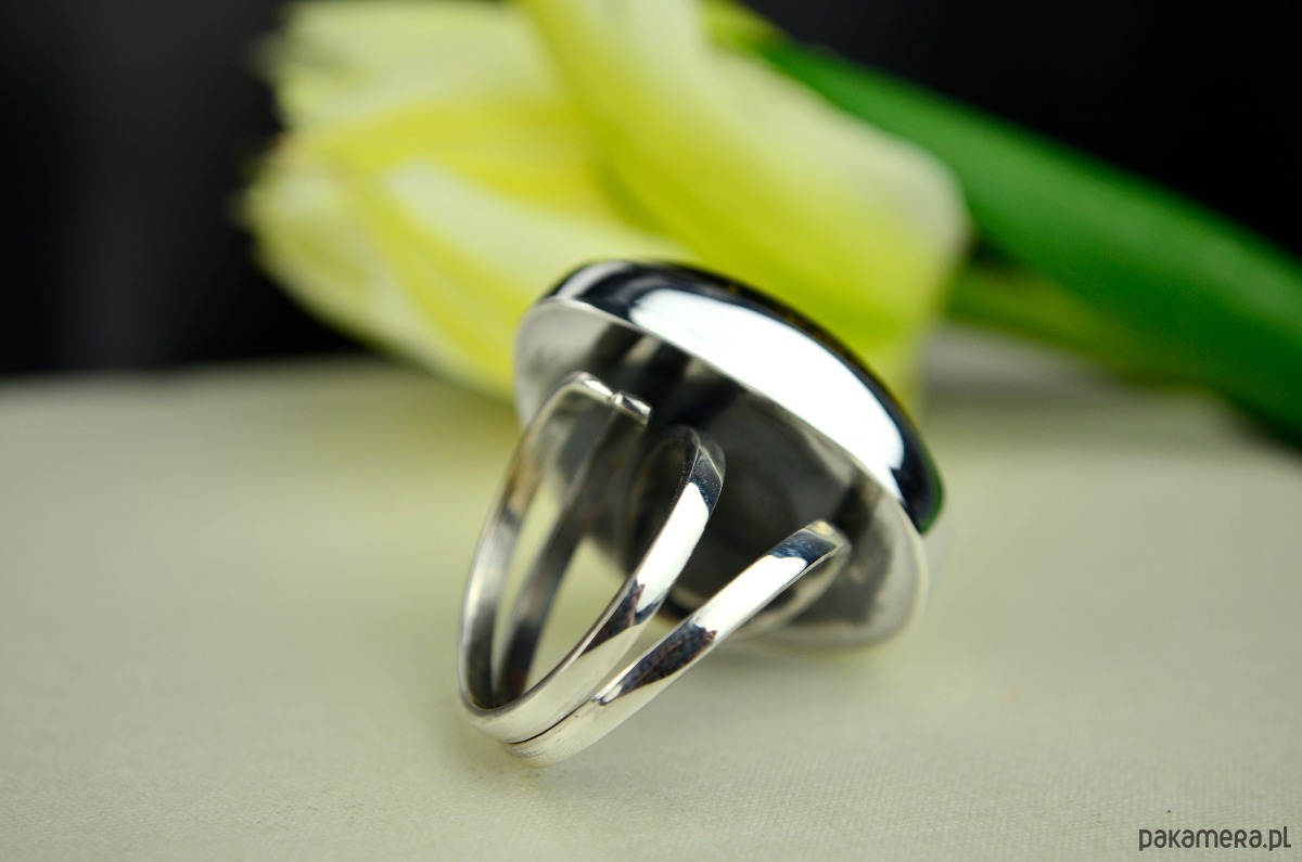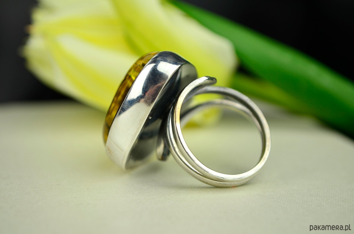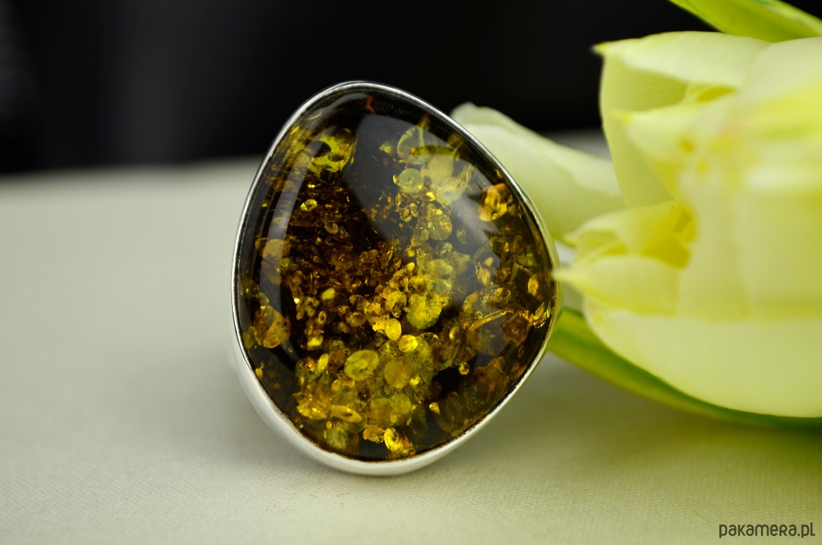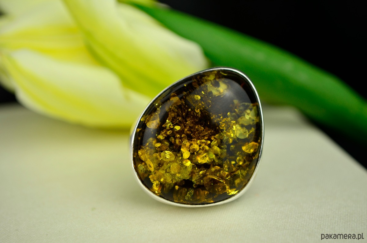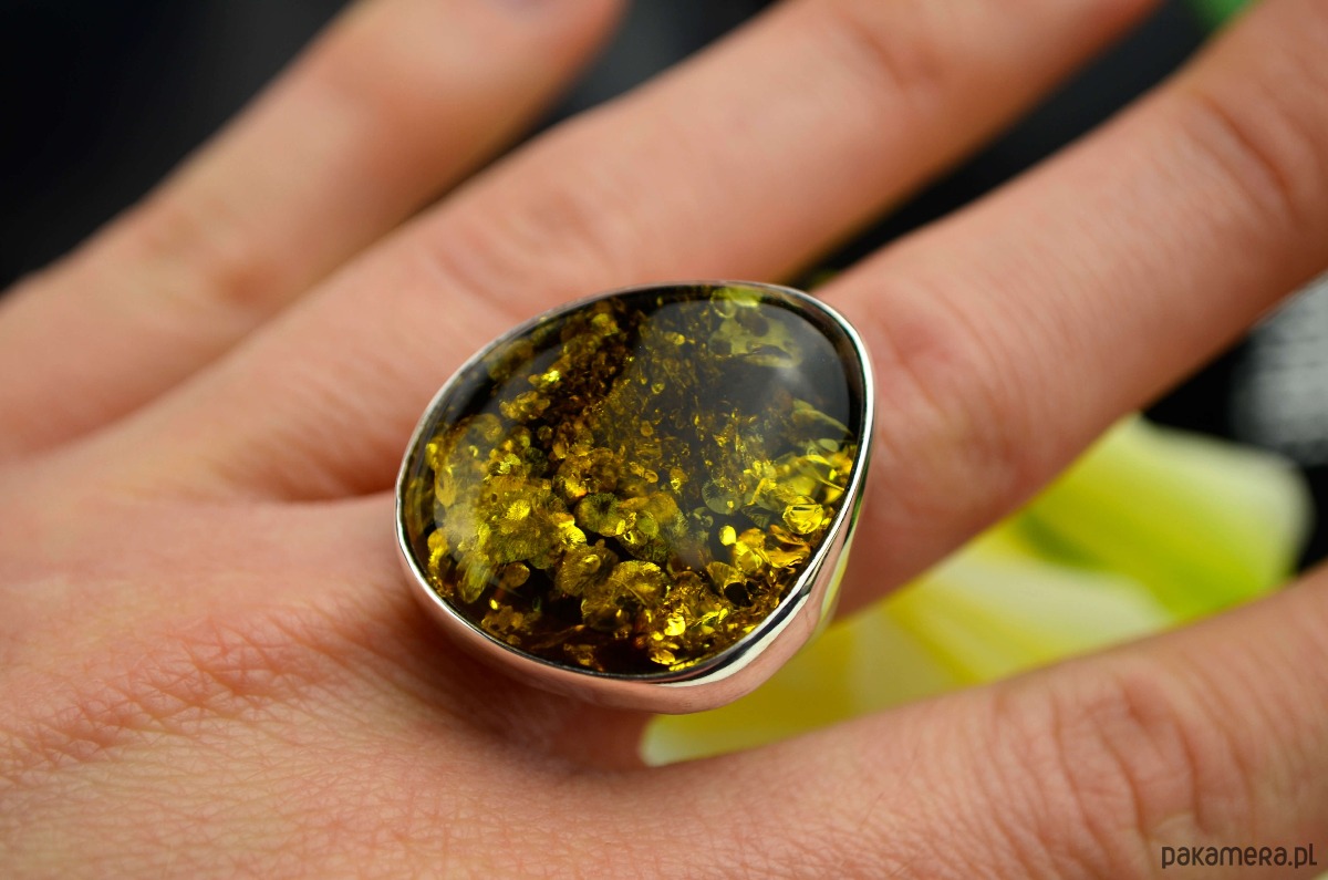 Duży pierścień ze srebra, który eksponuje piękno bursztynu wypełnionego po brzegi złocistymi łuskami. Ciemny bursztyn i jego złote łuski pięknie połyskują w słońcu i ciężko od niego oderwać wzrok. Wysoka jasna obwódka ze srebra podkreśla kolor bursztynu, a regulowana fantazyjna obrączka sprawia, że każdy może nosić to cacko. Srebro od wewnątrz biżuterii zostało przyciemnione.