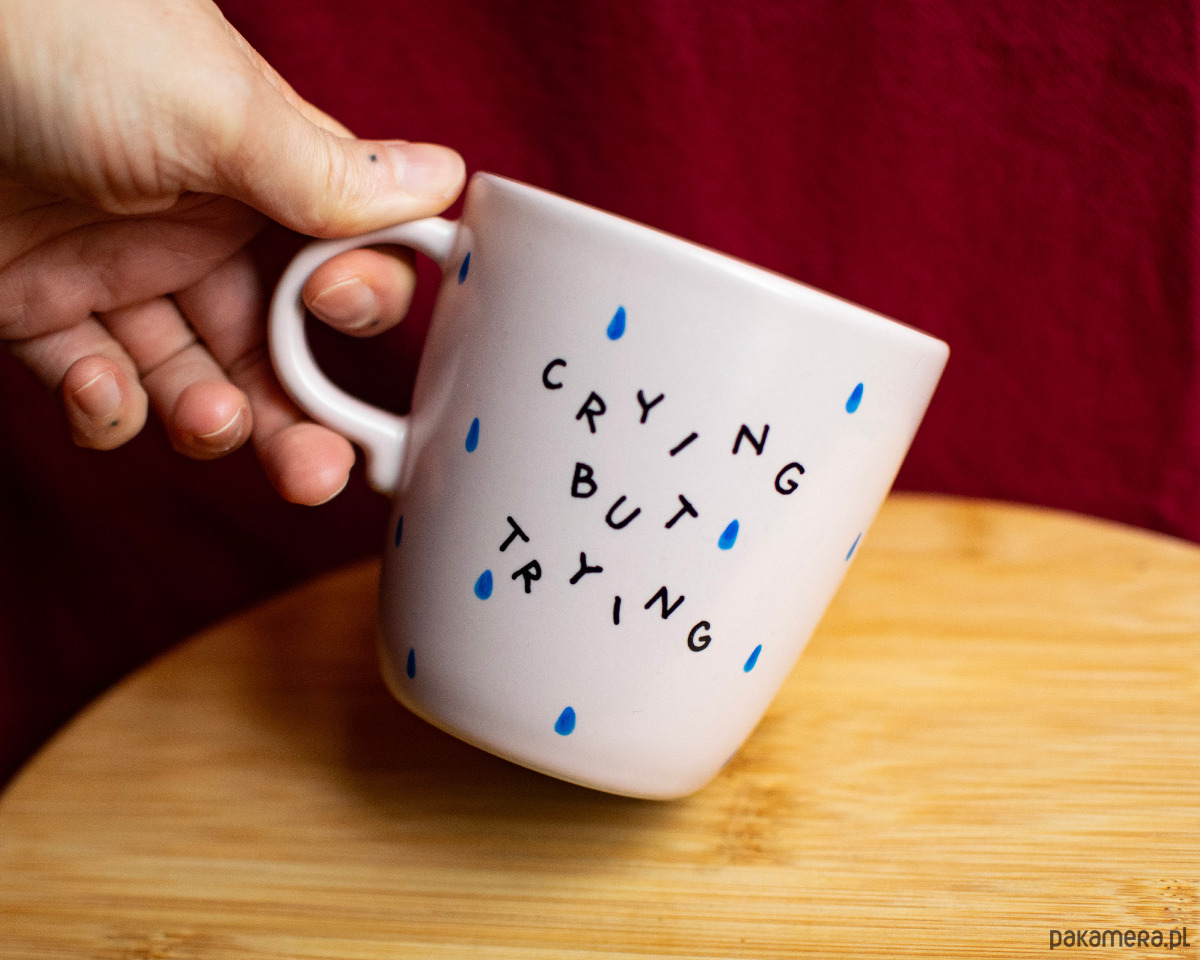 Ręcznie malowany różowy kubek z drugiego obiegu. Ozdobiony napisem CRYING BUT TRYING oraz niebieskimi kropelkami.