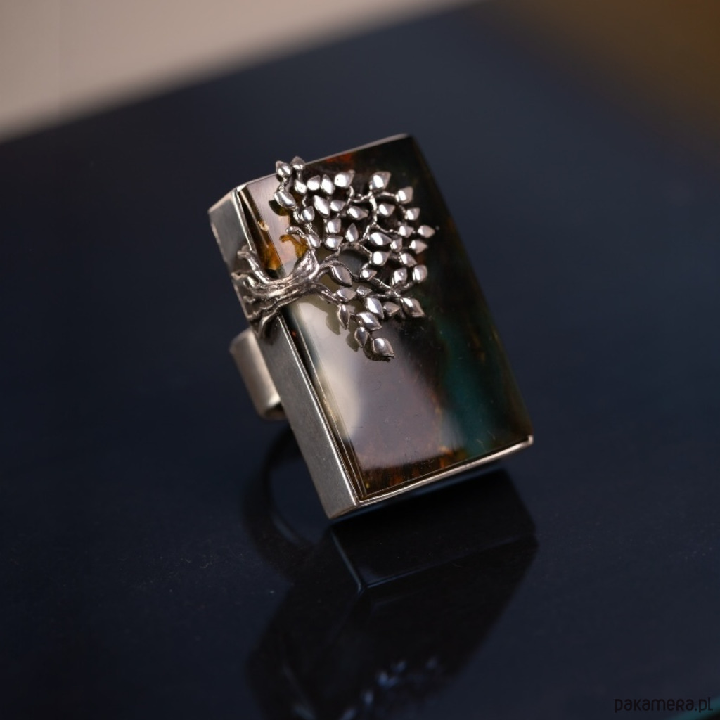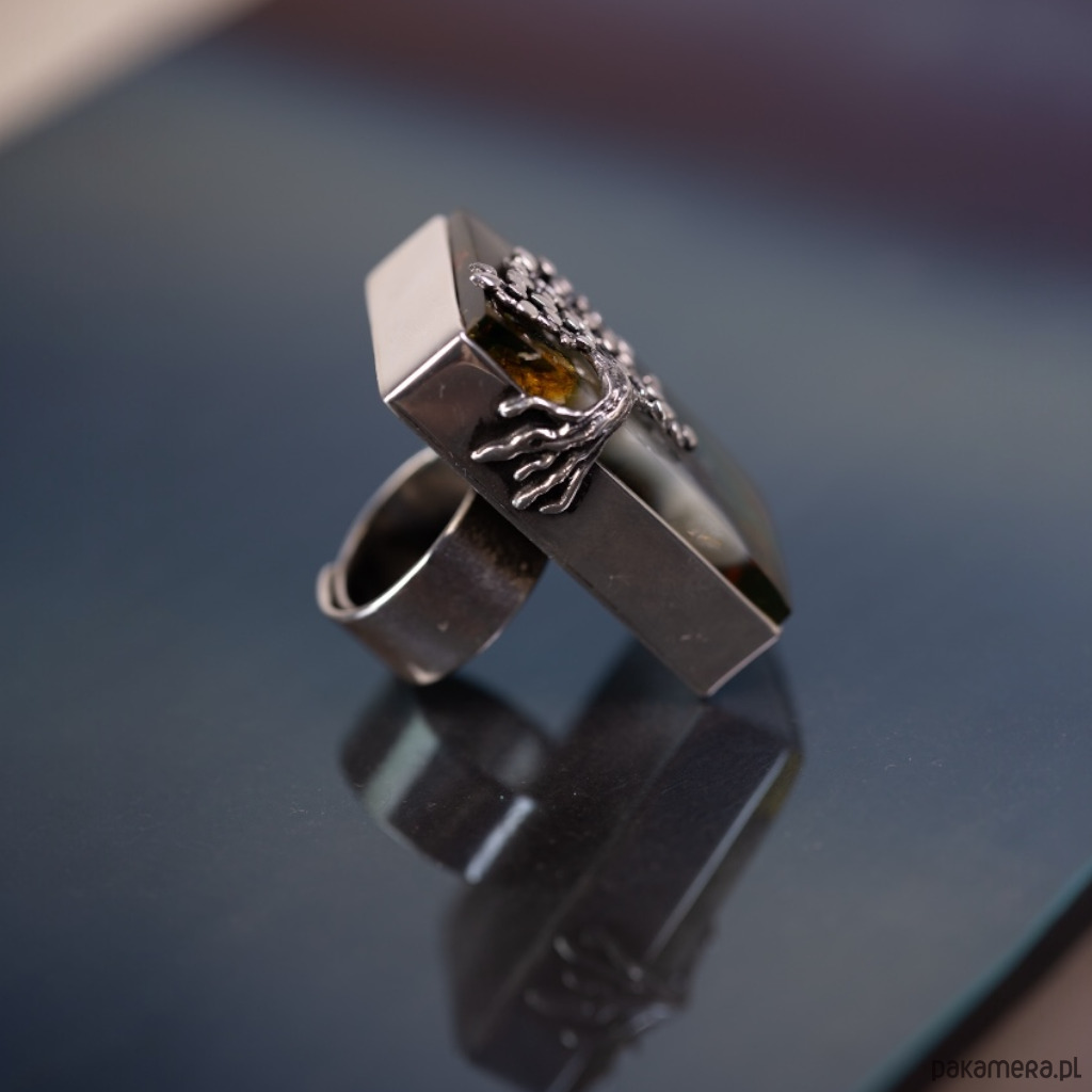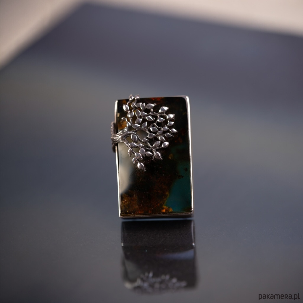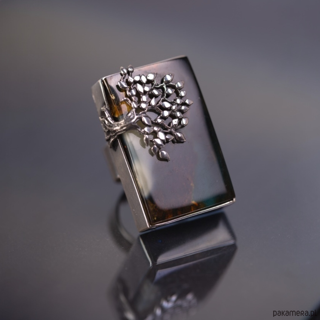 Duży, regulowany pierścień, na szerokiej obrączce ze srebra z pięknym, unikatowym bursztynem bałtyckim w głębokich, szlachetnych odcieniach. Gładką taflę bursztynu o tak wielu barwach, zdobi misternie wykonany motyw drzewa, który podkreśla wyjątkowy charakter biżuterii i sprawia, że pierścień mocno zaznacza się na dłoni. Regulowana obrączka pozwala wygodnie dopasować go do różnych palców i rozmiarów, dzięki czemu łatwo wkomponujesz go w swoje codzienne i wieczorowe stylizacje.