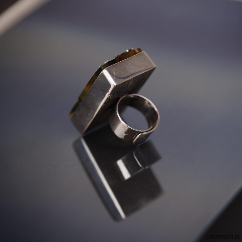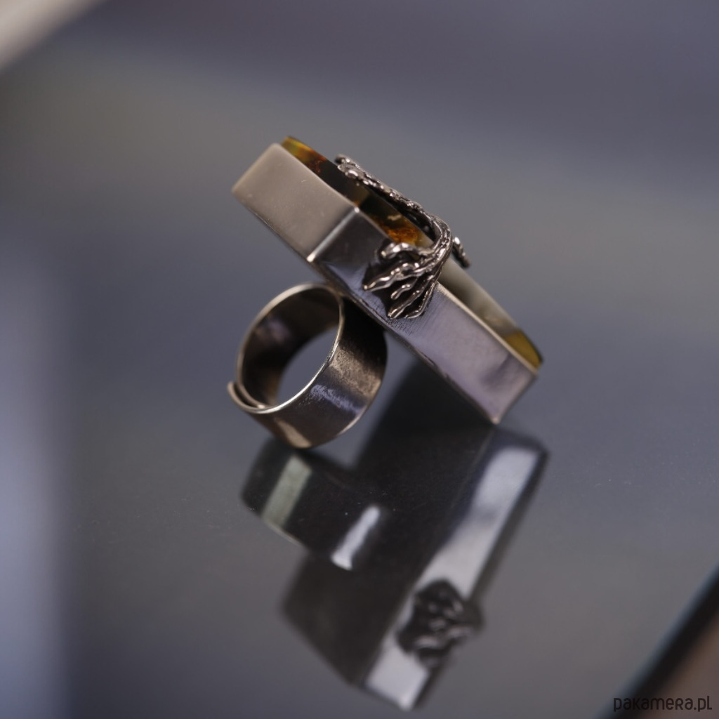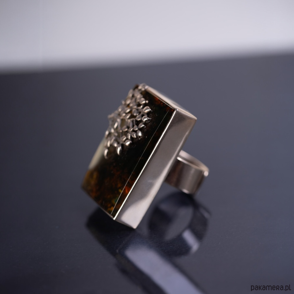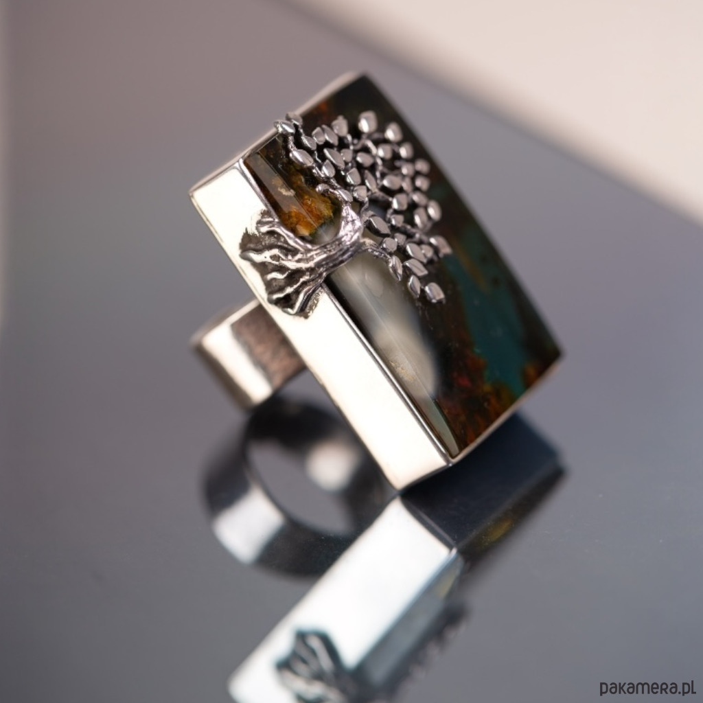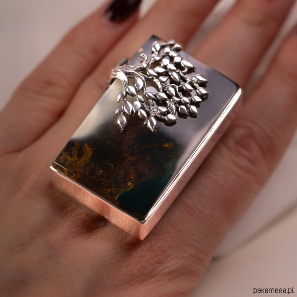 Duży, regulowany pierścień, na szerokiej obrączce ze srebra z pięknym, unikatowym bursztynem bałtyckim w głębokich, szlachetnych odcieniach. Gładką taflę bursztynu o tak wielu barwach, zdobi misternie wykonany motyw drzewa, który podkreśla wyjątkowy charakter biżuterii i sprawia, że pierścień mocno zaznacza się na dłoni. Regulowana obrączka pozwala wygodnie dopasować go do różnych palców i rozmiarów, dzięki czemu łatwo wkomponujesz go w swoje codzienne i wieczorowe stylizacje.