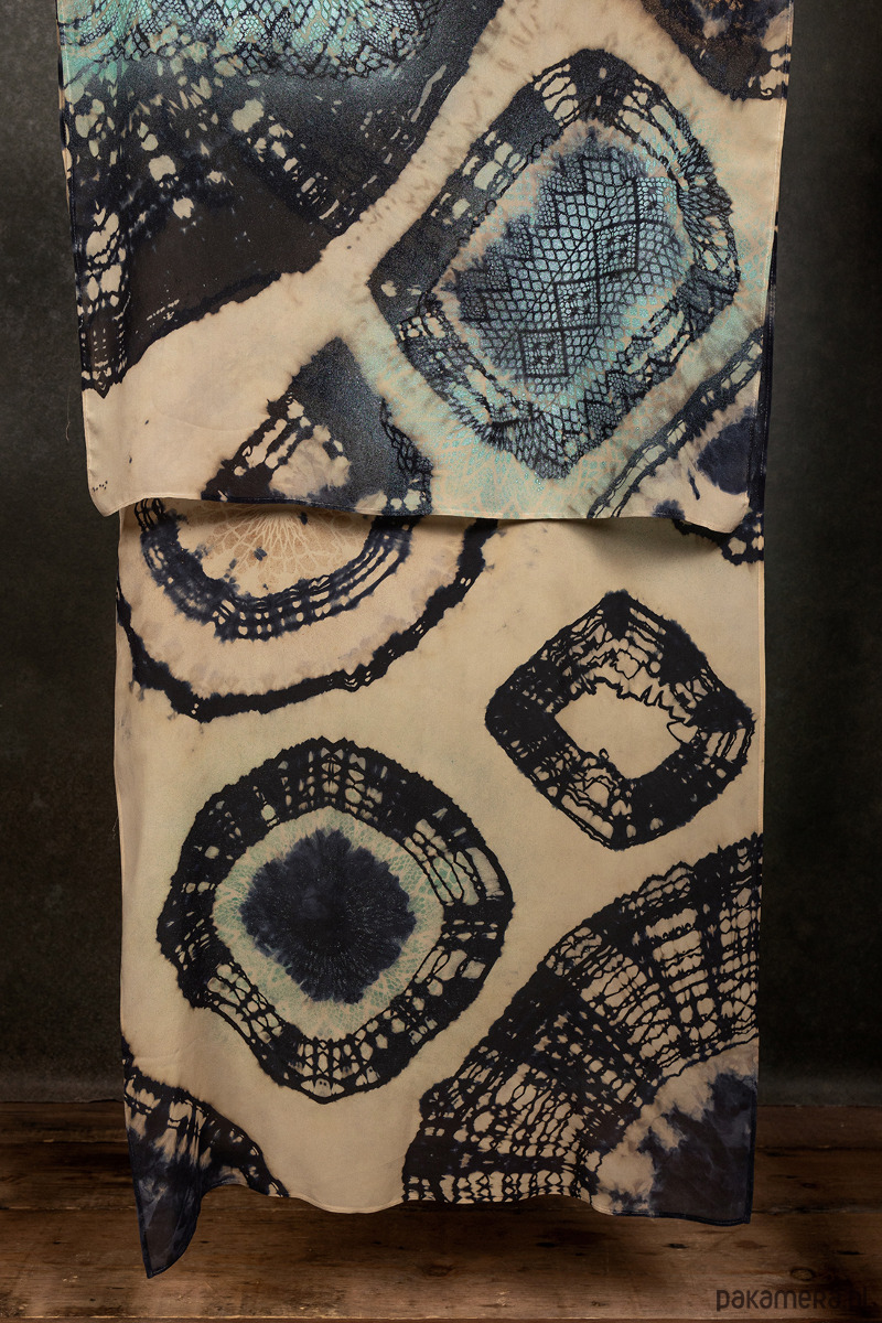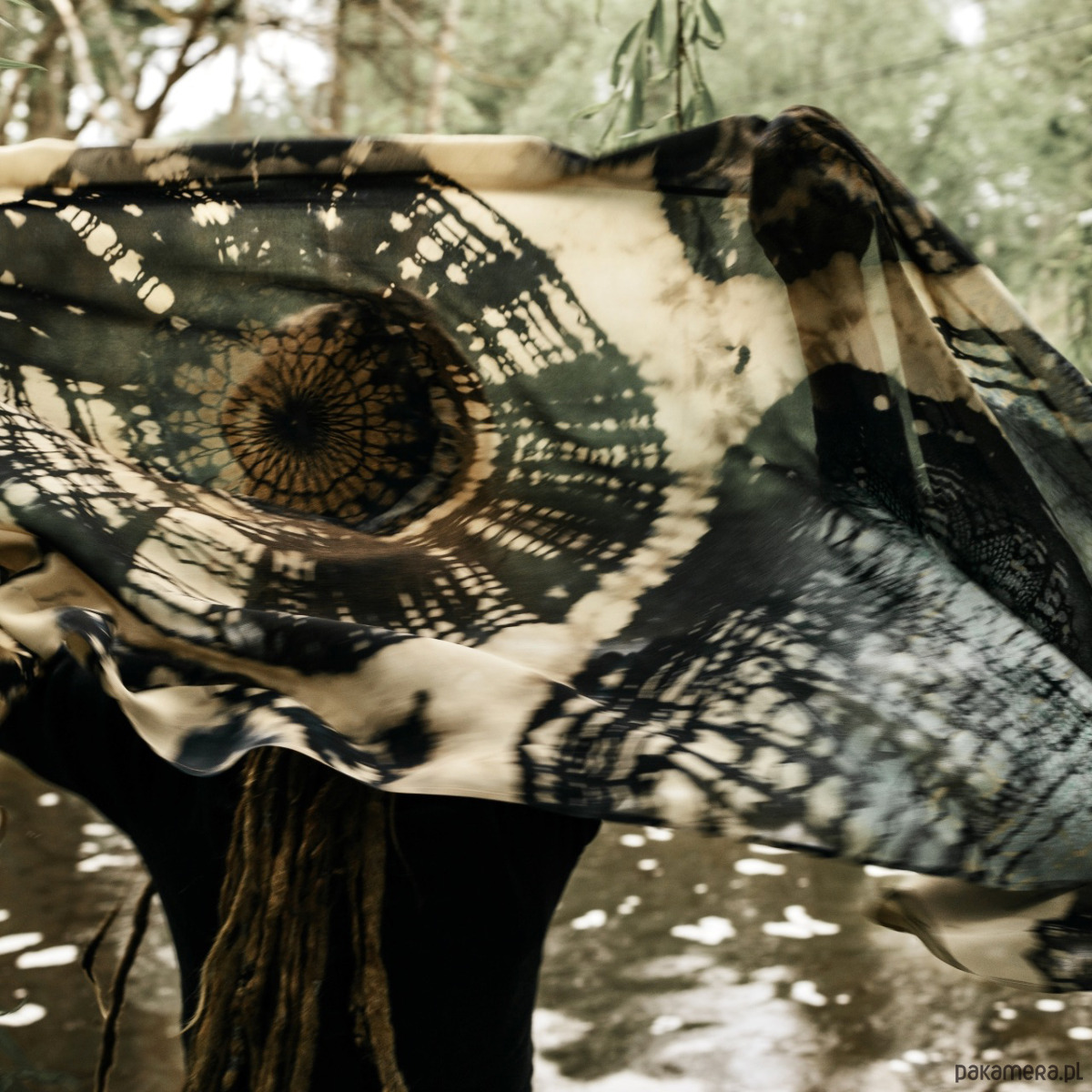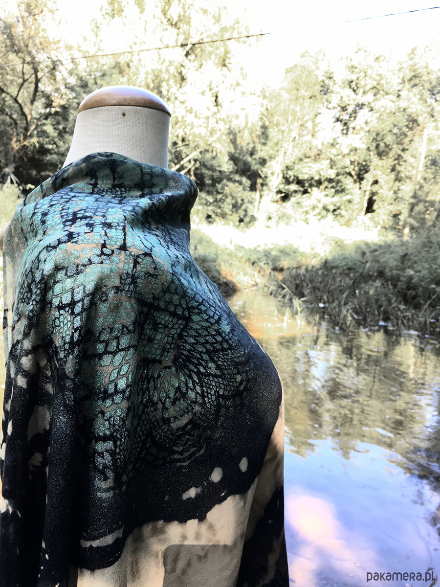 Duży, autorski szal jedwabny MANDALA-RIVER wykonany z żorżety ( 100% pure Silk ) półprzezroczystej w jednym, niepowtarzalnym egzemplarzu. Kolorystyka : zestawienie starego złota i błyszczącego turkusu z matem grafitowej czeni i beżu. Wykonany wieloma różnymi technikami.Idealny na nadrzeczną medytację i wytworne przyjęcie. Każdą wyciągniętą z szafy sukienkę przerobi na nową kreację. Na plaży zrobisz z niego sarong, albo luksusowe miejsce do leżenia : ) Wymiary: długość 180 cm, szerokość 64 cm . Projekt i wykonanie Matylda Leśnikowska. Nie wykonuję zamówień, nie powtarzam projektów zgodnie z filozofia IMADEONE : )