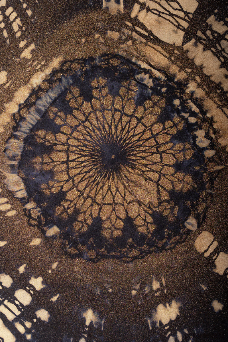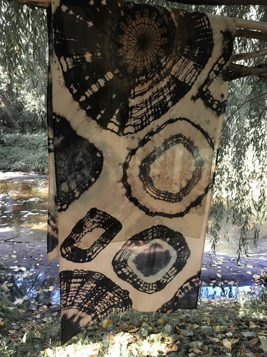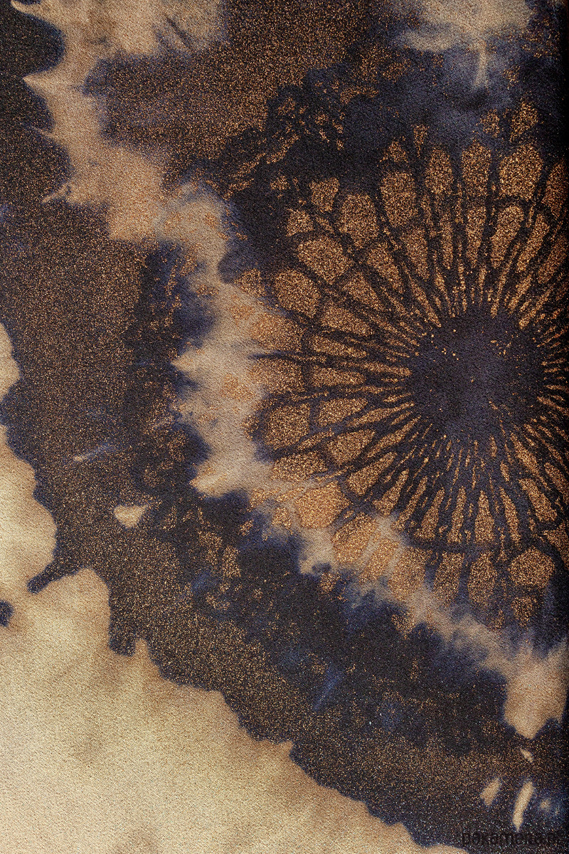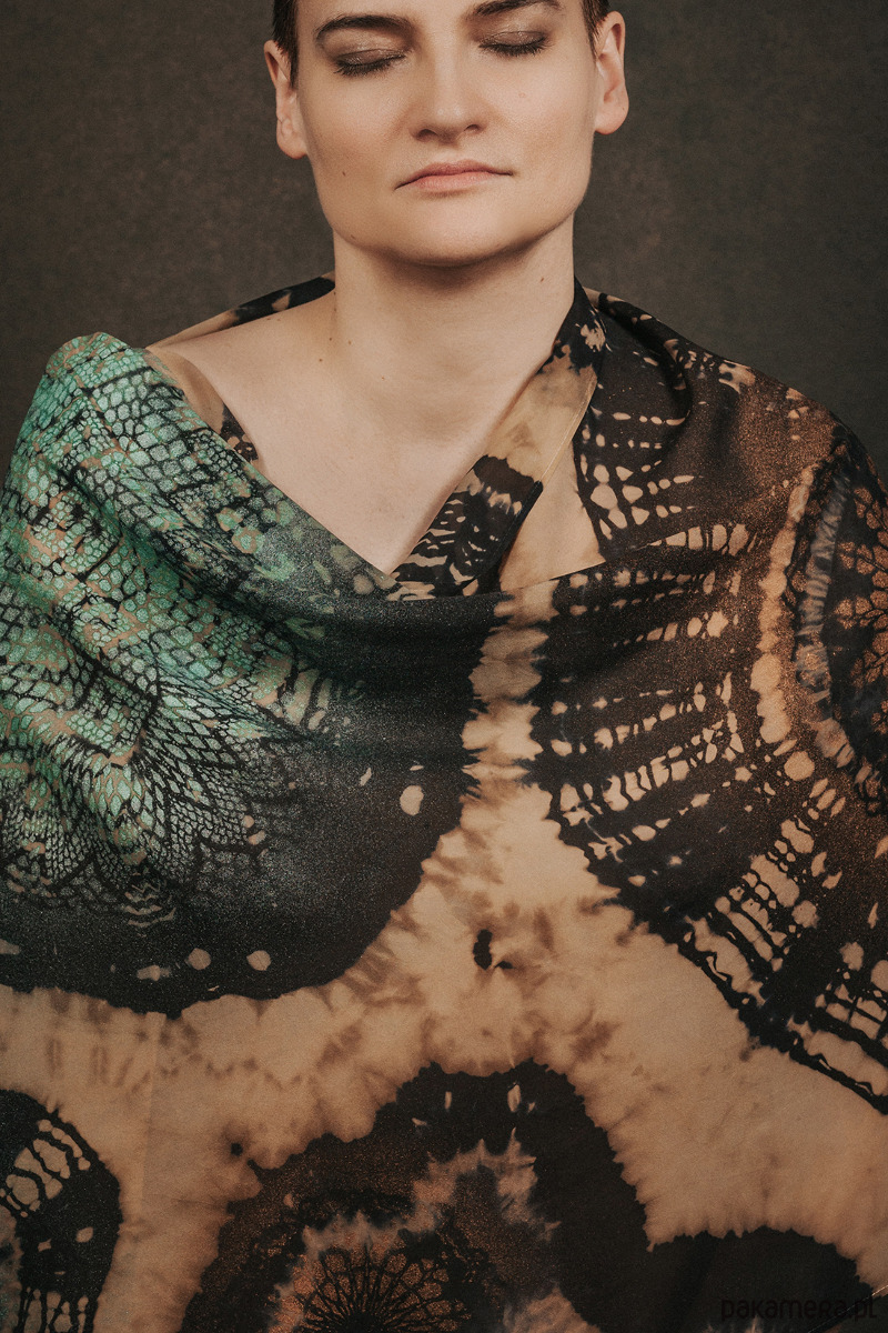 Duży, autorski szal jedwabny MANDALA-RIVER wykonany z żorżety ( 100% pure Silk ) półprzezroczystej w jednym, niepowtarzalnym egzemplarzu. Kolorystyka : zestawienie starego złota i błyszczącego turkusu z matem grafitowej czeni i beżu. Wykonany wieloma różnymi technikami.Idealny na nadrzeczną medytację i wytworne przyjęcie. Każdą wyciągniętą z szafy sukienkę przerobi na nową kreację. Na plaży zrobisz z niego sarong, albo luksusowe miejsce do leżenia : ) Wymiary: długość 180 cm, szerokość 64 cm . Projekt i wykonanie Matylda Leśnikowska. Nie wykonuję zamówień, nie powtarzam projektów zgodnie z filozofia IMADEONE : )