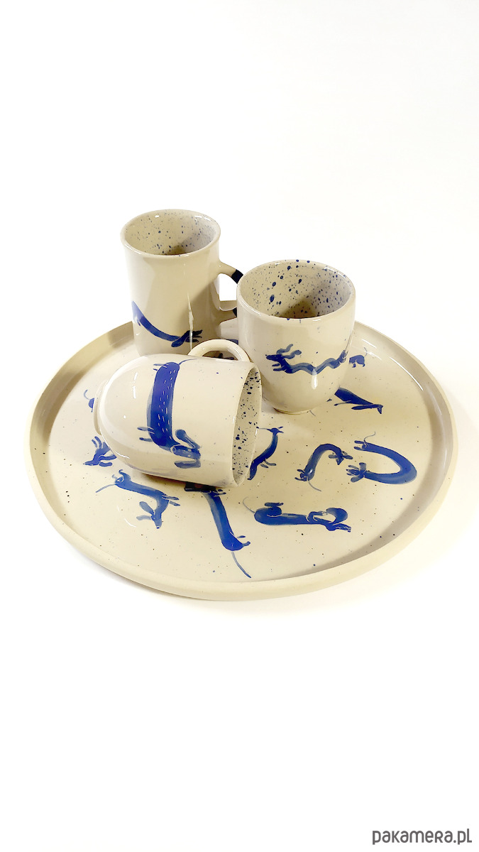 Duży, ozdobny półmisek z grafiką przedstawiającą jamniczki. Grafika ręcznie malowana farbą podszkliwną w kolorze niebieskim. Talerz wykonany z wysokiej jakości kremowej gliny,100% handmade, wypalany dwukrotnie, szkiwiony wewnątrz transparentnym, błyszczącym szkliwem. Sygnowany. Zastosowane szkliwo nadaje się do kontaktu z żywnością. Talerz można myć w zmywarce.
