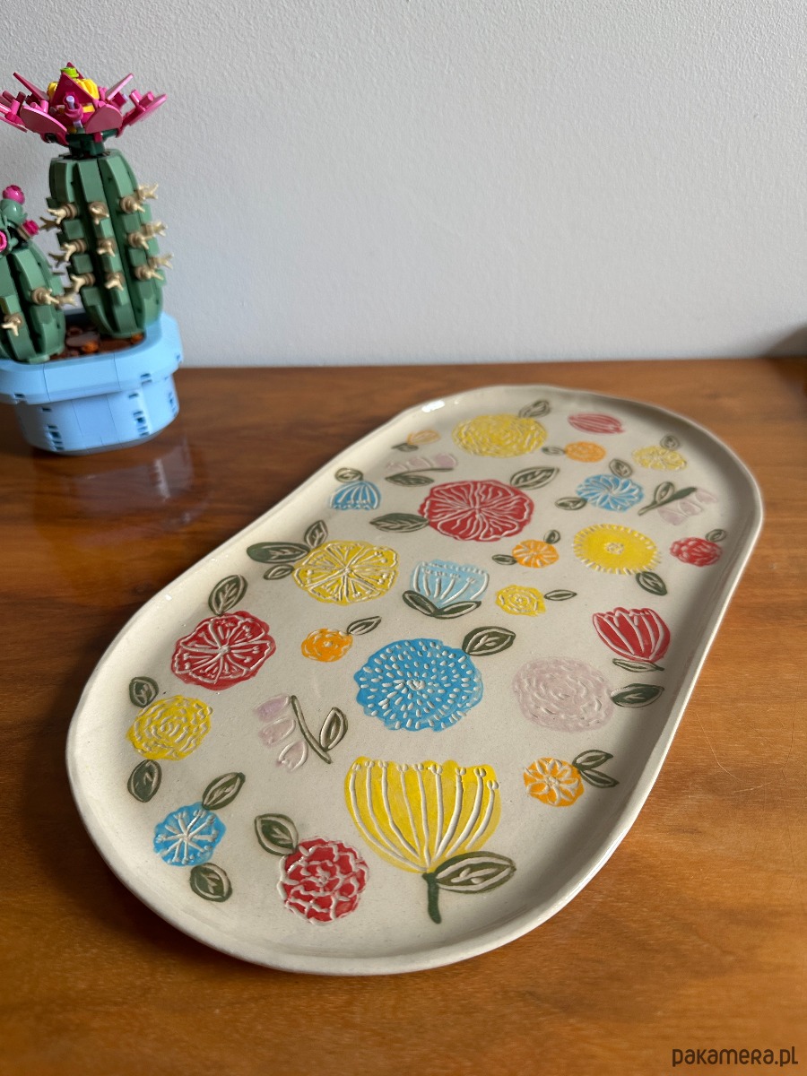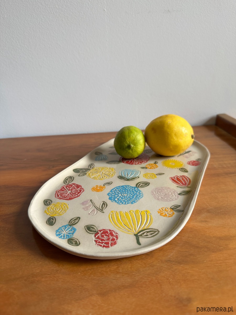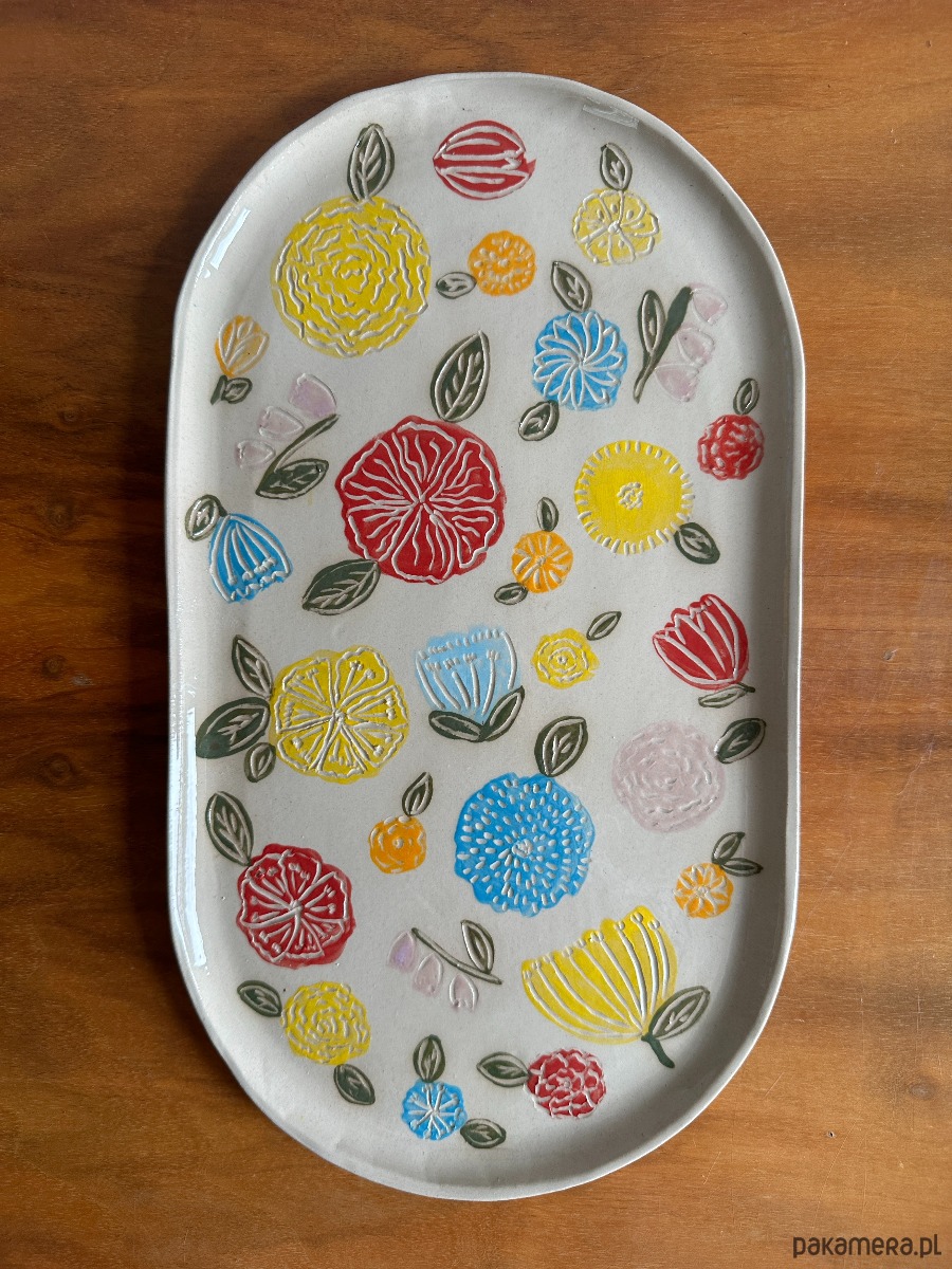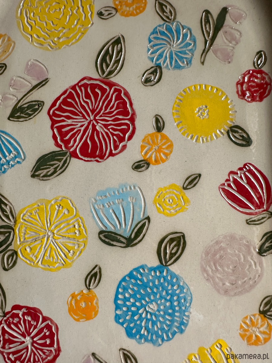 Wyjątkowa patera, która przyciąga wzrok subtelną formą i radosnym, kwiatowym wzorem. Każdy detal został wykonany ręcznie i ozdobiony techniką sgraffito, dzięki czemu wzór jest trwały i niepowtarzalny.