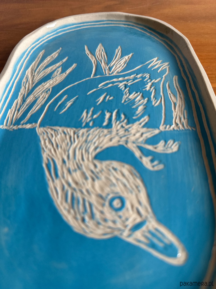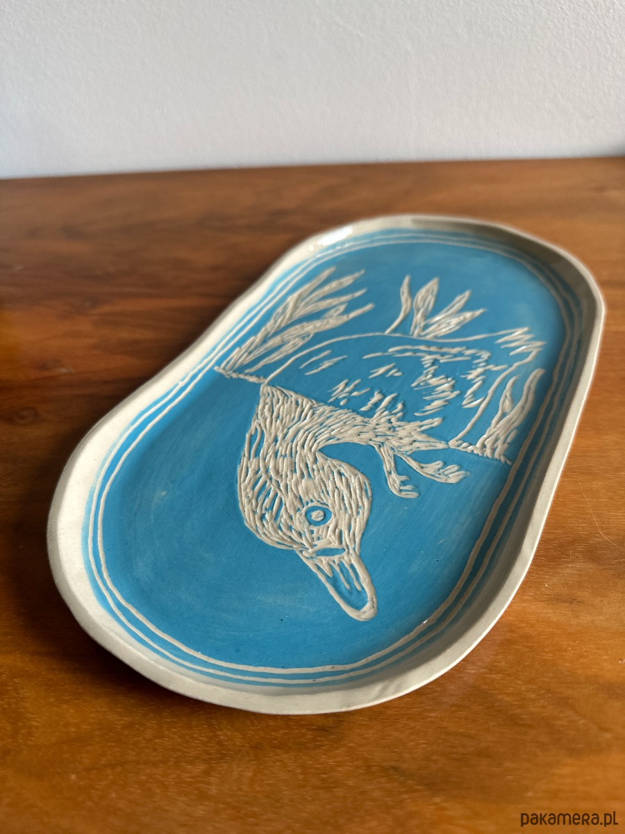 Unikatowy talerzyk ceramiczny z subtelnym, artystycznym motywem kaczki na tle spokojnej tafli wody i roślinności. Całość utrzymana w głębokim odcieniu niebieskiego, który pięknie podkreśla ręcznie wykonane zdobienia.