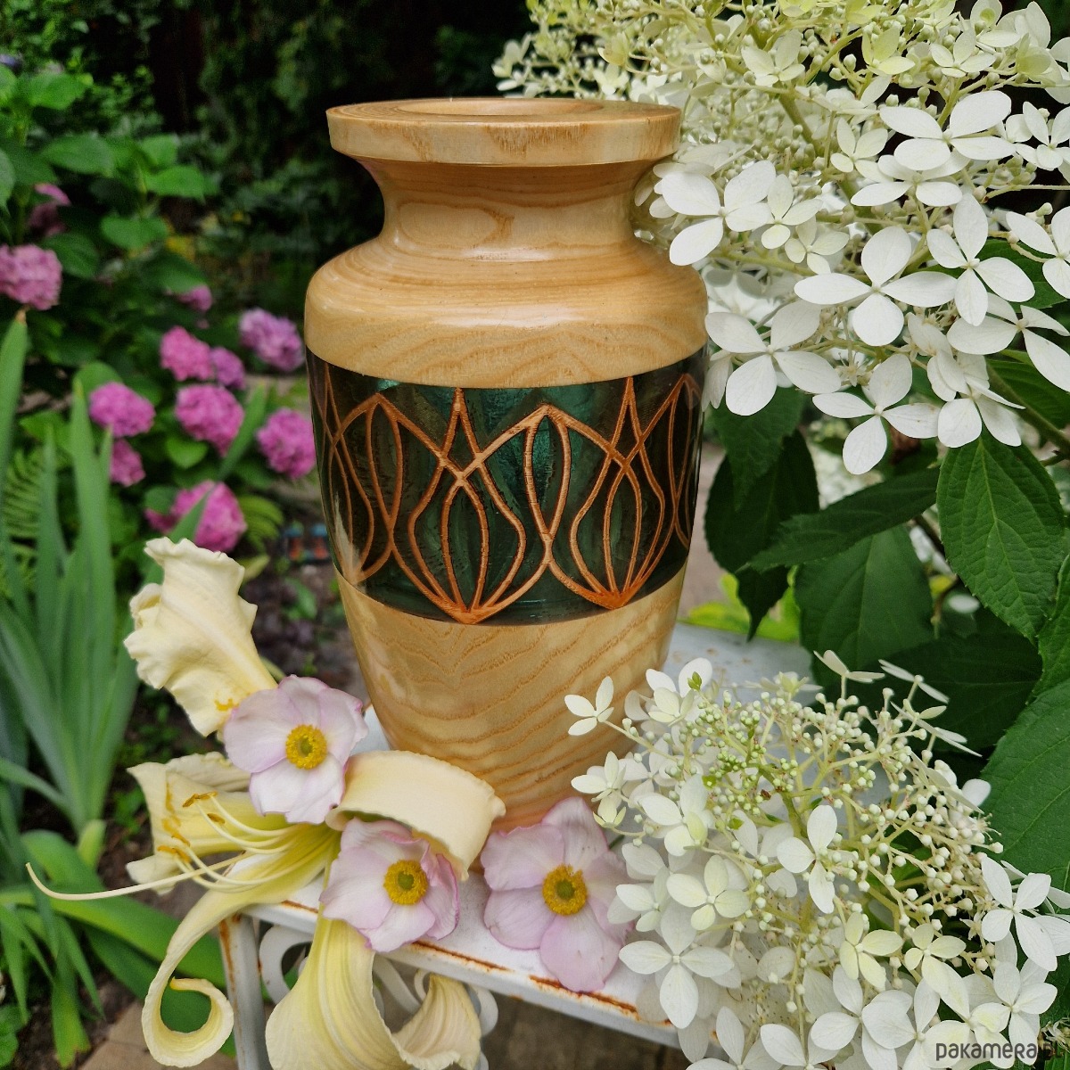 Nasz ręcznie wykonany wazon nawiązuje do tej symboliki poprzez miedziane wzory tulipanów zawieszone w zielonej żywicy epoksydowej. Wzór przepływa przez otwarte słoje drewna jesionowego, odzwierciedlając sylwetkę kwiatu. Wazon ma klasyczny kształt - wyważony, ponadczasowy i praktyczny. Jest w pełni wodoodporny i pokryty wewnątrz powłoką ochronną. Szeroka, stabilna podstawa z łatwością podtrzymuje kwiaty o długich łodygach. Głębokie odcienie zieleni dobrze komponują się z liśćmi i bogatymi kwiatami, takimi jak róże.