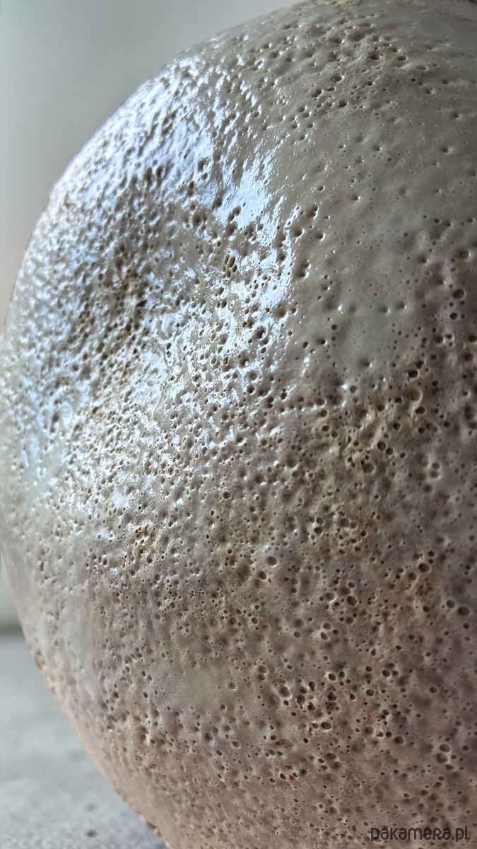 Wewnątrz wazon pokryty jest białym satynowym szkliwem, które zabezpiecza wazon przed przepuszczeniem wody. Na zewnątrz szkliwo efektowe nadające strukturę kamieni.