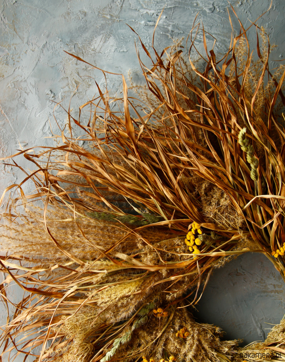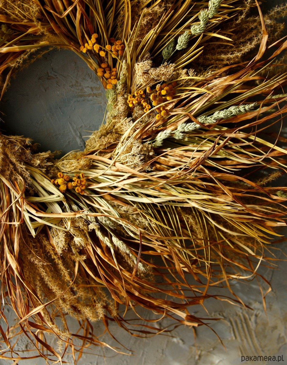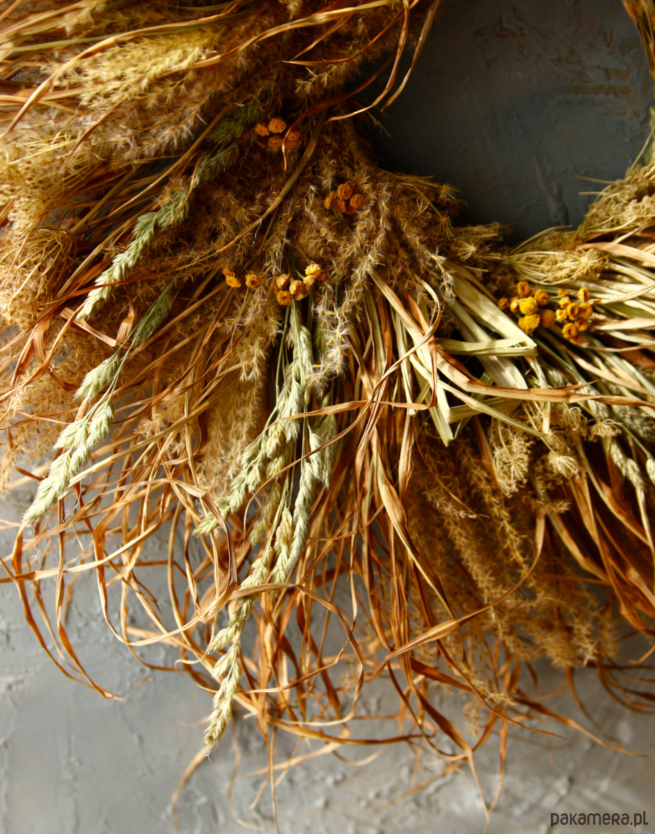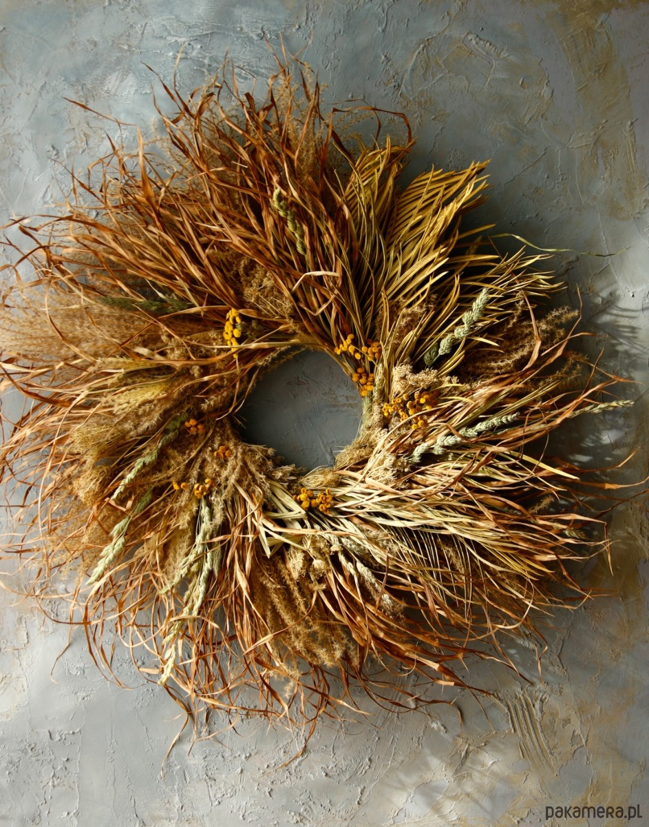 Duży, ekspresyjny wianek z miskantu, o surowym mocno siankowym charakterze, wpisuje się w estetykę wabi-sabi. Wykonany ręcznie z naturalnych traw, zachwyca nieregularnością, lekkością i dziką formą. Dekoracja na drzwi lub ścianę.