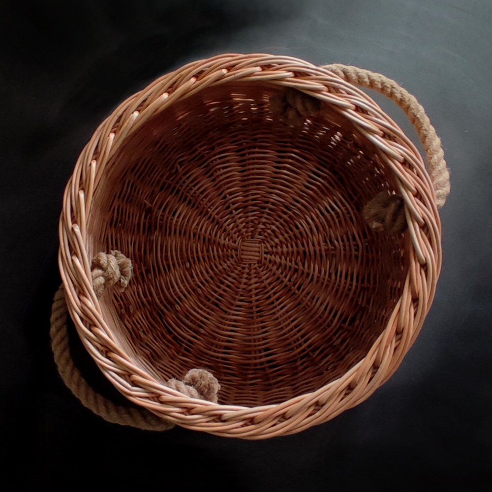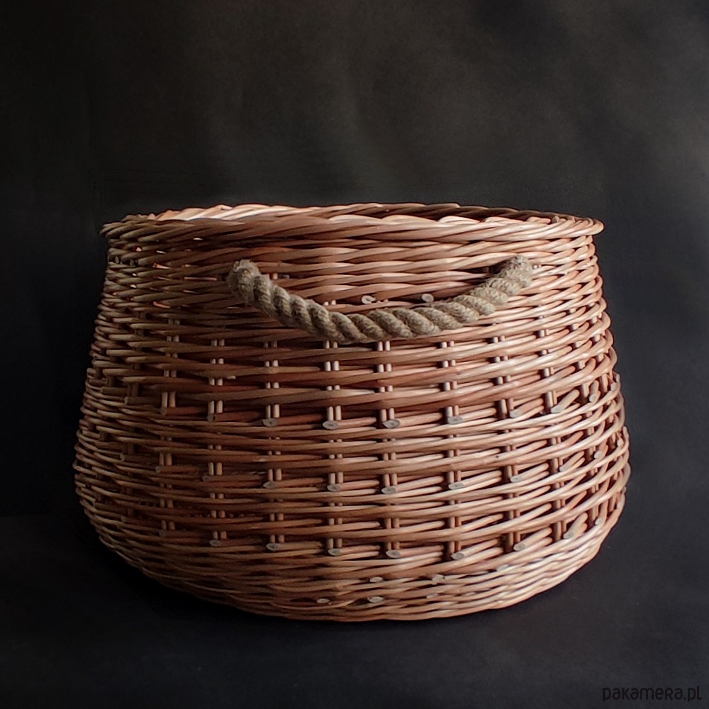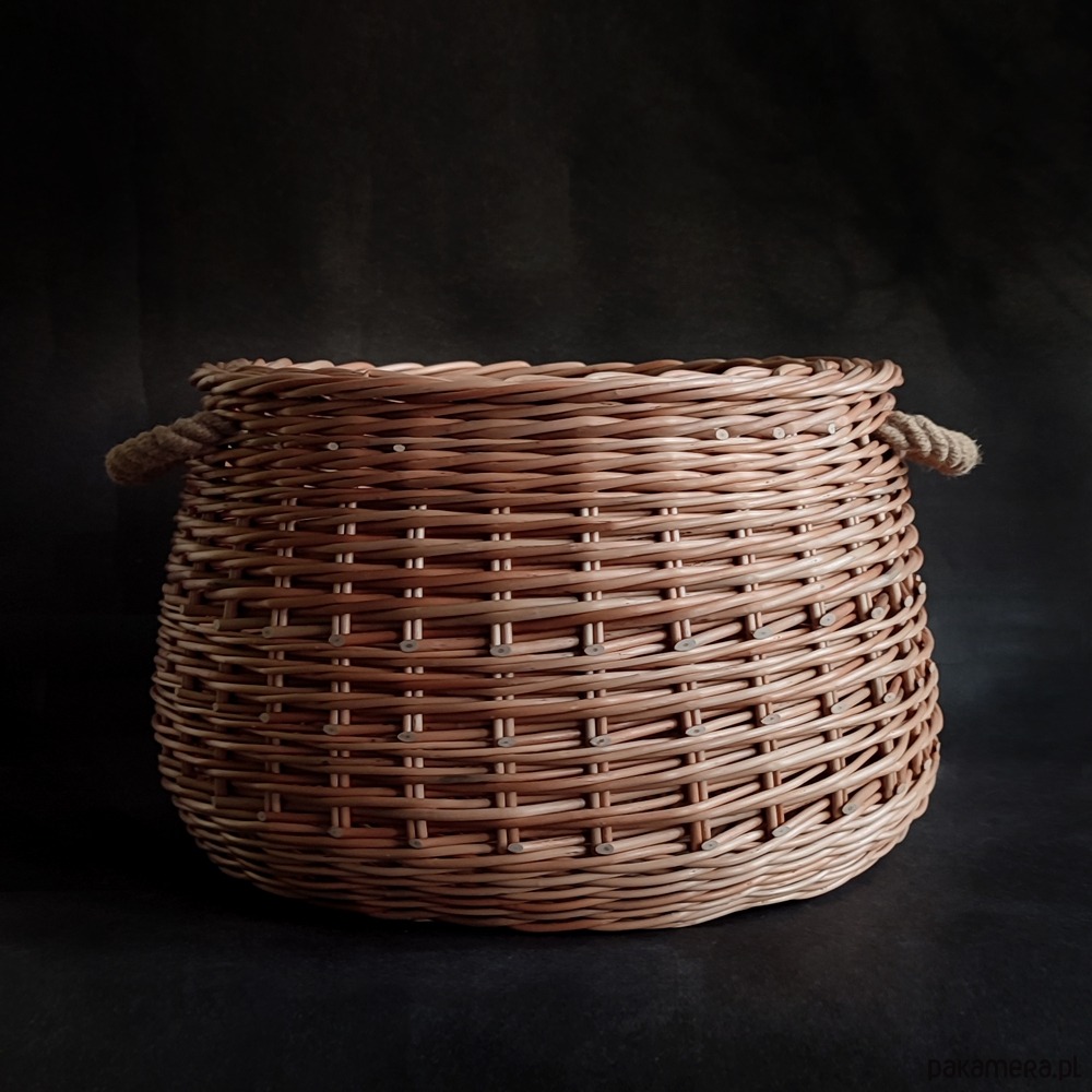 Duży wiklinowy kosz, wypleciony na okrągłym dnie. Ma bardzo mocną konstrukcję i wygodne uchwyty z grubej jutowej liny.