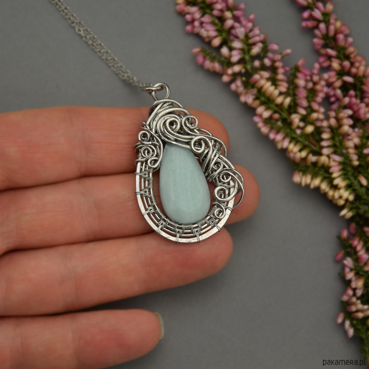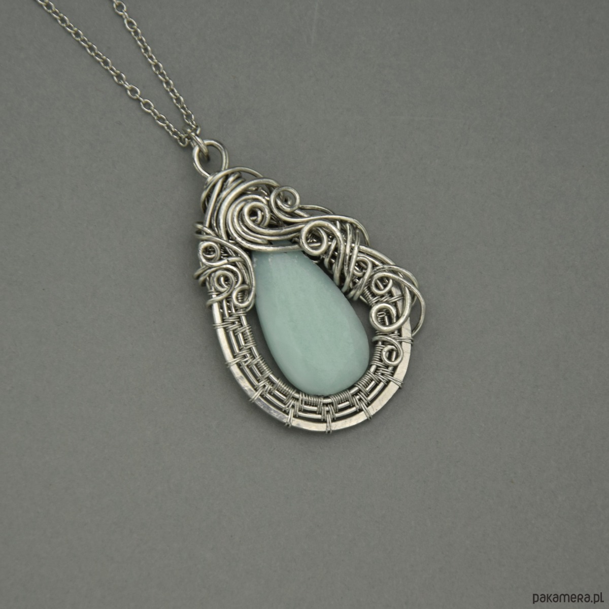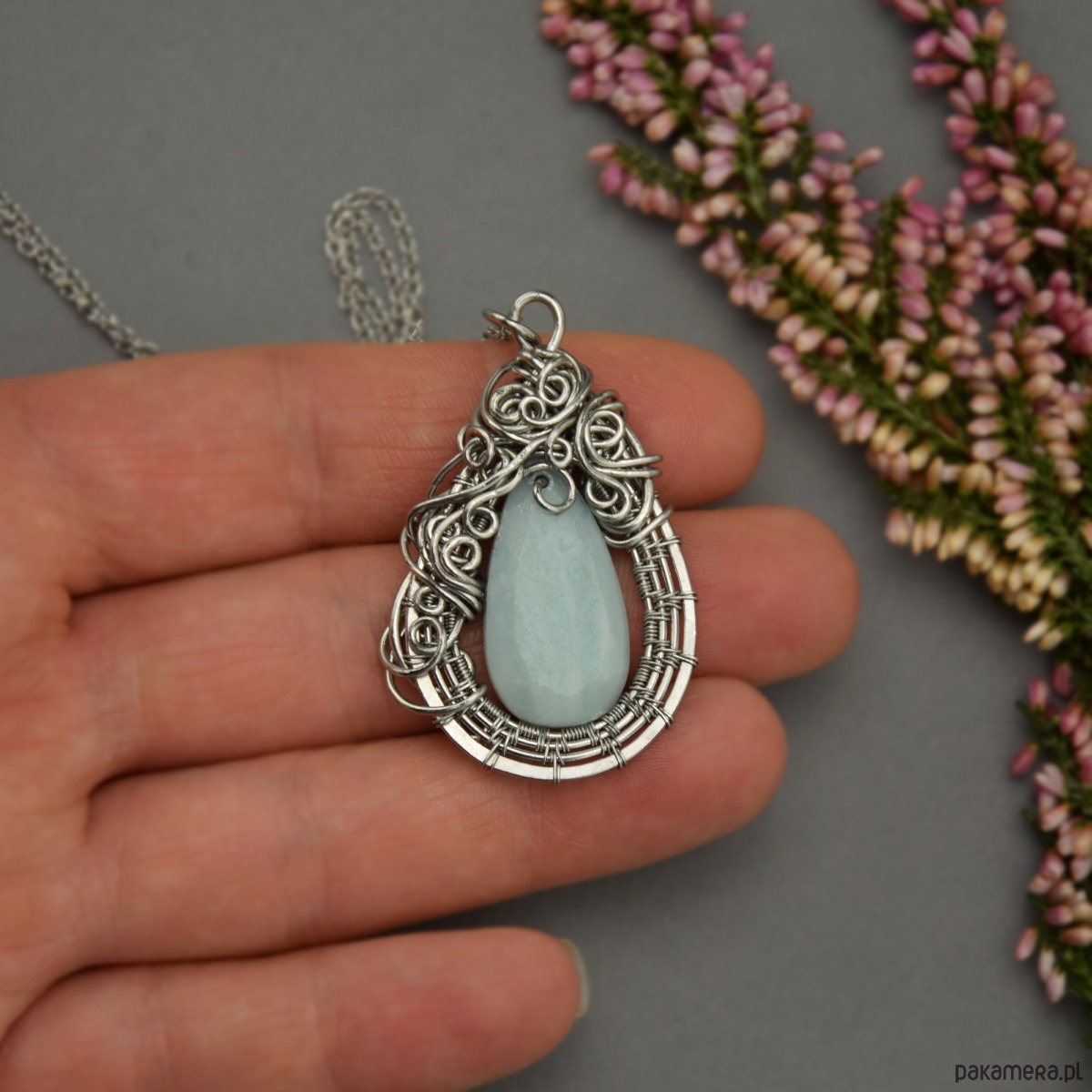 Unikatowy wisior z łezką amazonitu, wykonany ręcznie techniką wire wrapping z drutów ze stali chirurgicznej.