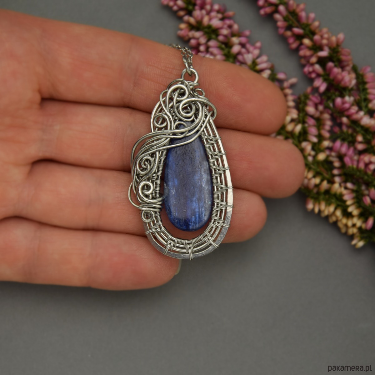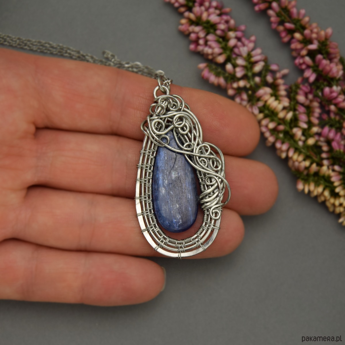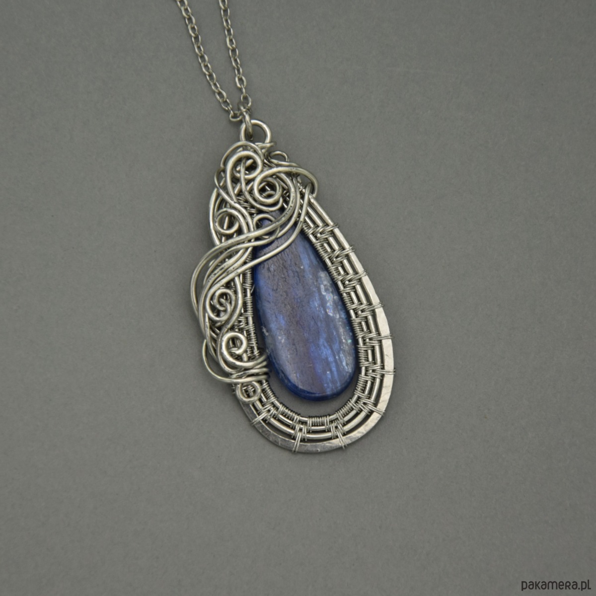 Unikatowy wisior z łezką kyanitu, wykonany ręcznie techniką wire wrapping z drutów ze stali chirurgicznej.