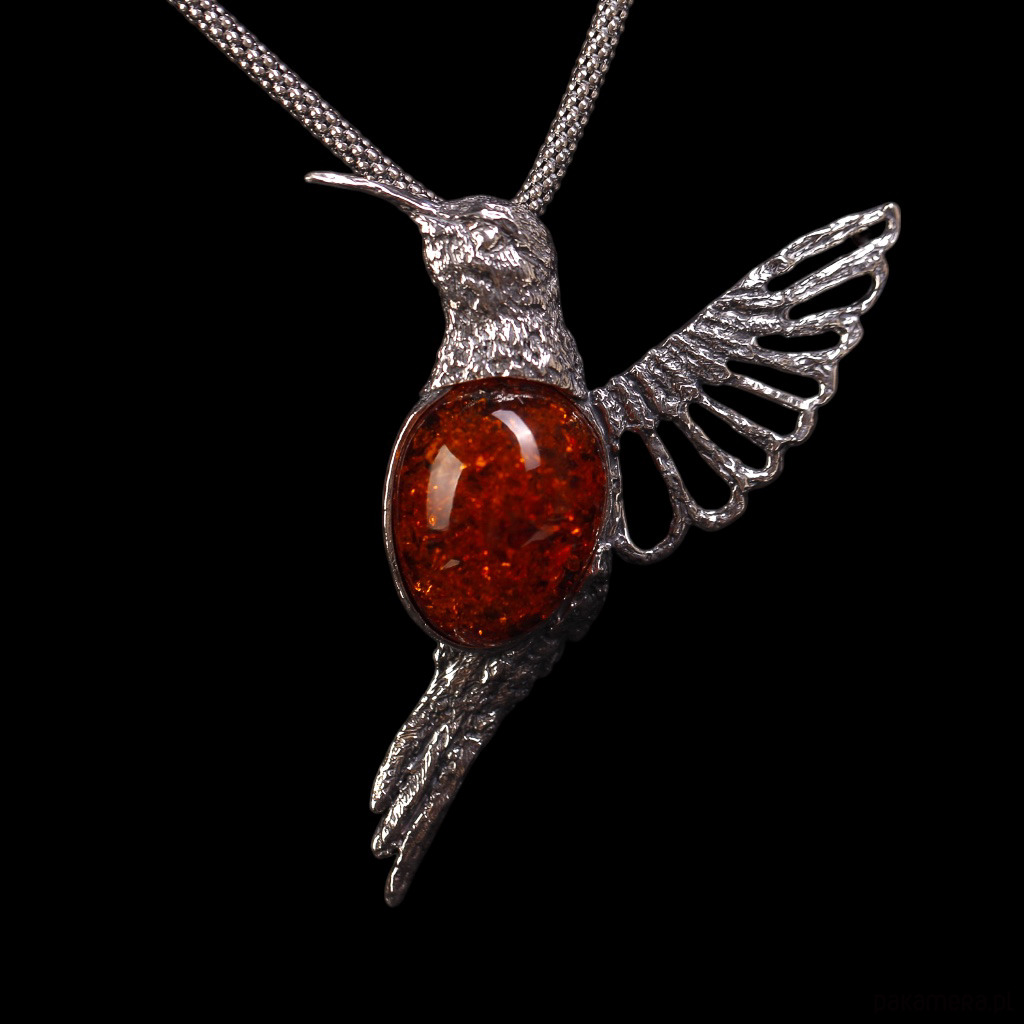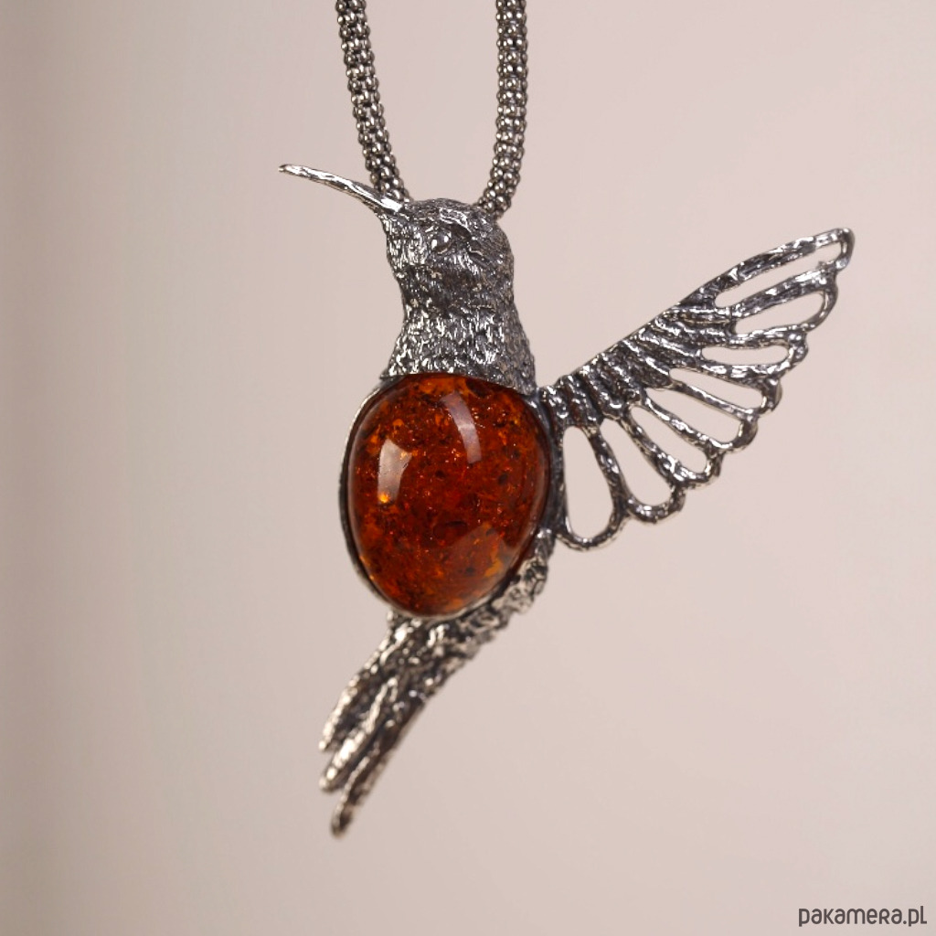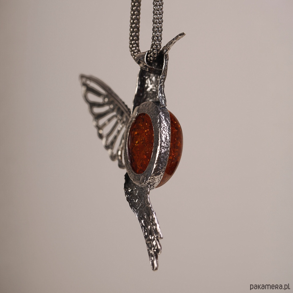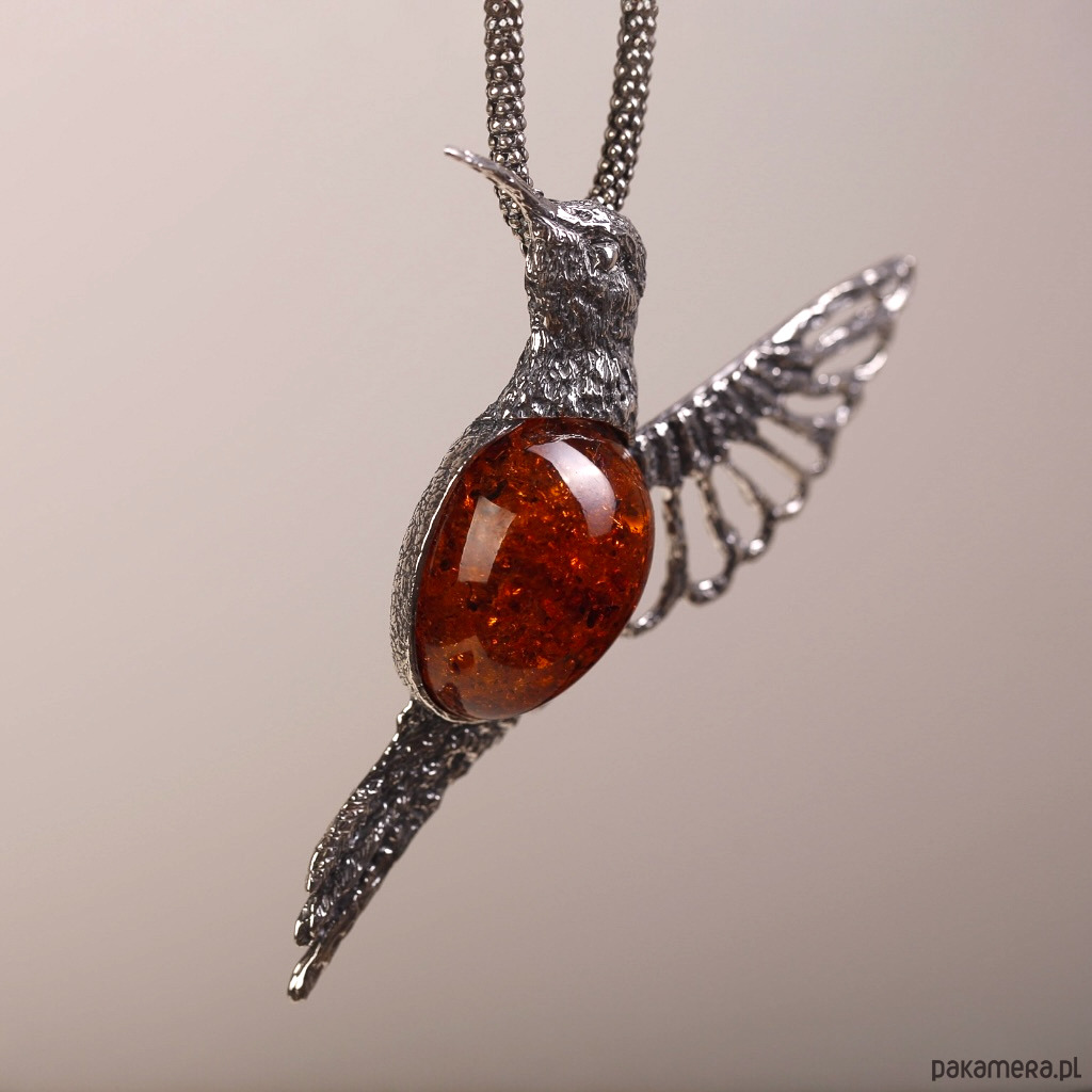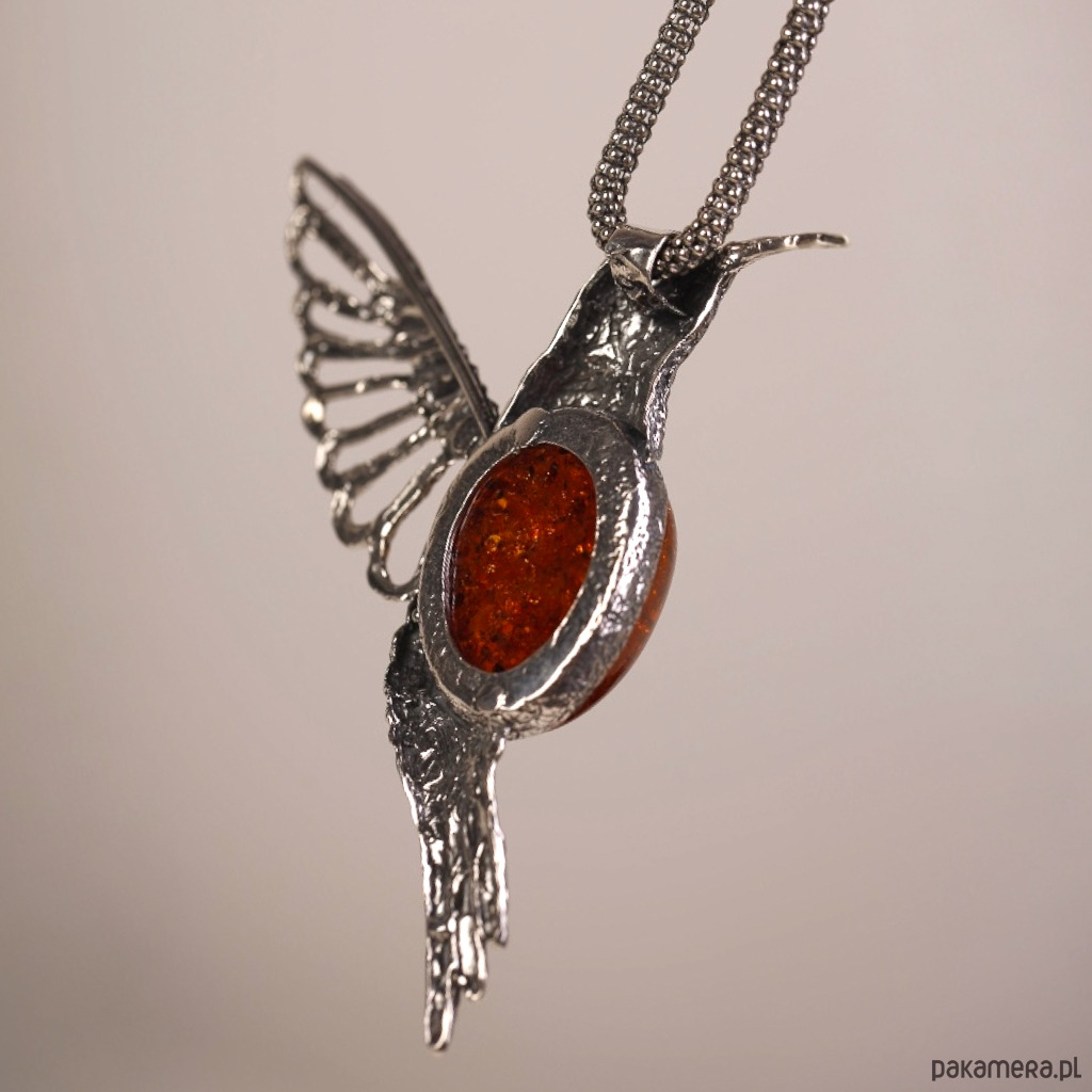 Duży wisior srebrny ptak z bursztynem koniakowym