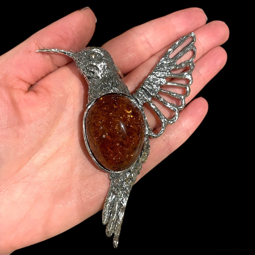 Duży, przyciągający wzrok wisior w kształcie ptaka, ręcznie wykonany ze srebra i ozdobiony bursztynem w intensywnym koniakowym odcieniu. Lśniący bursztyn pięknie odbija światło przy każdym ruchu, a dopracowane srebrne skrzydła nadają całości lekkości mimo wyrazistych rozmiarów. To biżuteria, która świetnie prezentuje się na prostych, ciemnych tkaninach i od razu staje się głównym akcentem stylizacji.