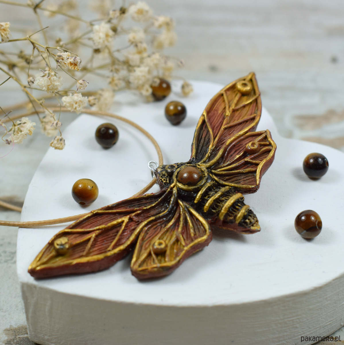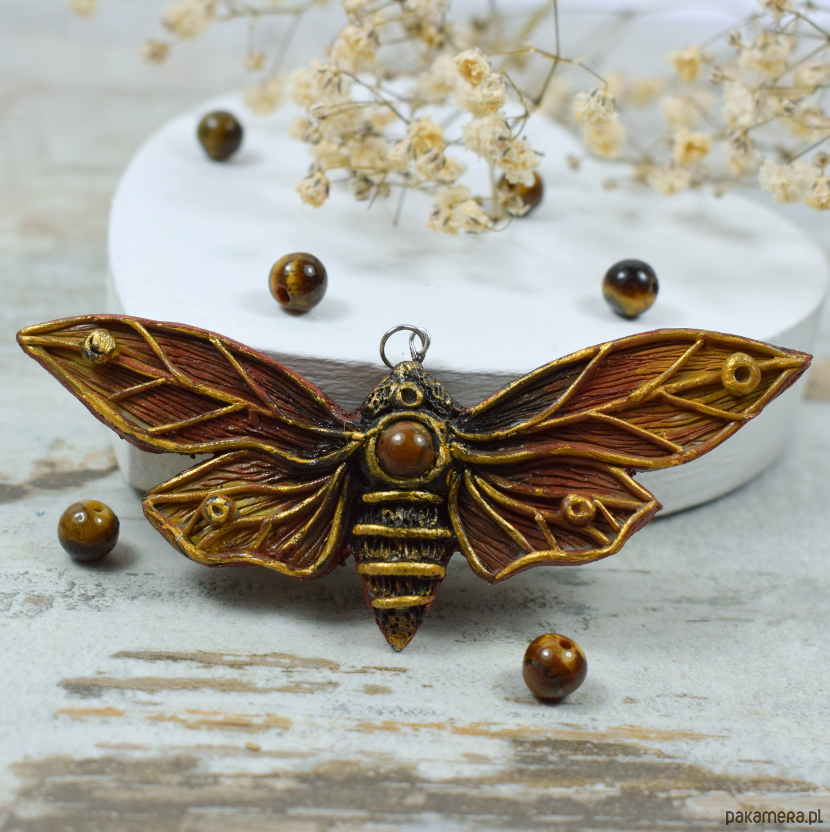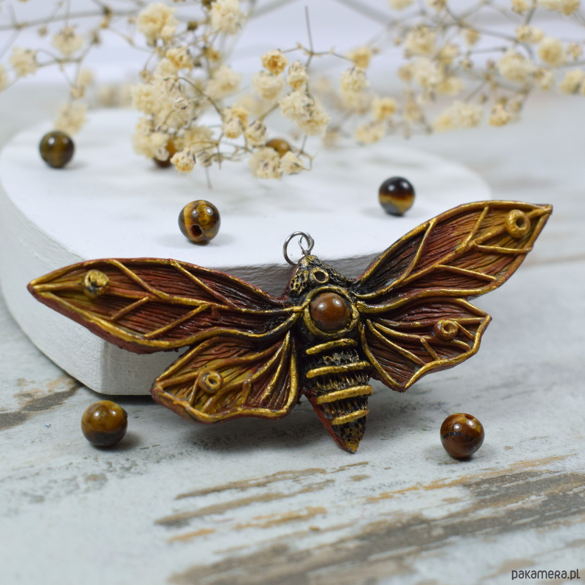 Duży, przyciągający uwagę wisior motyl w odcieniach brązów i złota. W jego centrum znajduje się zatopiona kulka tygrysiego oka. Oryginalny dodatek dla miłośniczek natury oraz niebanalnych dodatków.
