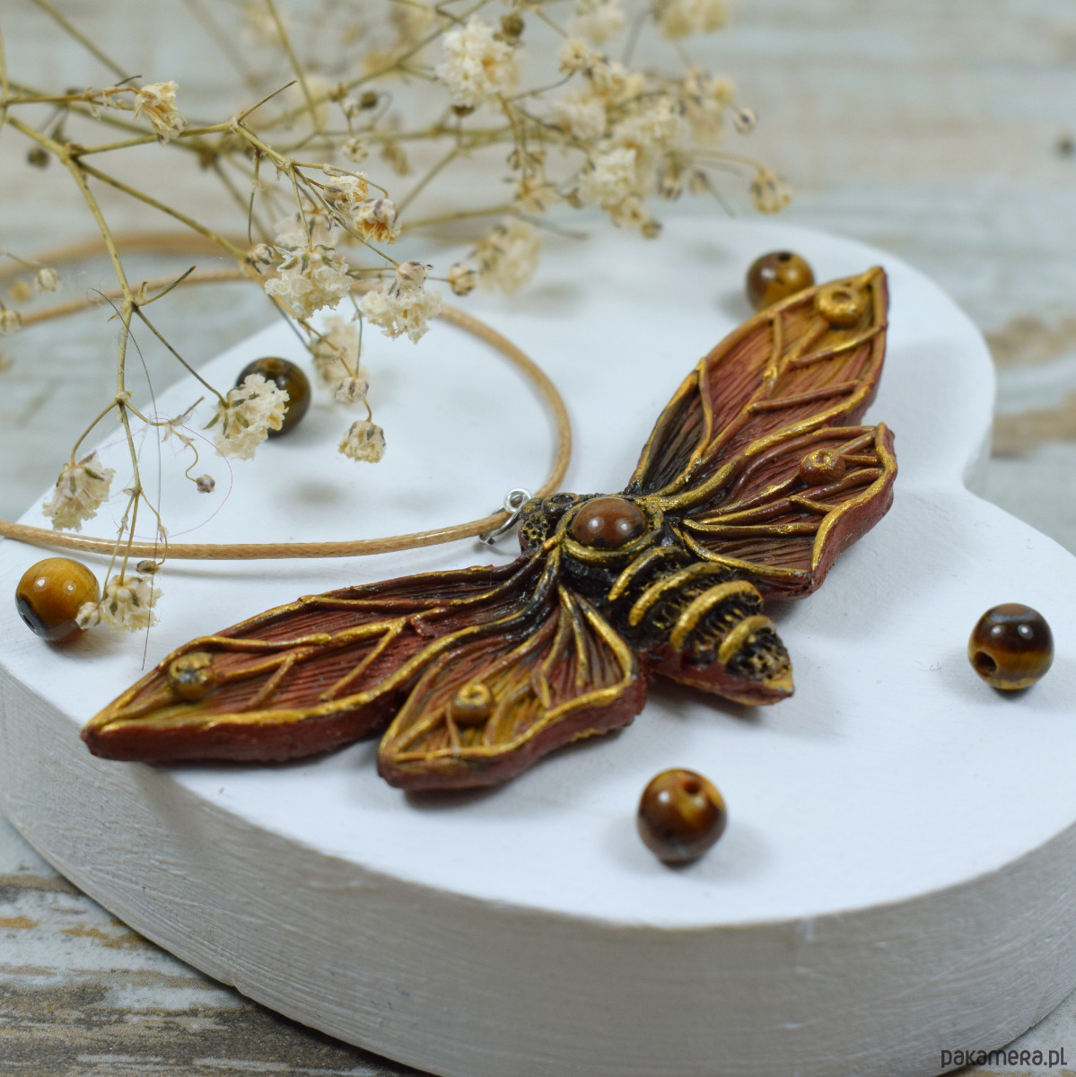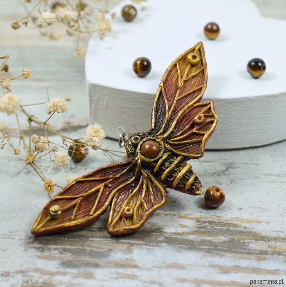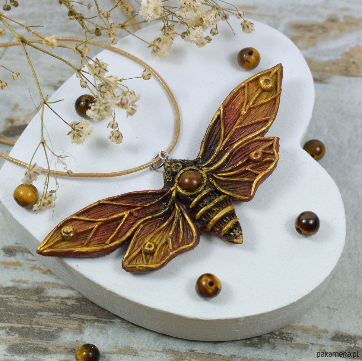 Duży, przyciągający uwagę wisior motyl w odcieniach brązów i złota. W jego centrum znajduje się zatopiona kulka tygrysiego oka. Oryginalny dodatek dla miłośniczek natury oraz niebanalnych dodatków.