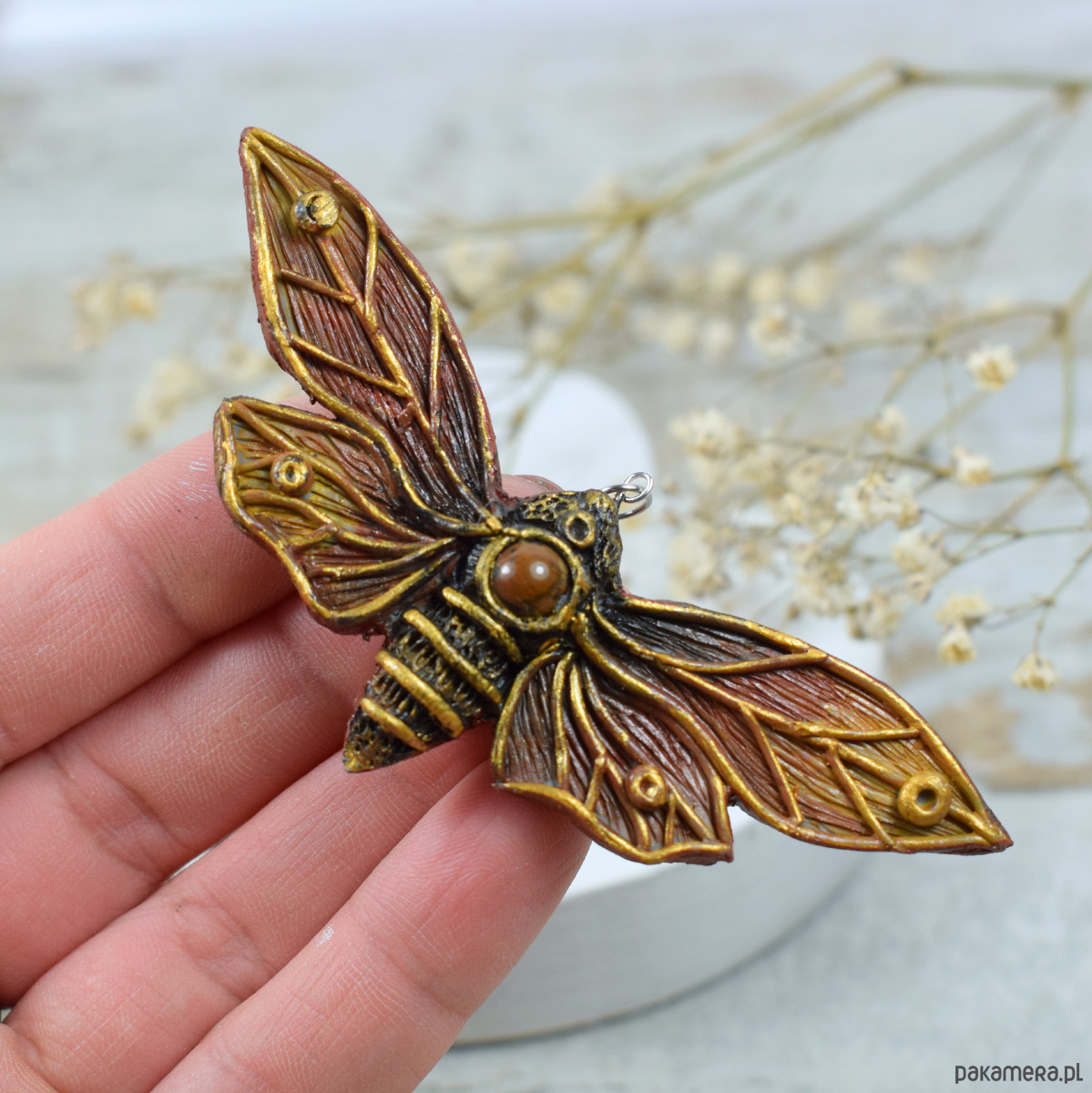 Wisior został wykonany w całości ręcznie, według autorskiego projektu. Materiał, z którego jest stworzony to profesjonalna, najwyższej jakości glinka polimerowa, ręcznie rzeźbiona, wypalona, malowana i lakierowana. Biżuteria z glinki polimerowej cechuje się bardzo dużą trwałością (nie kruszy się, jest odporna na łamanie) , jest też lekka i wygodna w noszeniu.