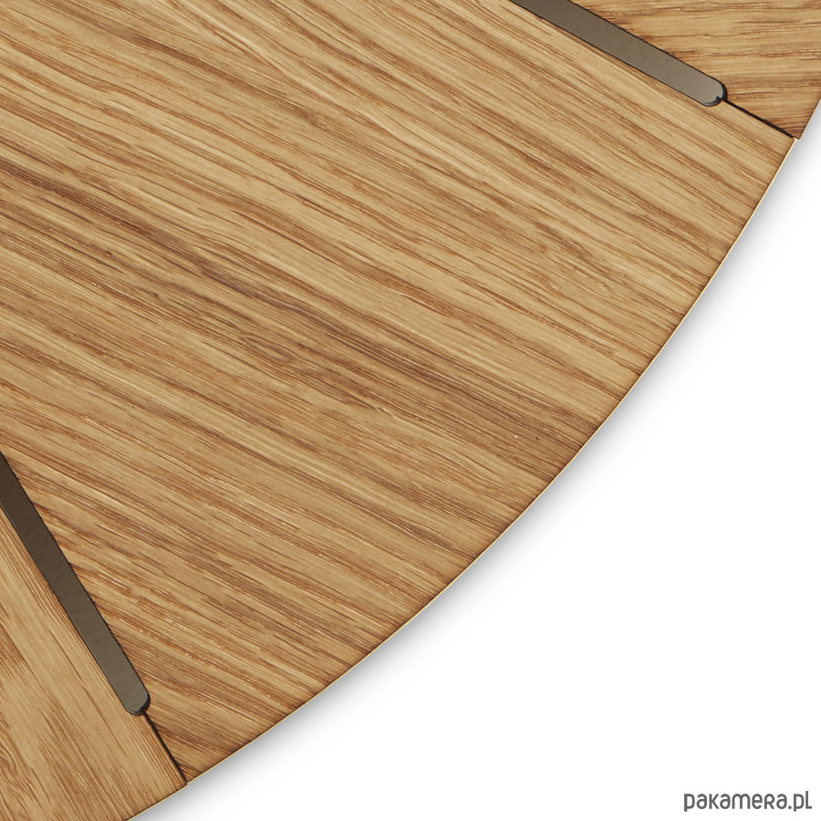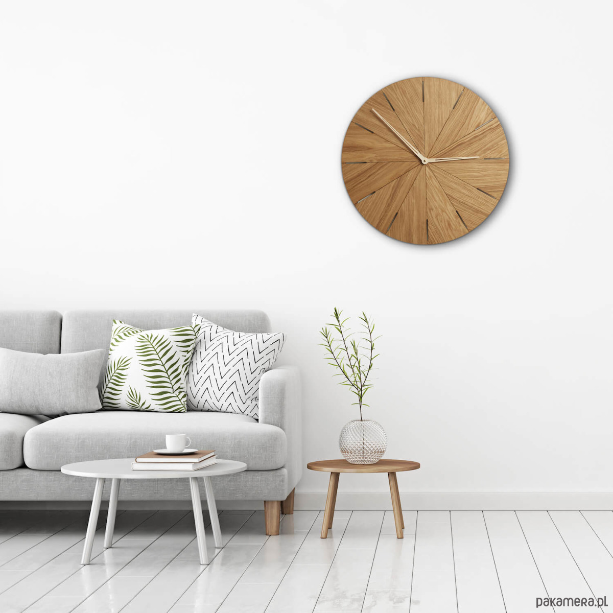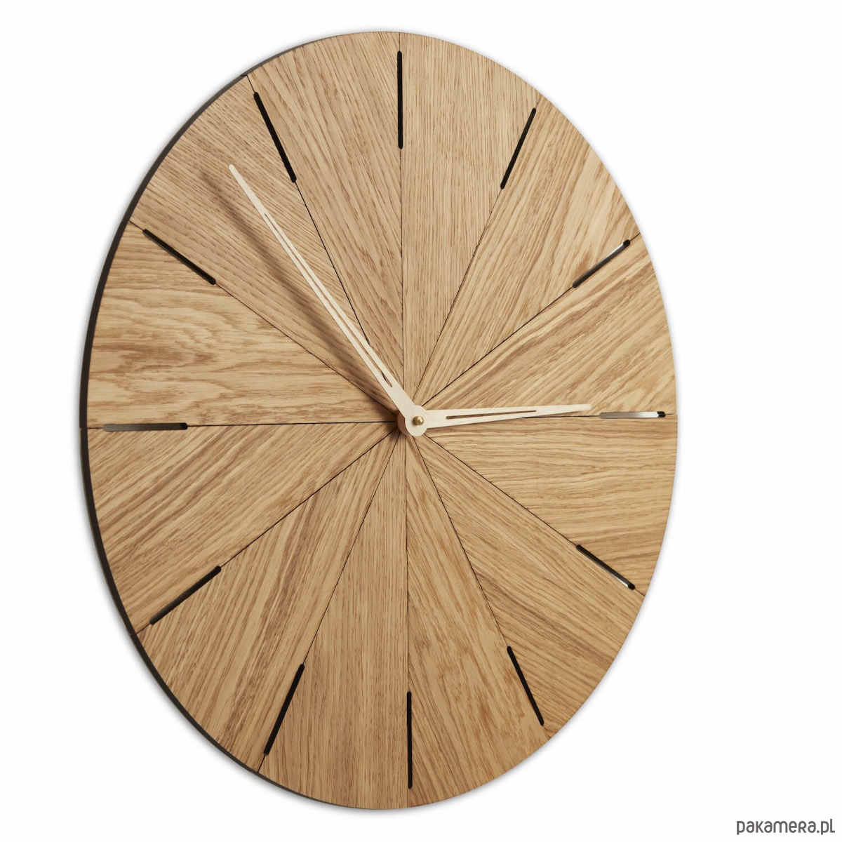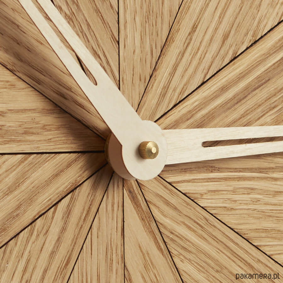 Unikalny zegar ścienny. Minimalistyczny design. Tarcza zegara podzielona jest na dwanaście części przy czym ułożenie słojów drewna na każdej części jest w innym kierunku. Nadaje to zegarowi subtelny dynamiczny charakter. Godziny są oznaczone wąskimi szczelinami. Specjalnie zaprojektowane smukłe wskazówki wykonane są ze sklejki i dostępne są dwóch kolorach: naturalnej brzozy lub ciemnobrązowym.