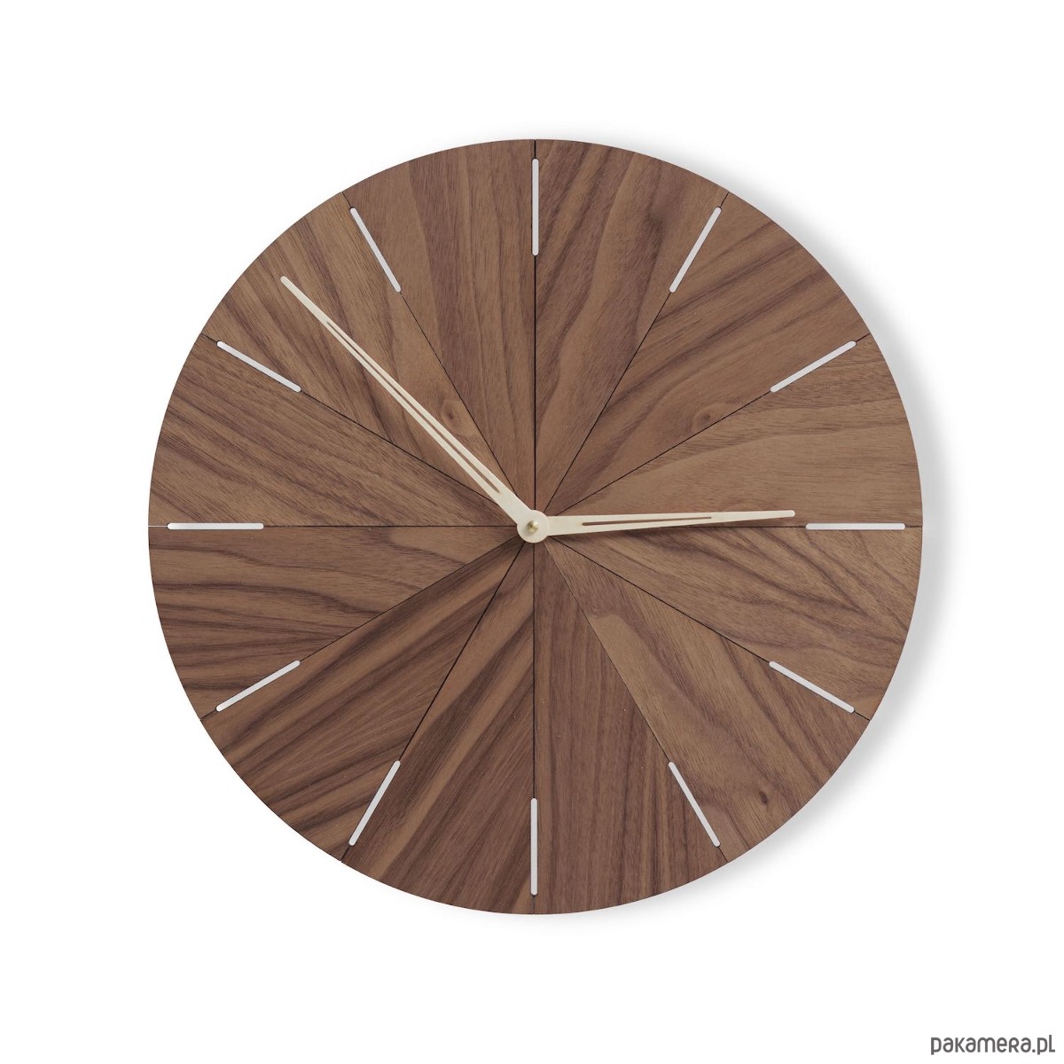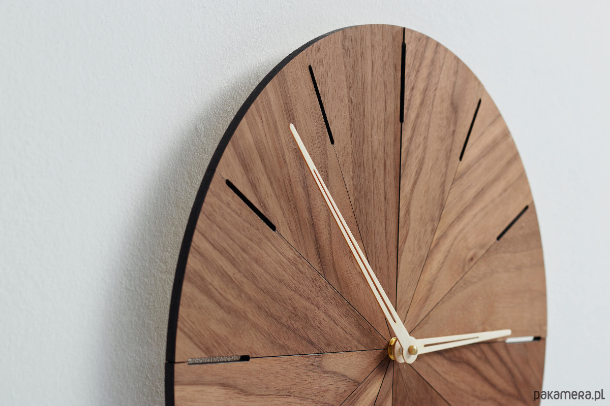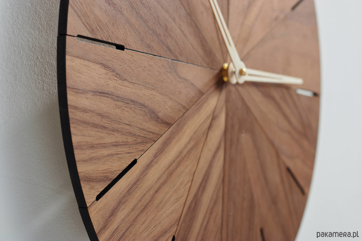 Unikalny zegar ścienny. Minimalistyczny design. Tarcza zegara podzielona jest na dwanaście części przy czym ułożenie słojów drewna na każdej części jest w innym kierunku. Nadaje to zegarowi subtelny dynamiczny charakter. Godziny są oznaczone wąskimi szczelinami. Specjalnie zaprojektowane smukłe wskazówki wykonane są ze sklejki i dostępne są dwóch kolorach: naturalnej brzozy lub ciemnobrązowym.