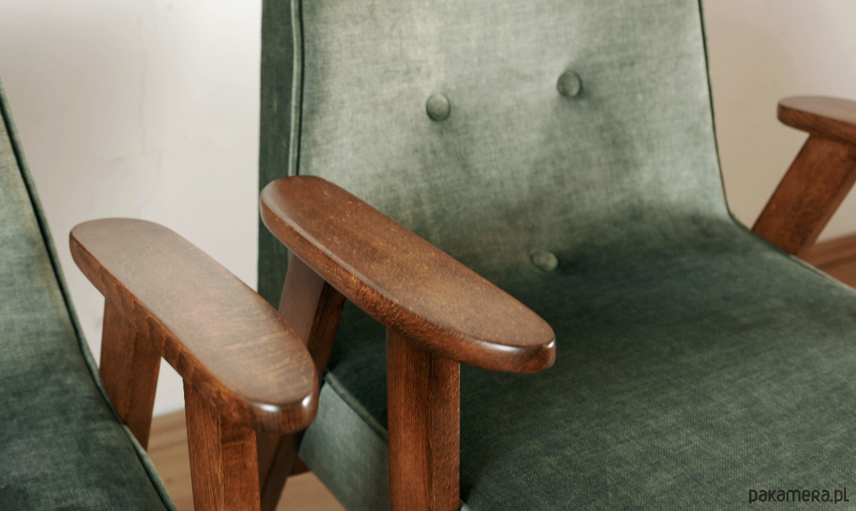Fotele są po gruntownej renowacji tapicersko-stolarskiej. Wykonany z drewna bukowego. Drewniany stelaż został gruntownie oczyszczony wybarwiony i zabezpieczony kilkoma warstwami lakieru w półmacie.