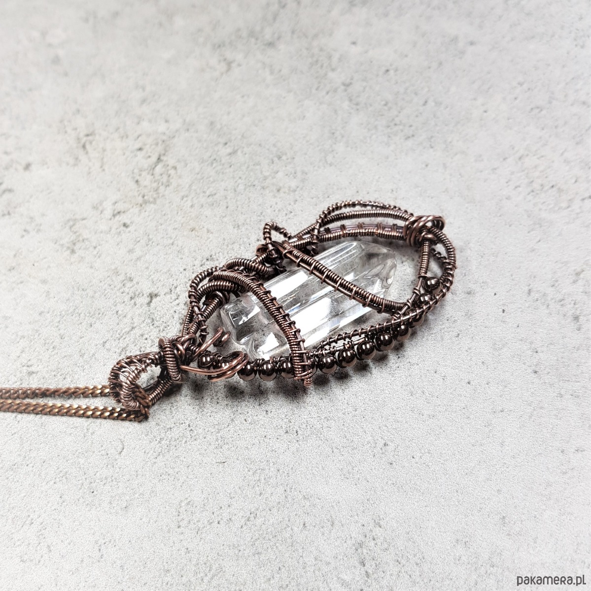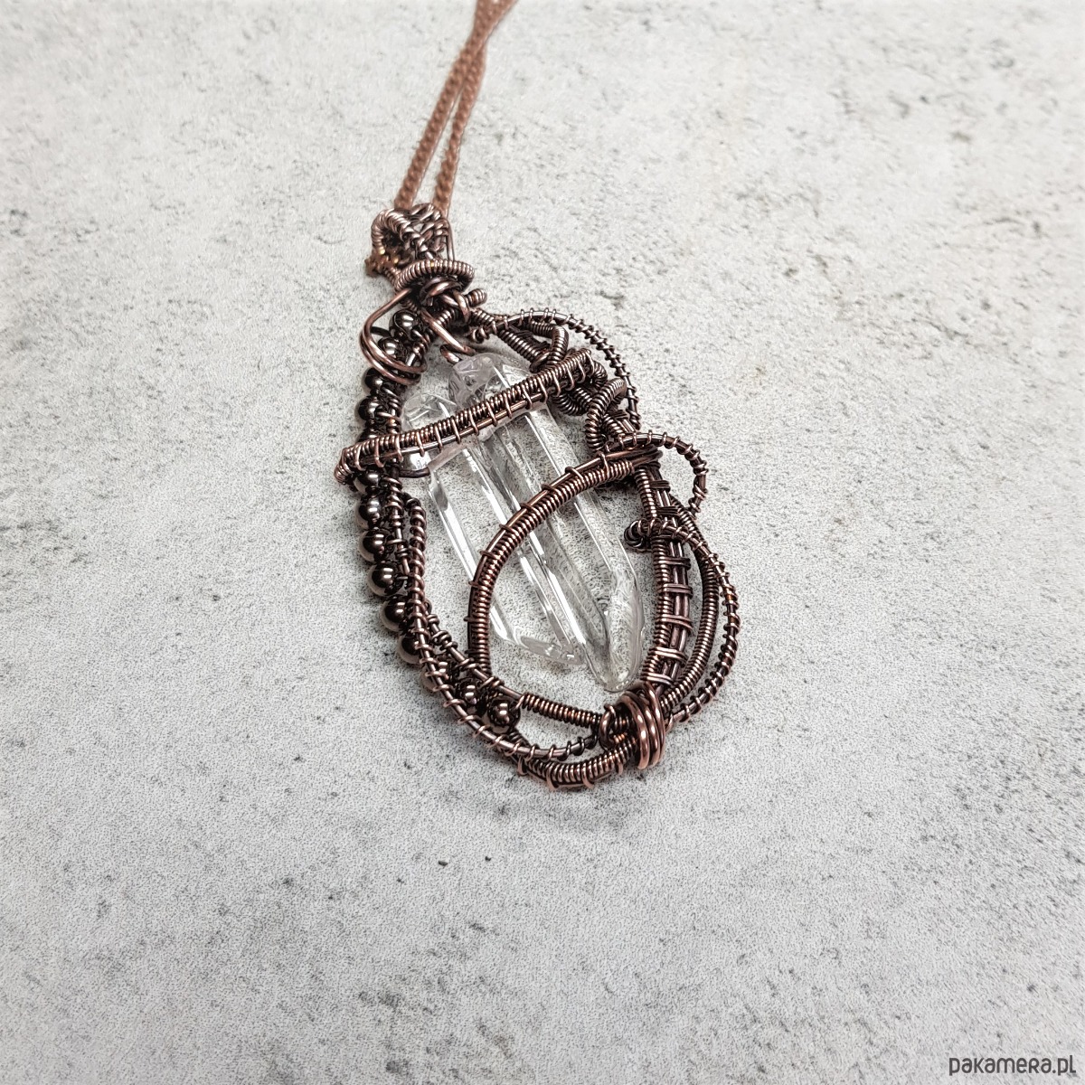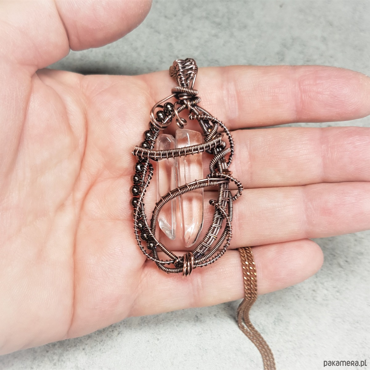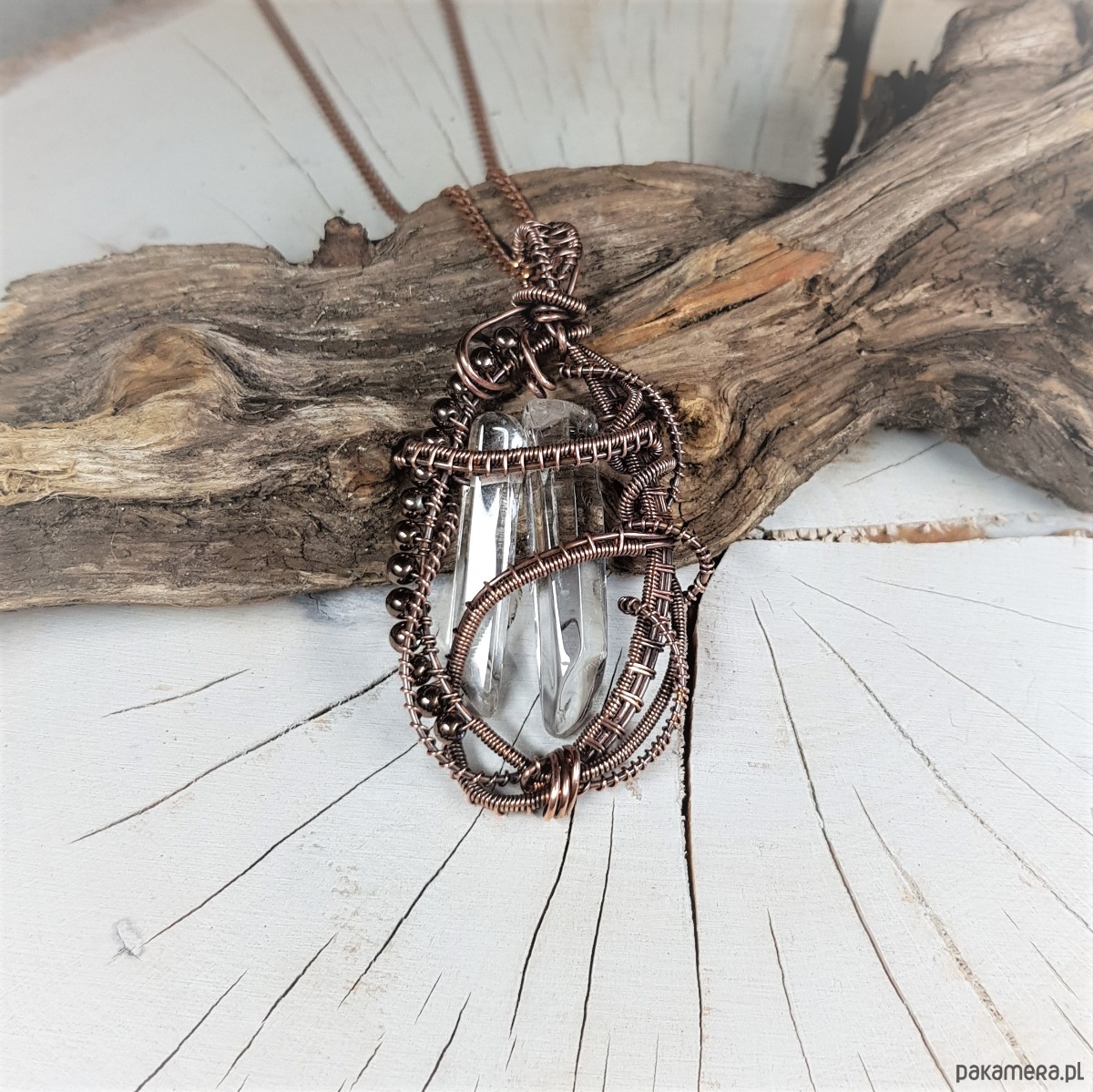 Wisior zrobiony ręcznie w miedzi pracochłonną techniką wire-wrappingu którego głównym elementem są dwa sople kryształów górskich. Wymiary zawieszki