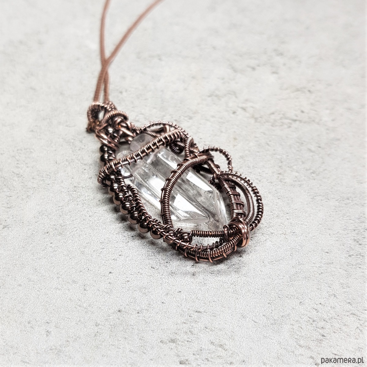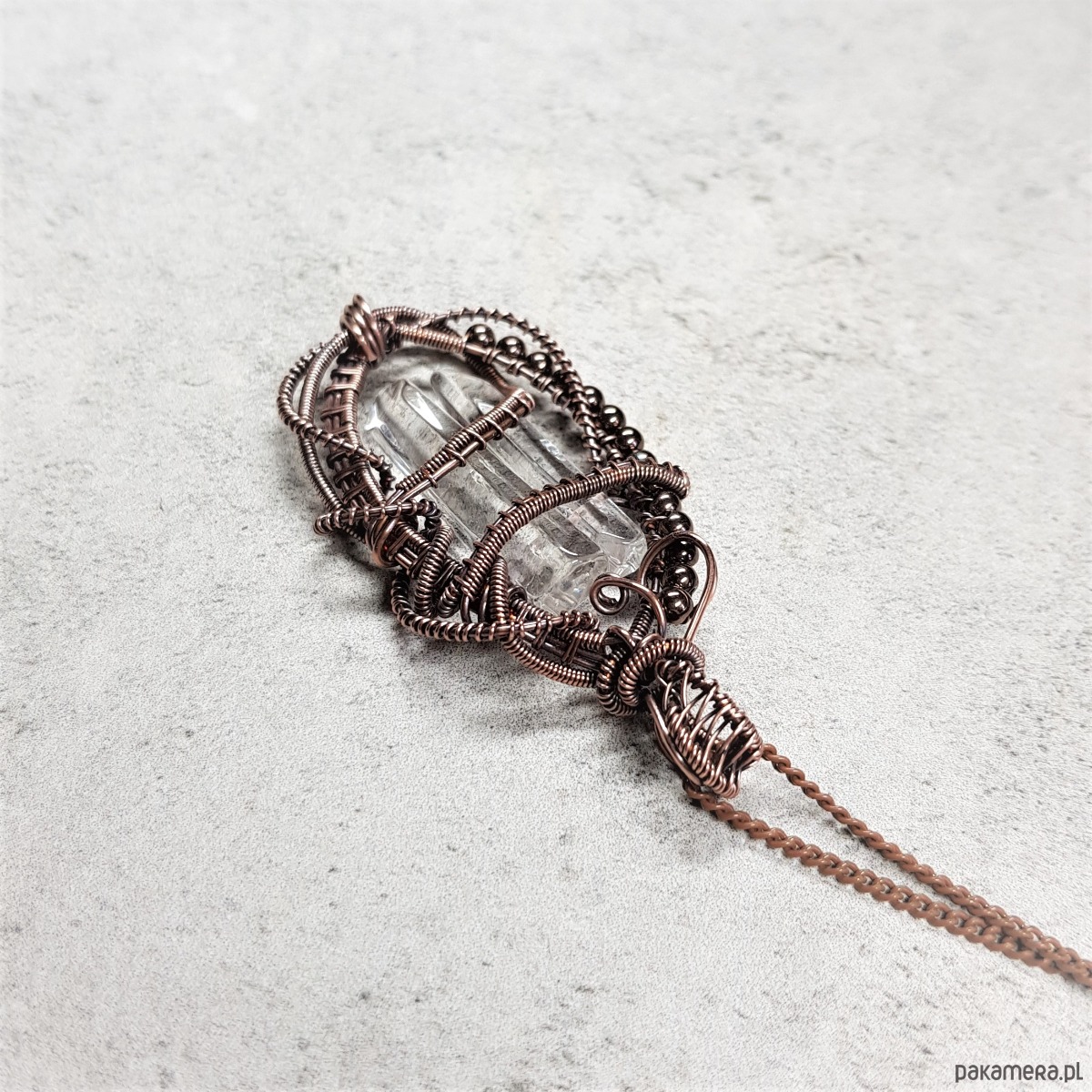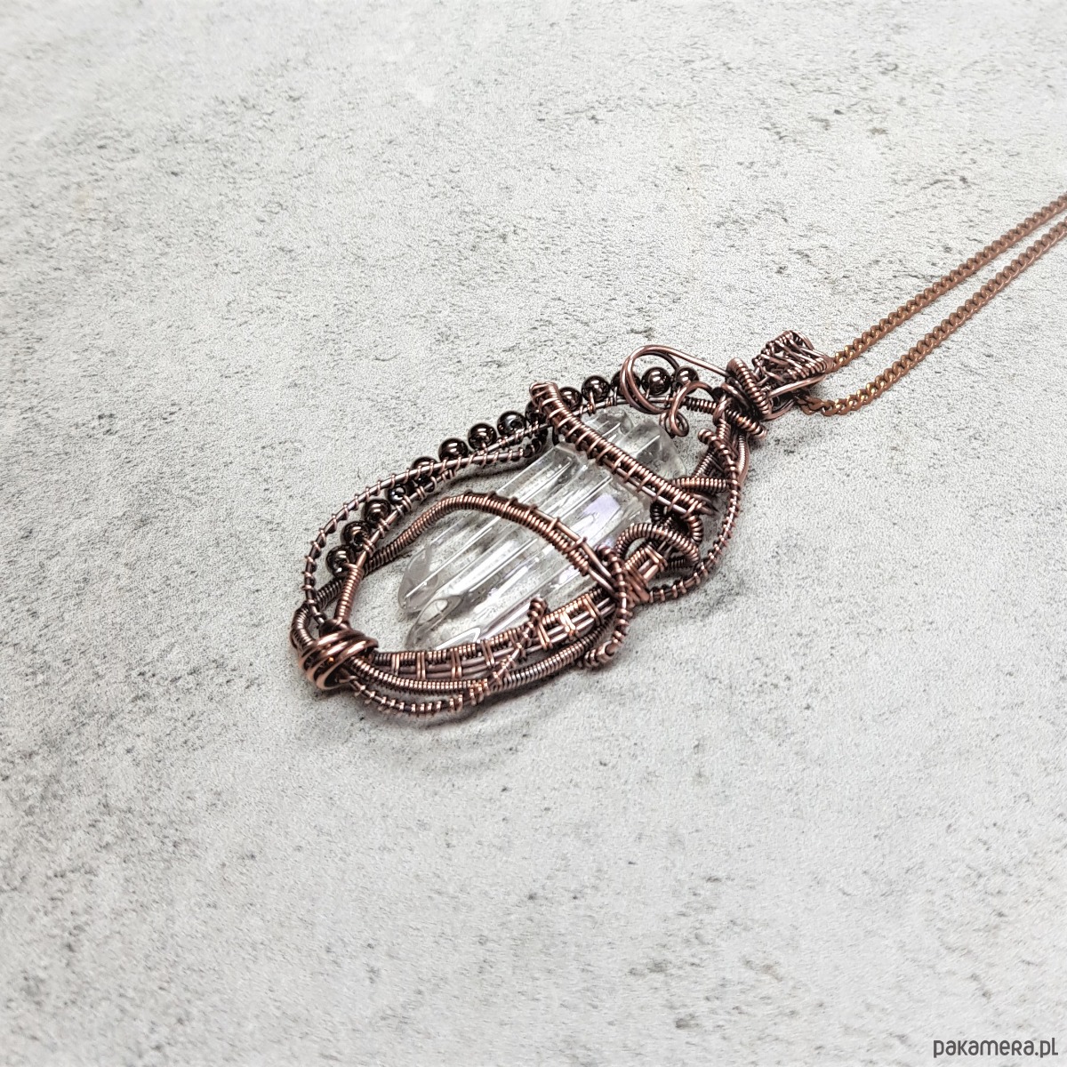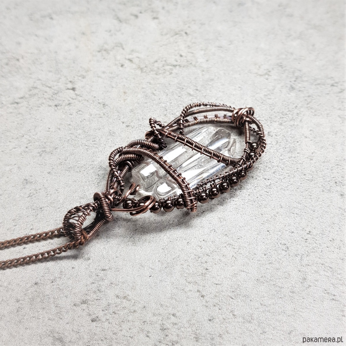 Wisior zrobiony ręcznie w miedzi pracochłonną techniką wire-wrappingu którego głównym elementem są dwa sople kryształów górskich. Wymiary zawieszki