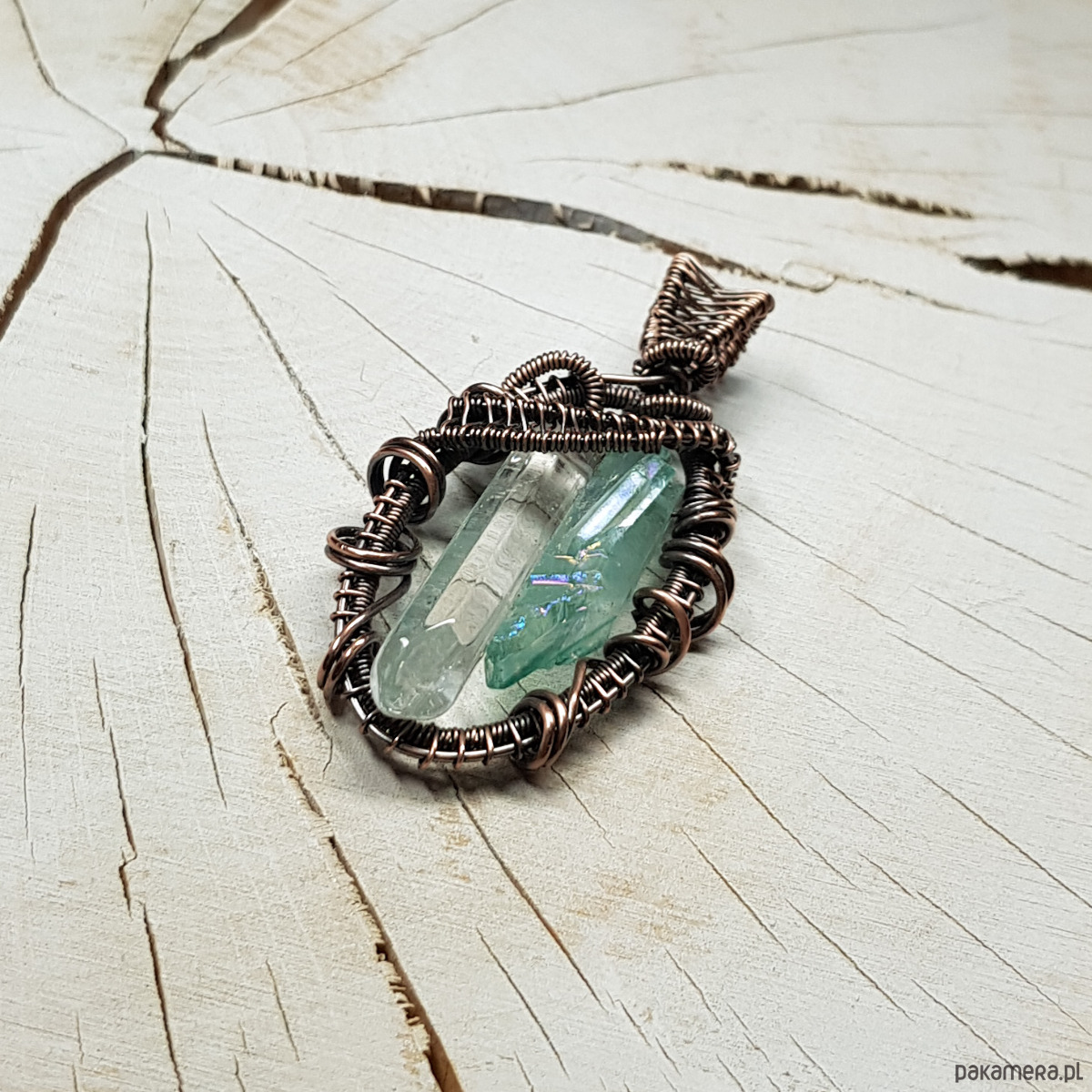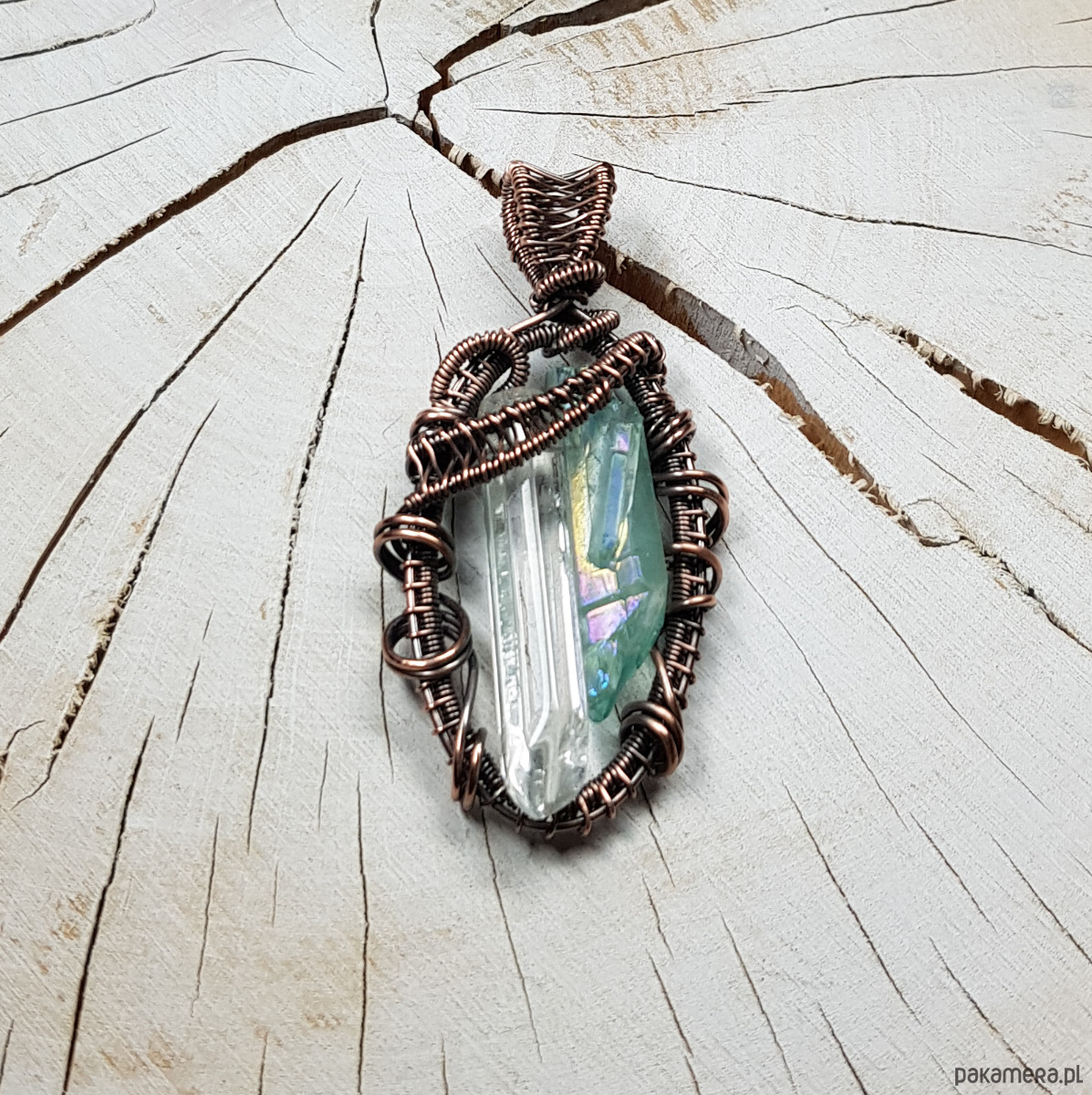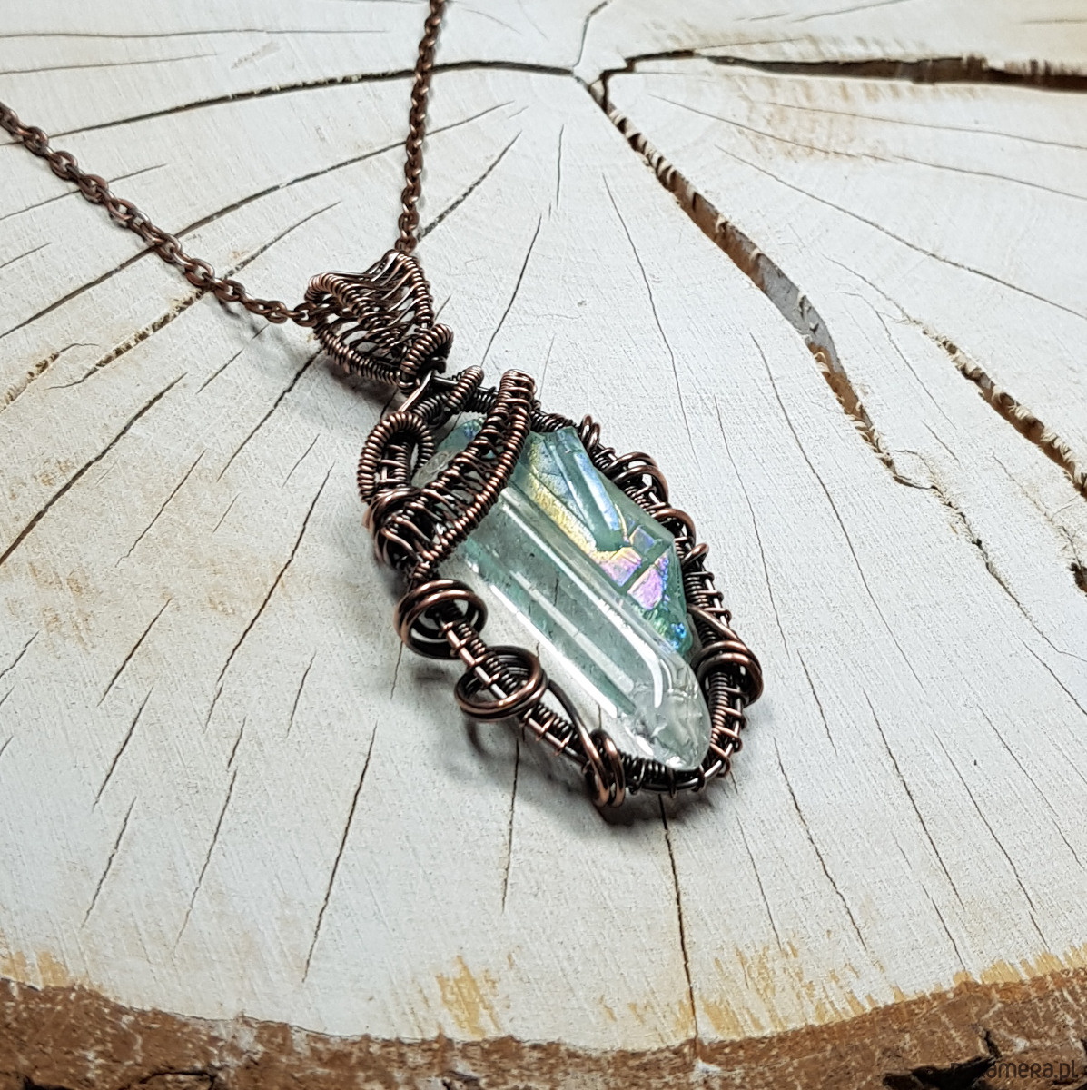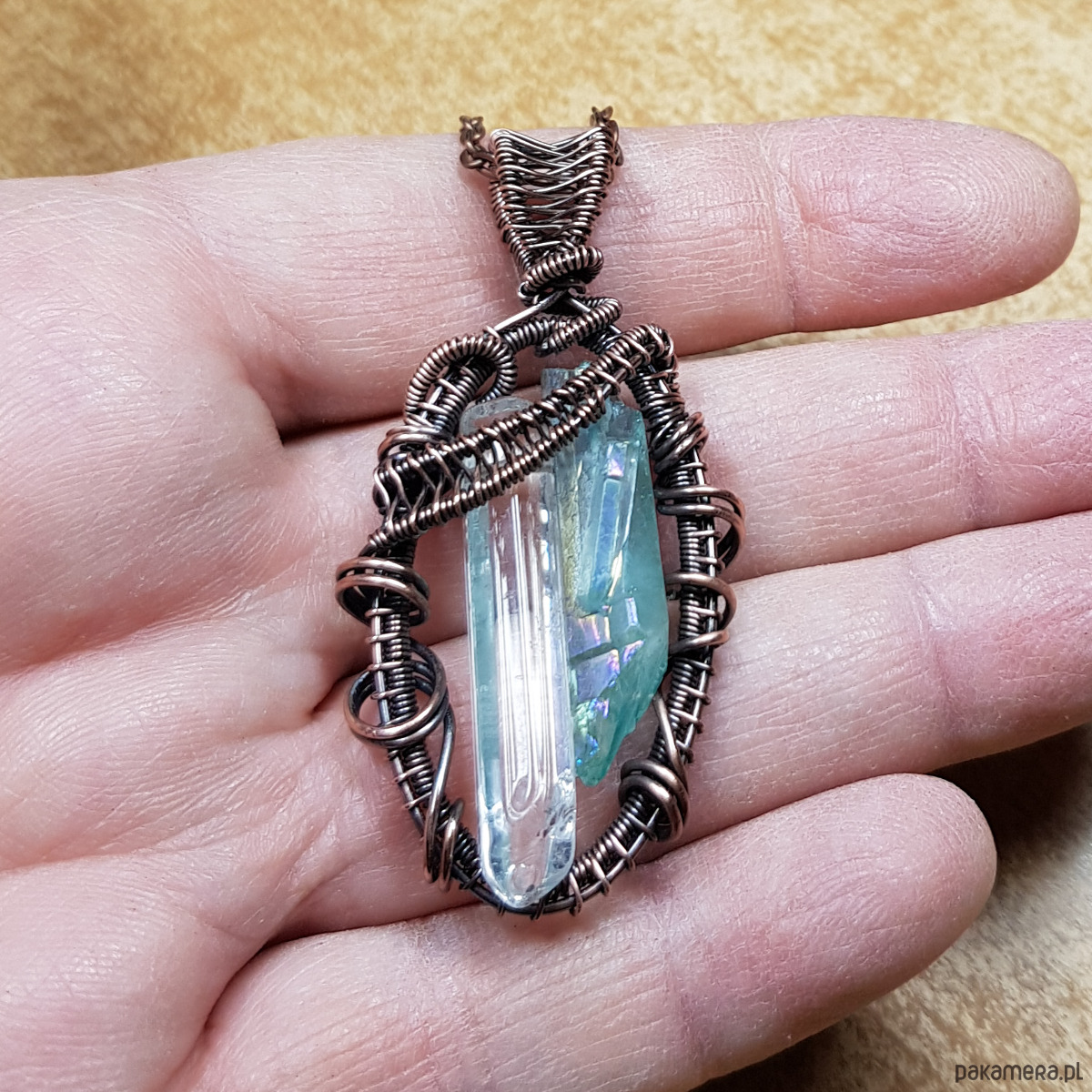 Zawieszka wykonana ręcznie metodą wire-wrappingu z dwóch sopli kryształu górskiego. Jeden kryształ naturalny, drugi to jasno błękitny kryształ aura zwany anielskim dzięki delikatnej poświacie mieniącej się cudownym blaskiem we wszystkich kolorach tęczy, przywodzącym na myśl anielskie skrzydła . Do wykonania wisiorka użyłam miedzianego drutu który następnie przyciemniłam oksydą i wypolerowałam w celu uzyskania efektu szlachetnego postarzenia . Zawieszka ma wymiary 54x25mm. Na życzenie bezpłatnie mogę dołączyć łańcuszek długości około 48-50 cm lub innej .